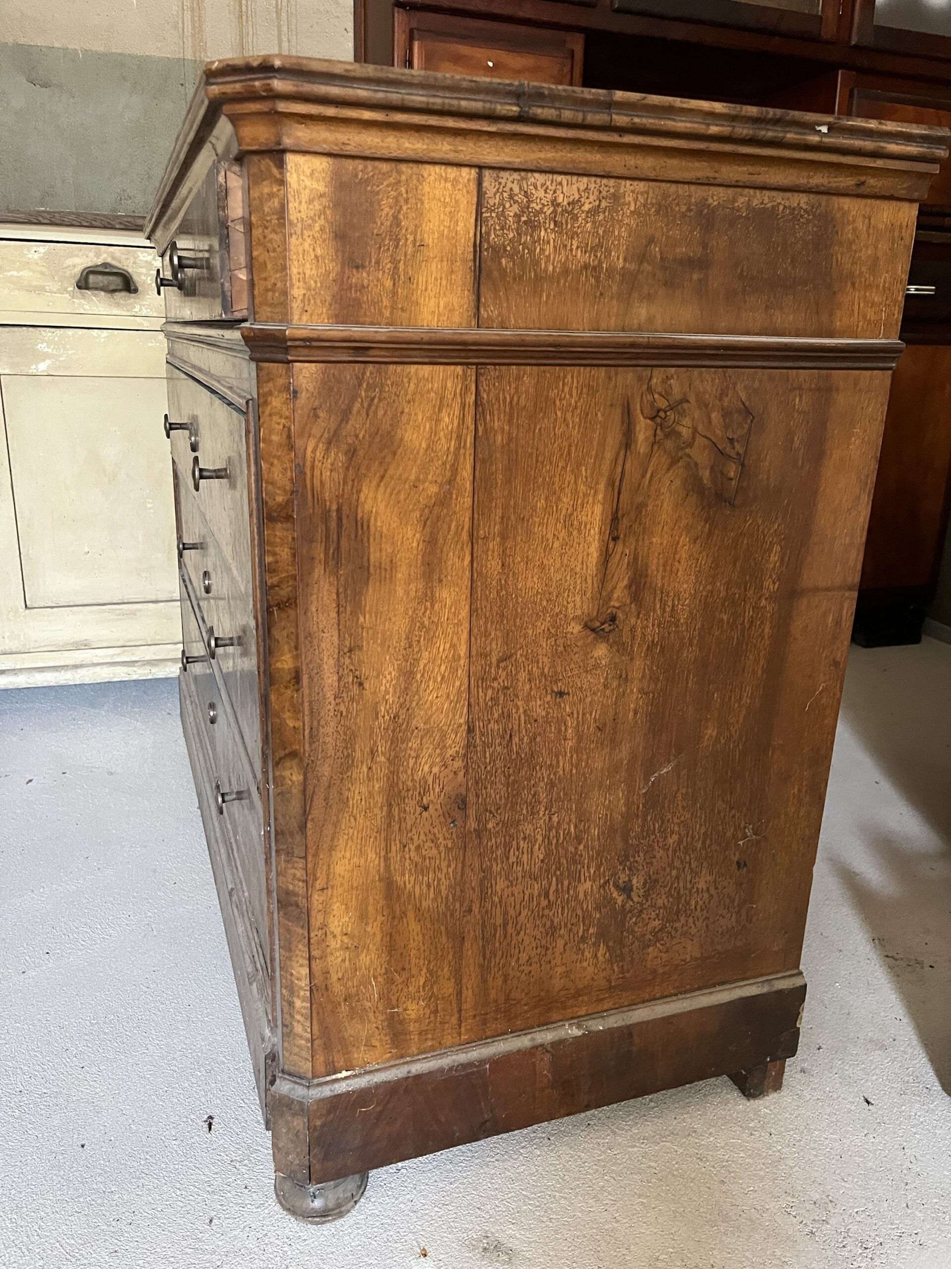 Commode à tiroirs en plaquage, actuellement disponible à la rénovation dans notre atelier.\n\nÉlégante et fonctionnelle, elle pourra être entièrement personnalisée : peinture, patine, teinte du bois, changement de poignées ou finitions particulières, afin de s’adapter parfaitement à votre intérieur.\n\nLe tarif affiché est indicatif et sera ajusté en fonction des choix de personnalisation.\n\nUn meuble intemporel, prêt à retrouver toute sa place avec une nouvelle allure.\n\n124/p56/h94