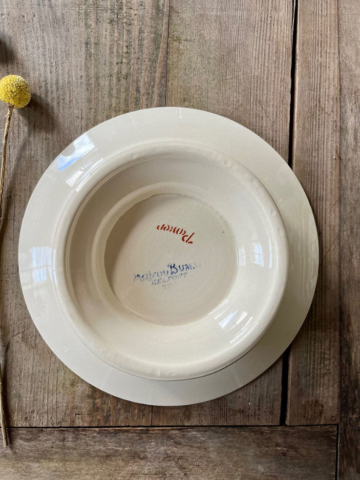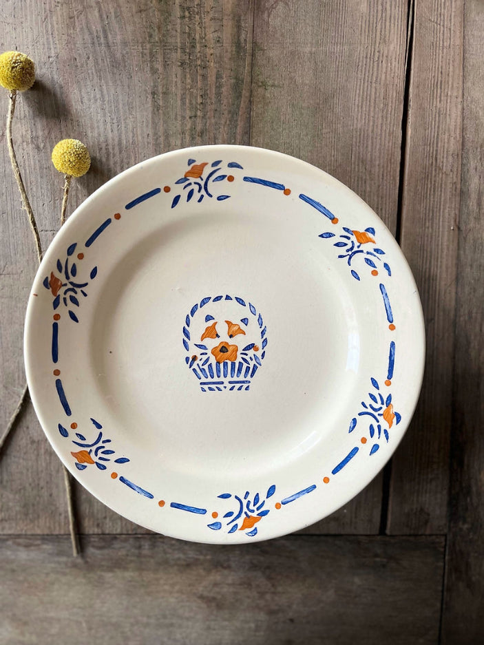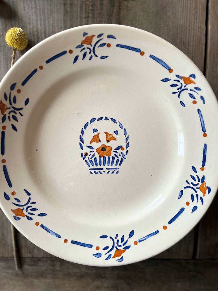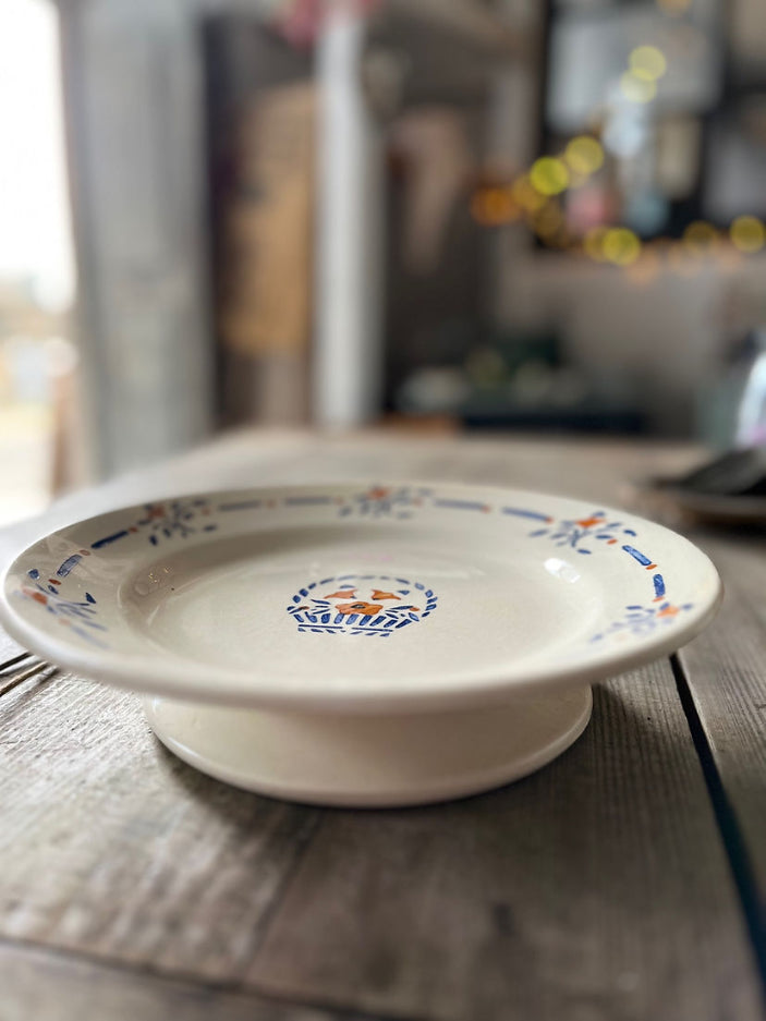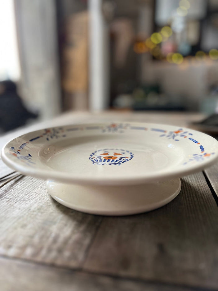Compotier / Plat à gâteau terre de fer avec motifs peint. Plat de la manufacture Longchamp. Diamètre 24cm/ hauteur 5,5cm