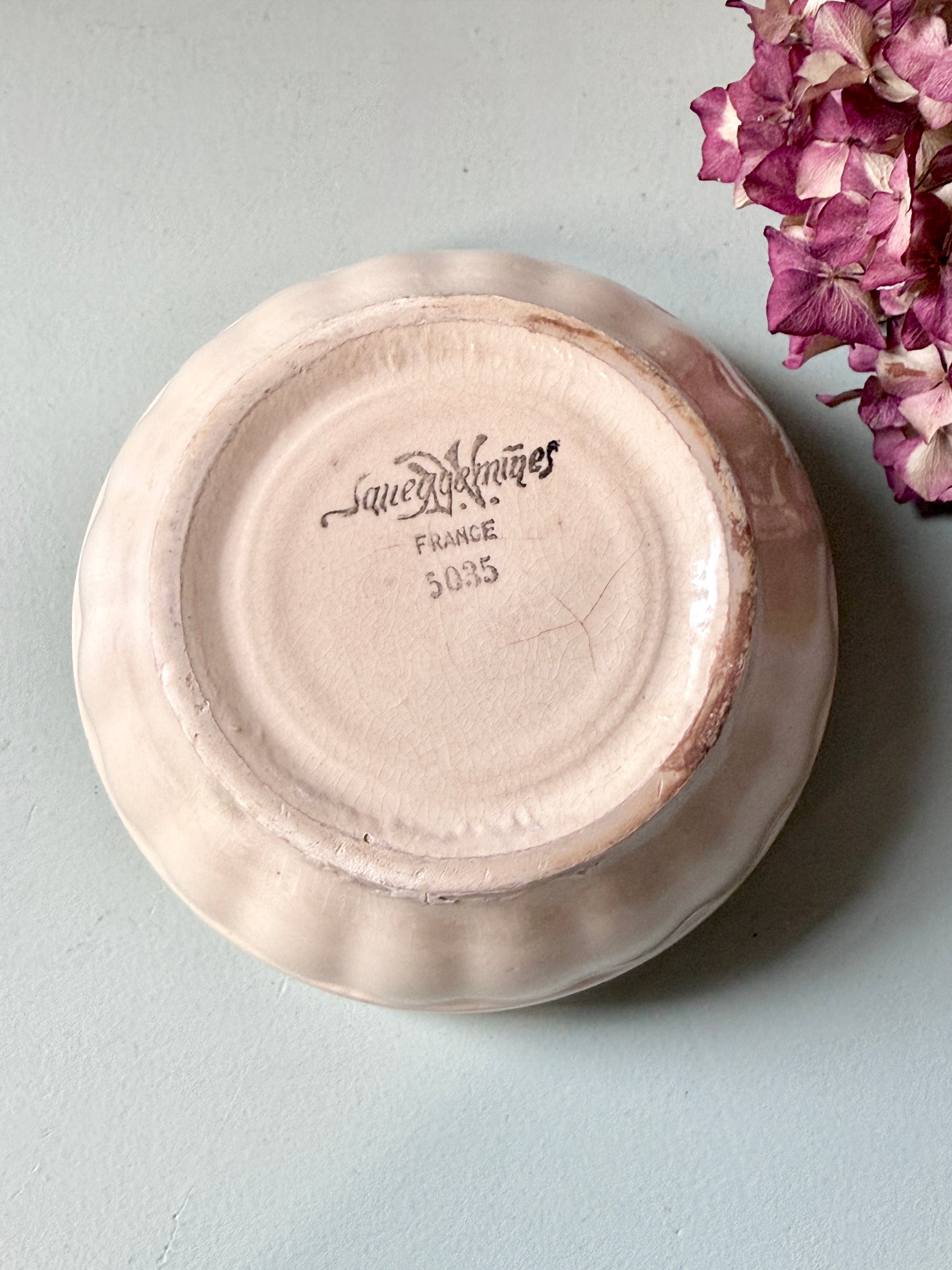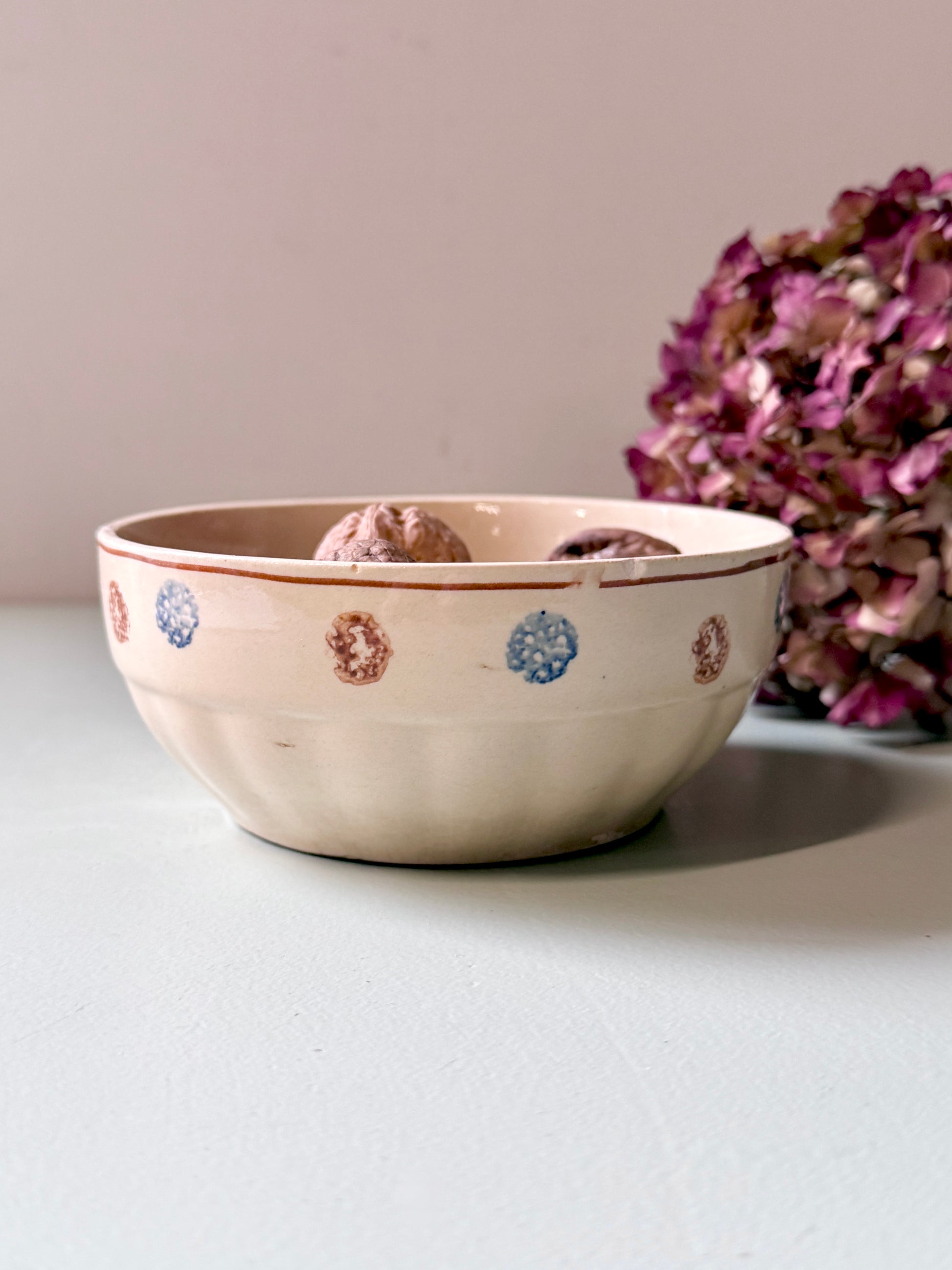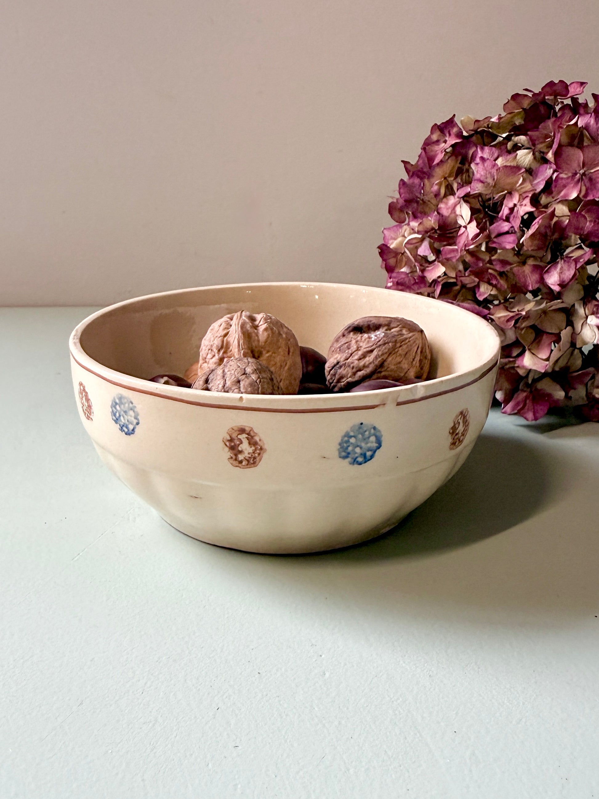 Bol ancien en faïence Sarreguemines, au décor de petites pastilles bleu et brun et souligné d’un filet brun sur le bord. Son format bas et large le rend idéal pour les desserts, les fruits secs ou l’apéritif. La patine, les traces d’usure et le petit impact sur le pourtour font partie de son histoire et lui donnent ce côté authentique que l’on aime dans la vaisselle ancienne. Parfait pour une table du quotidien ou à mixer avec d’autres pièces Sarreguemines pour une ambiance brocante pleine de charme.