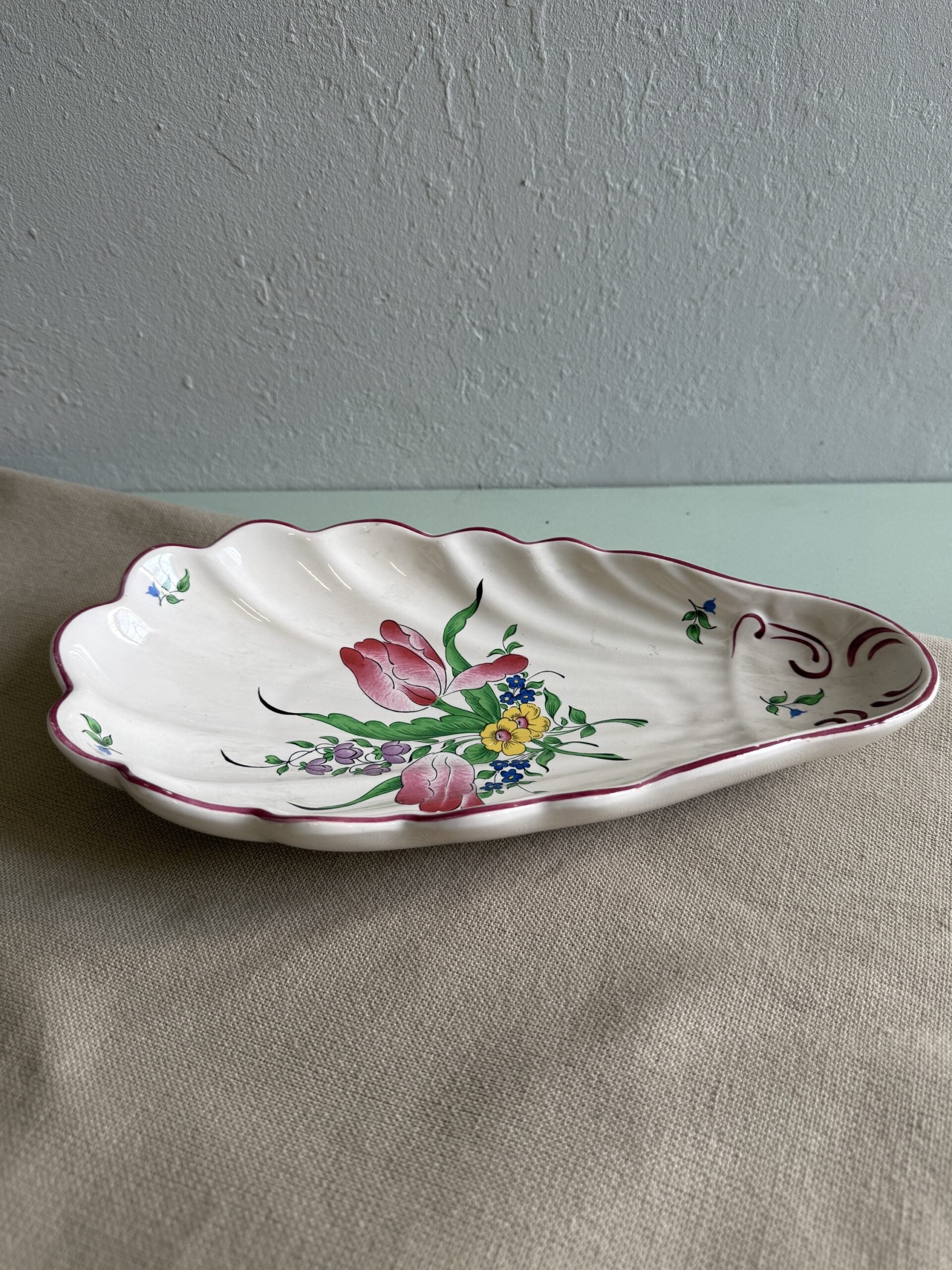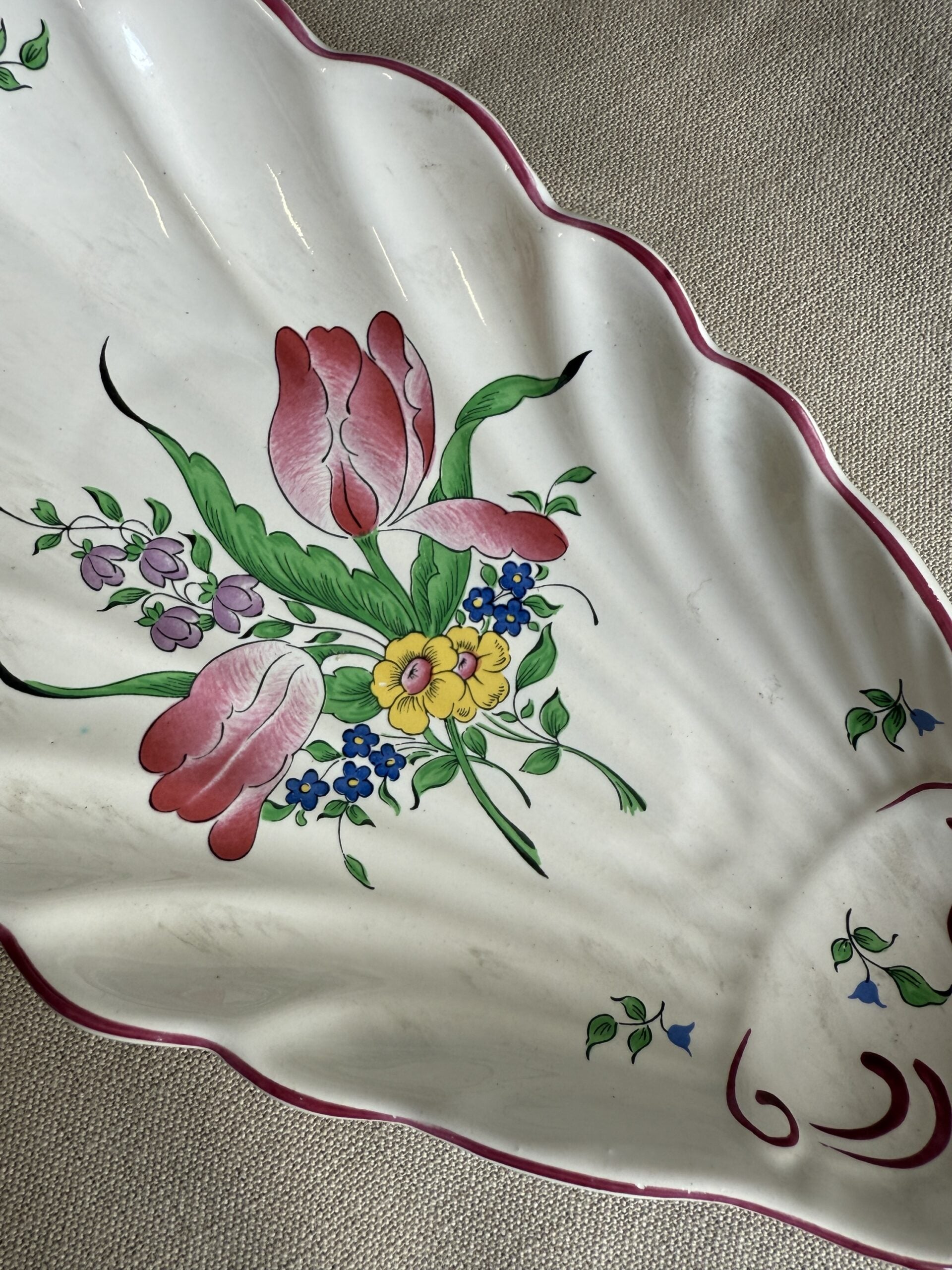 Coupelle ou ravier en faïence de Lunéville, en forme de coquillage. Son décor floral et sa forme originale en font une pièce décorative et pratique unique.