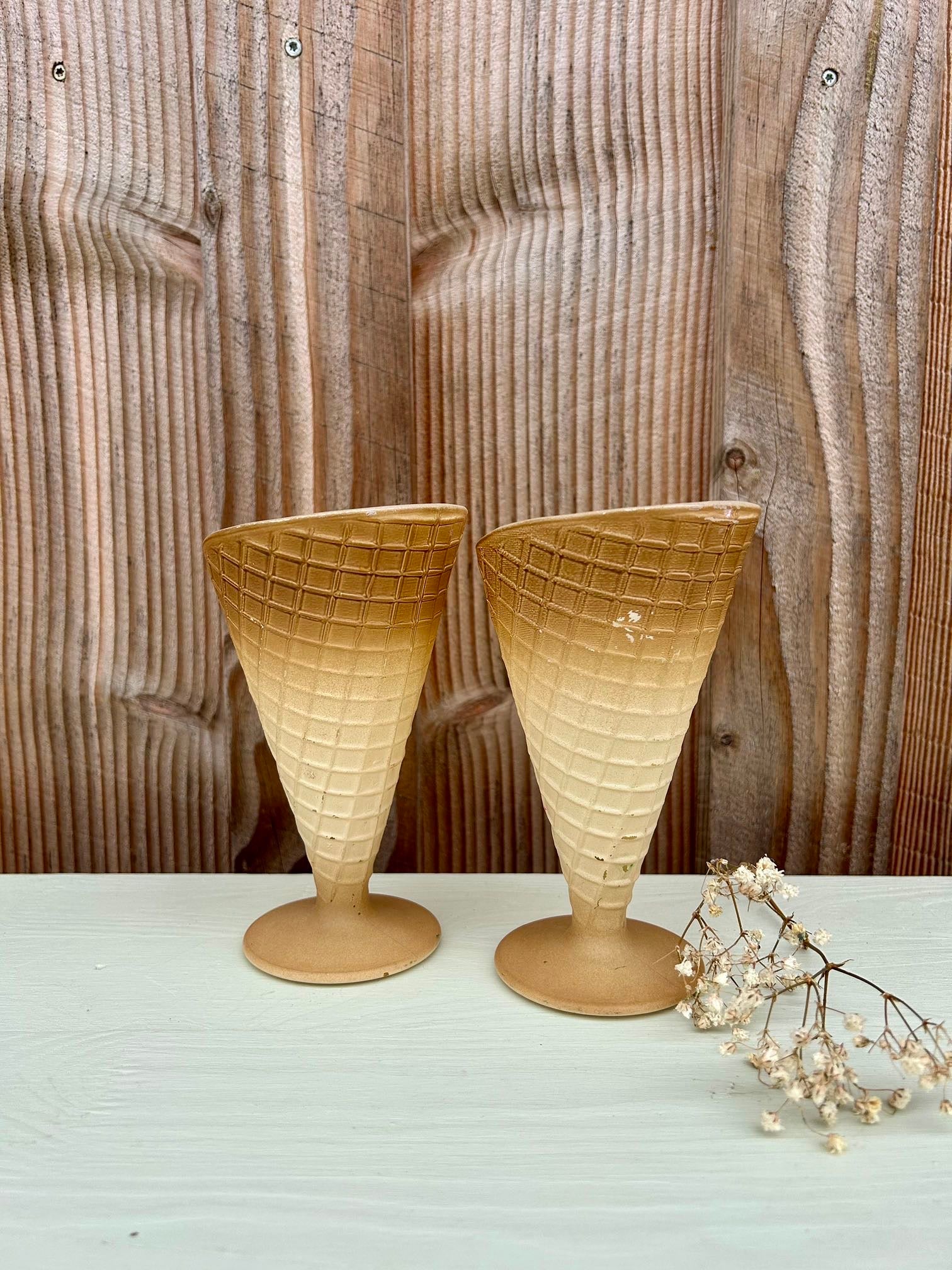 C'est le duo parfait pour apporter un air de vacances et de "dolce vita" à votre table ! Ces coupes en forme de cornets de glace sont de véritables pépites vintage. On adore le travail du relief qui imite la gaufrette et ce dégradé de couleurs si caractéristique des productions italiennes de l'époque.