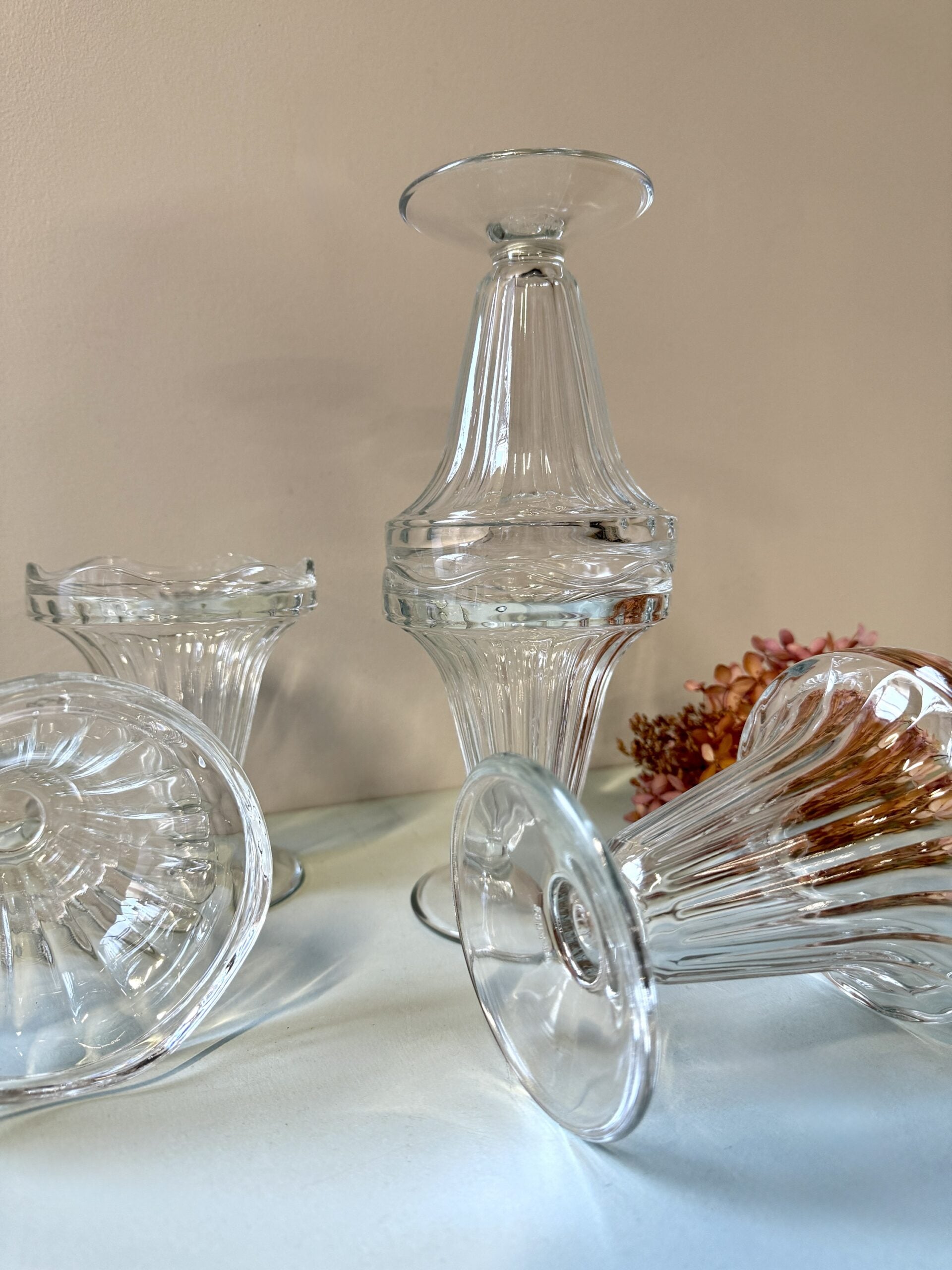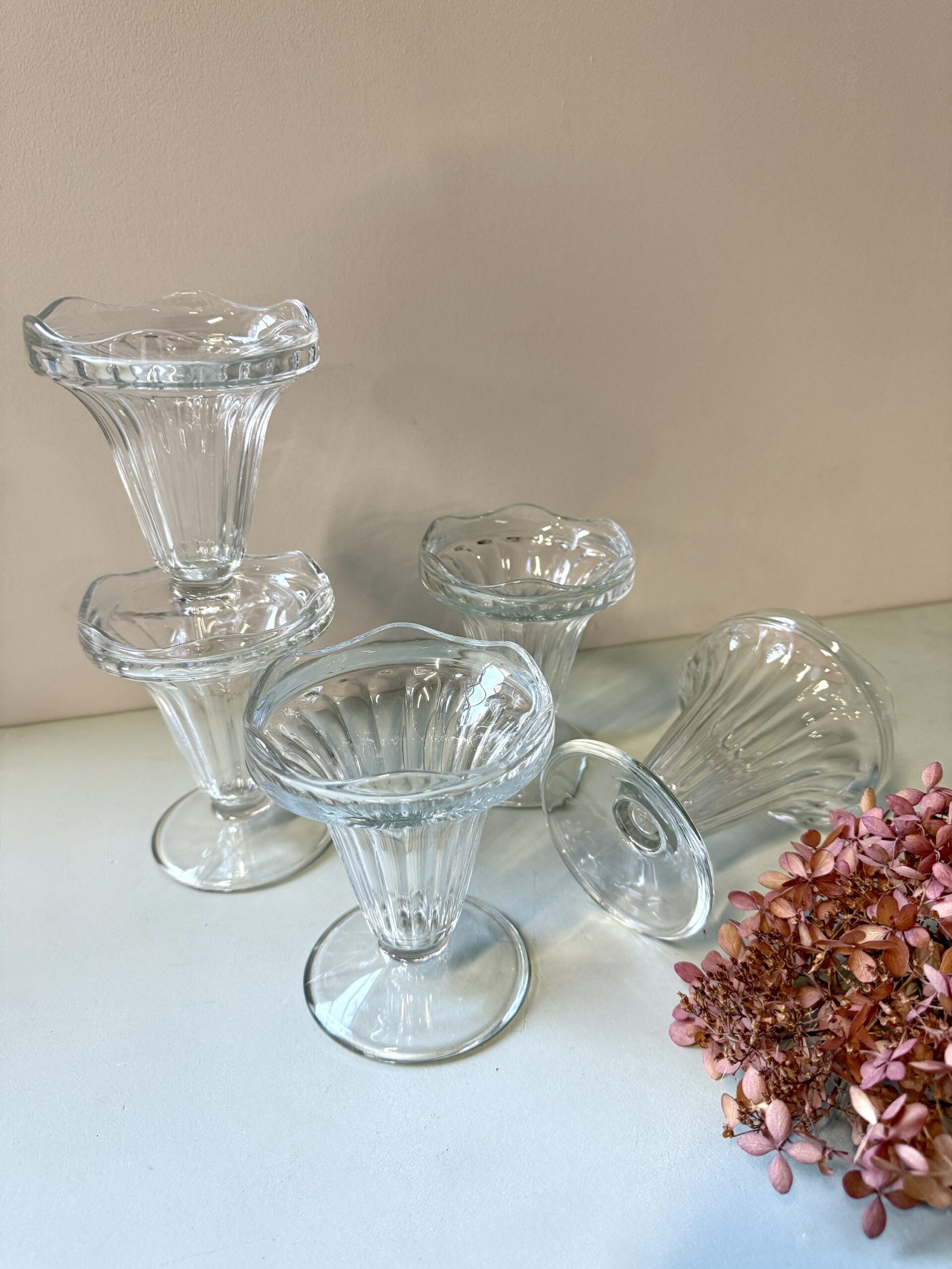 Coupes à glace vintage en verre moulé vendues en lot de 5. Leur silhouette rétro façon diner américain donne tout de suite une ambiance joyeuse à la table. Et si une petite envie de glace pointe le bout de son nez… disons qu’on a exactement ce qu’il faut pour te servir.Ces coupes en verre moulé affichent un joli relief vertical et un bol évasé typique des modèles servis dans les diners américains. Idéales pour des glaces, de fruits ou de milkshakes maison. Une touche rétro simple, efficace… et un brin nostalgique.