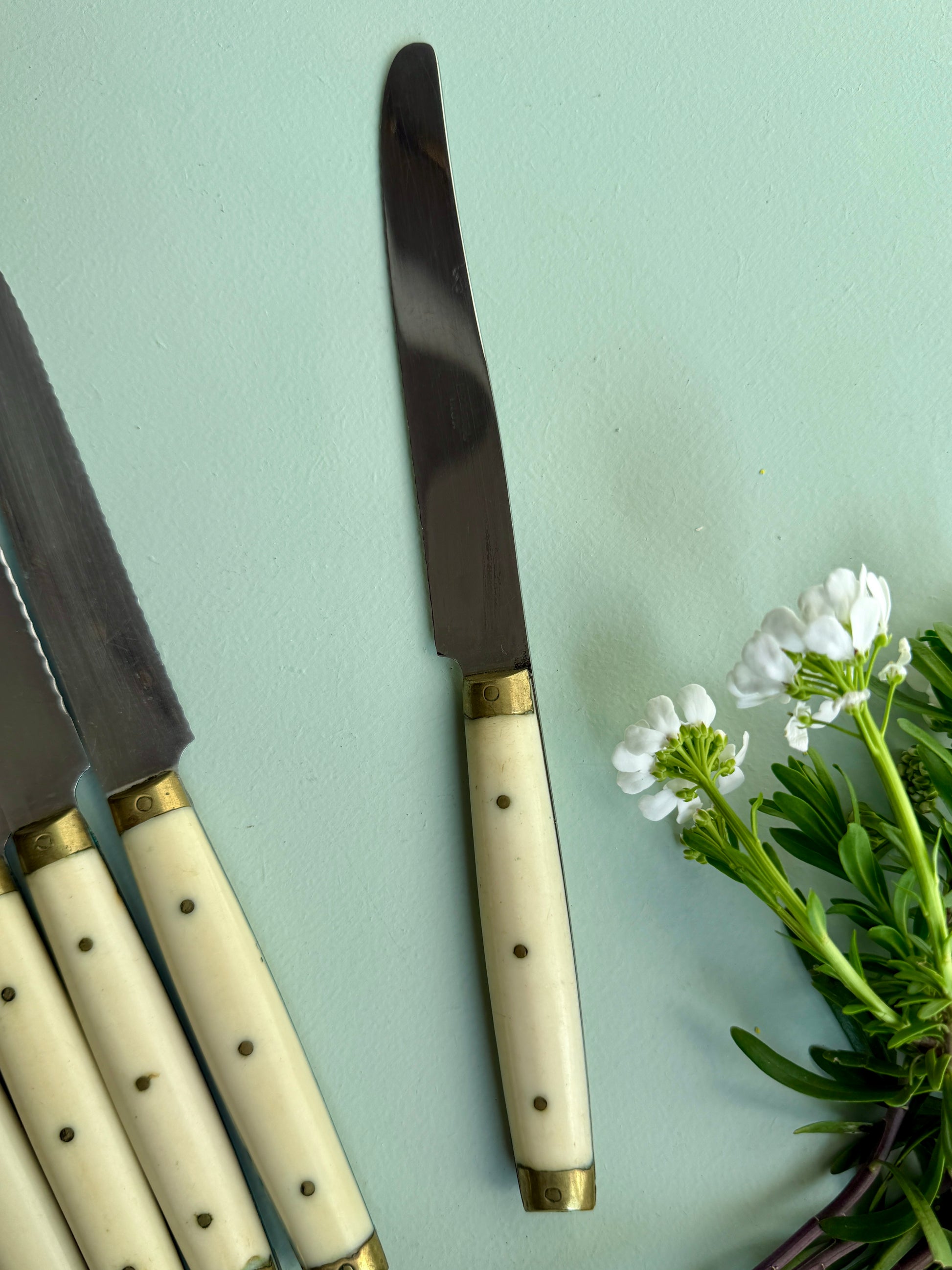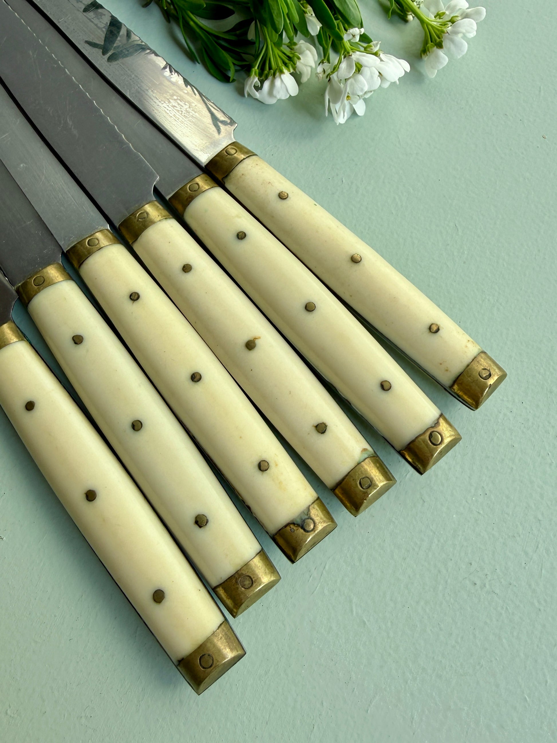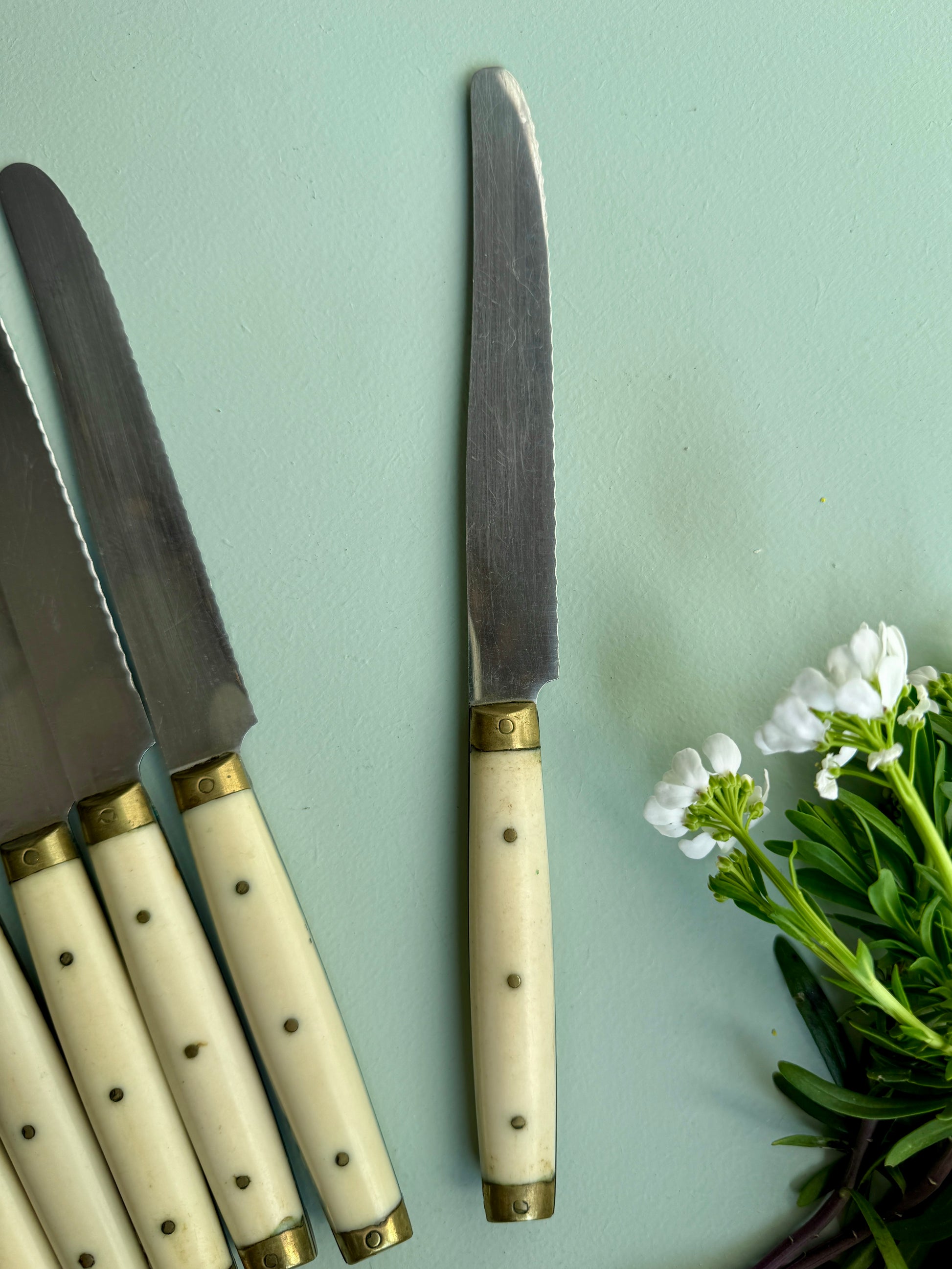 Lot de 6 couteaux anciens avec manches nacrés et viroles en laiton. Une belle présence sur une table, avec ce contraste entre le métal et le manche clair.