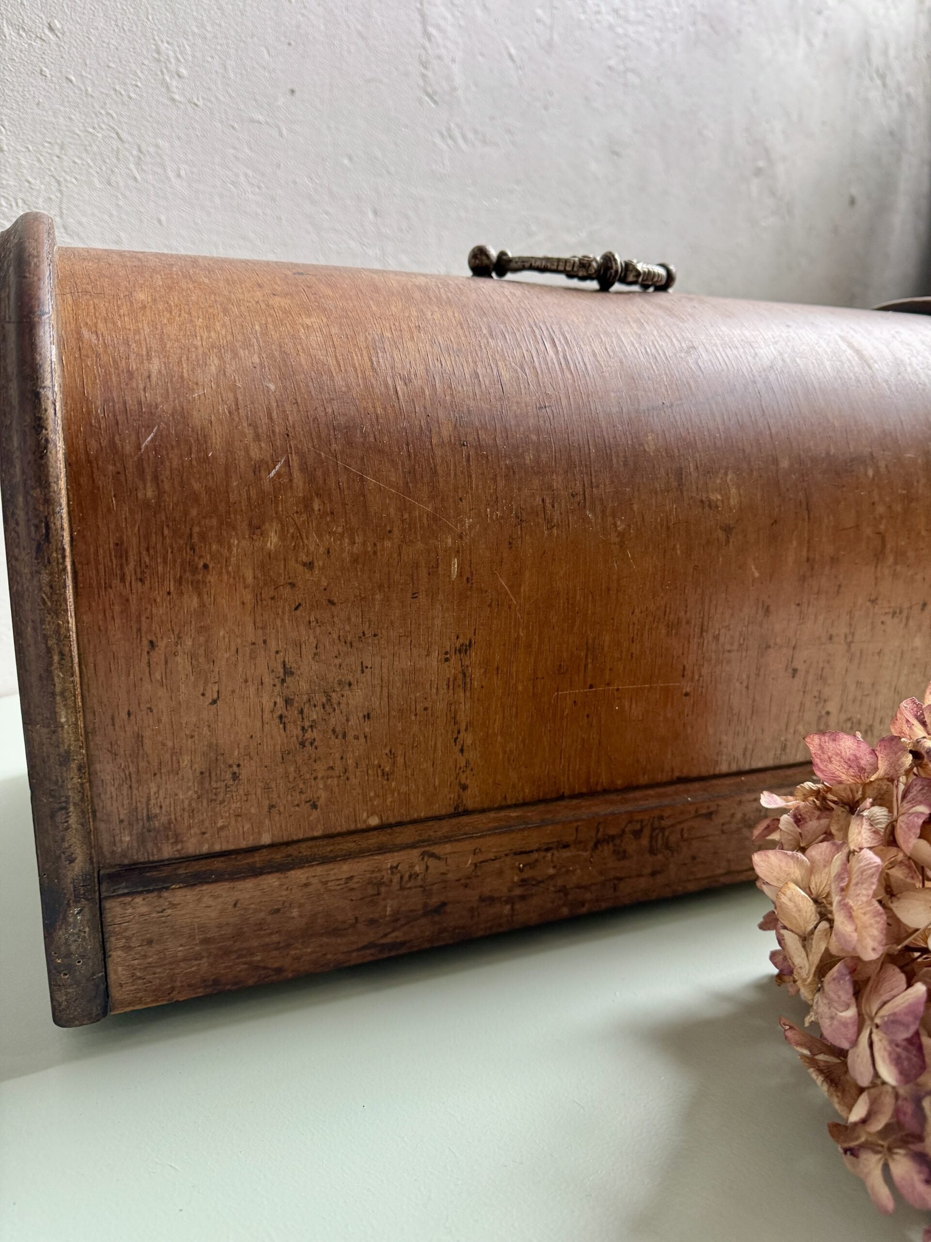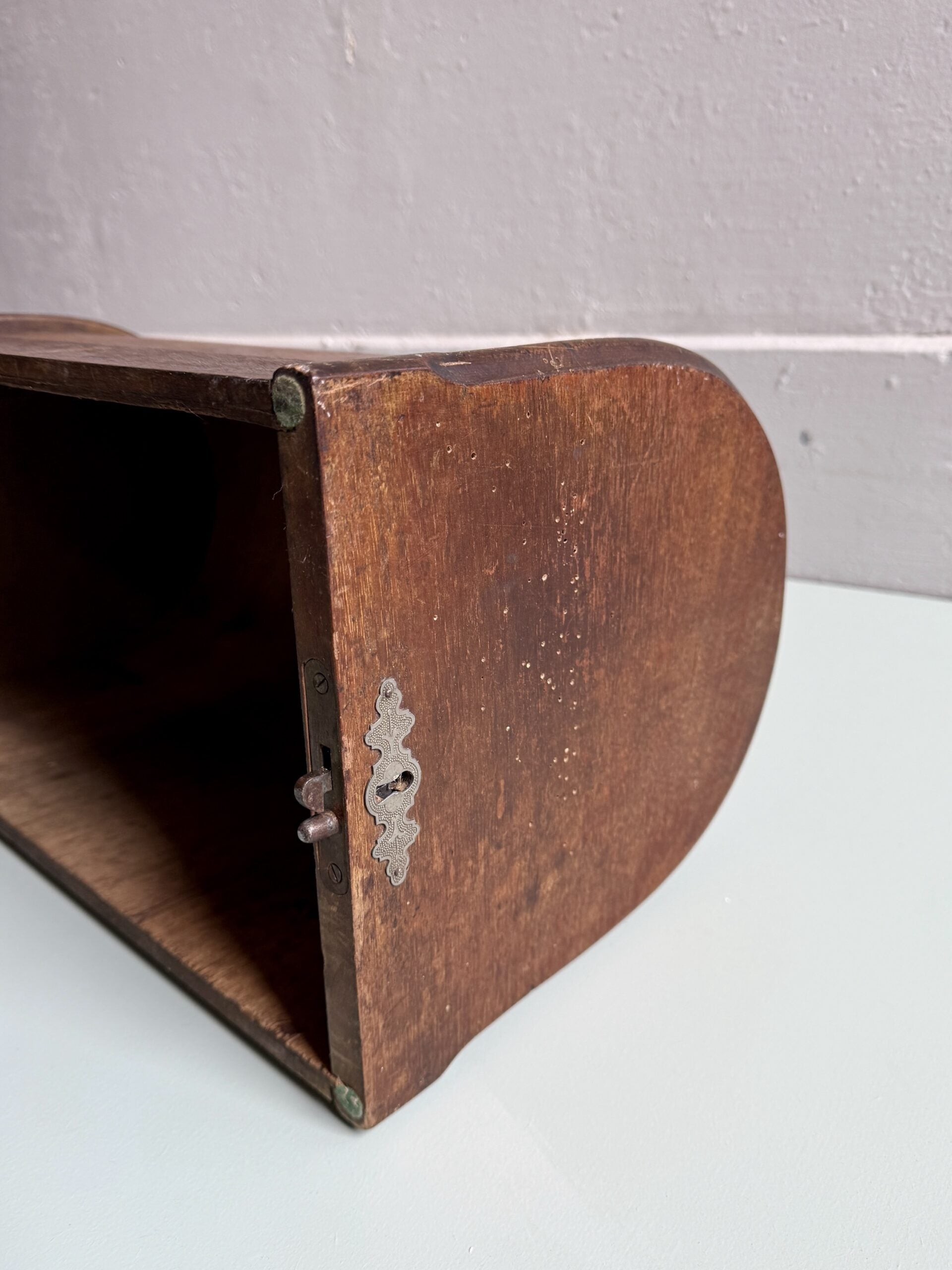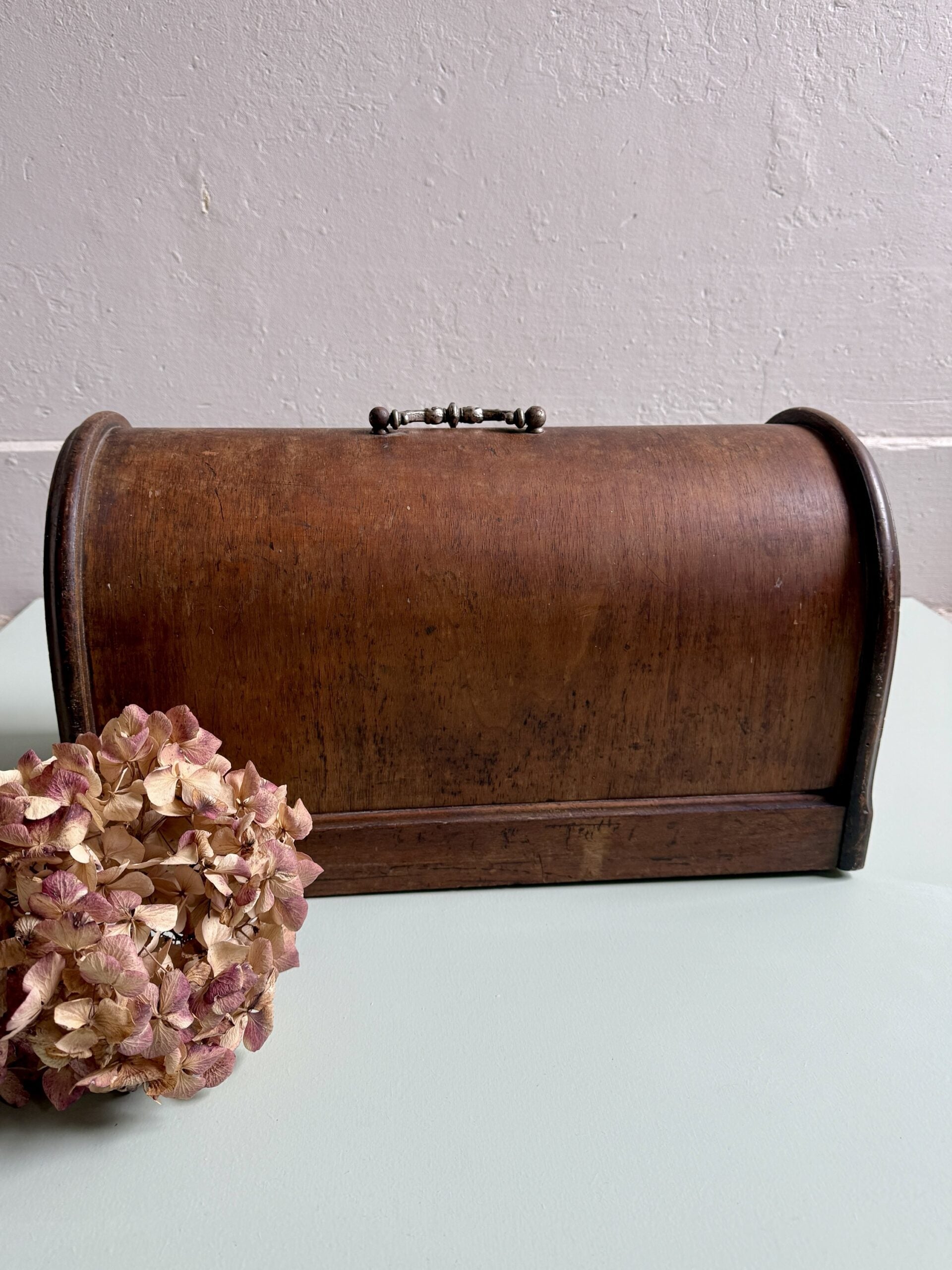 Couvercle ancien de machine à coudre en bois popoté, dans son état d’origine. Le bois présente des traces du temps et de l’usage, visibles et assumées. Ce type de couvercle peut facilement être détourné : posé sur un meuble, une étagère, ou utilisé sur une planche à pain pour couvrir des gâteaux ou du pain. Une pièce simple, utile ou décorative selon l’envie.
