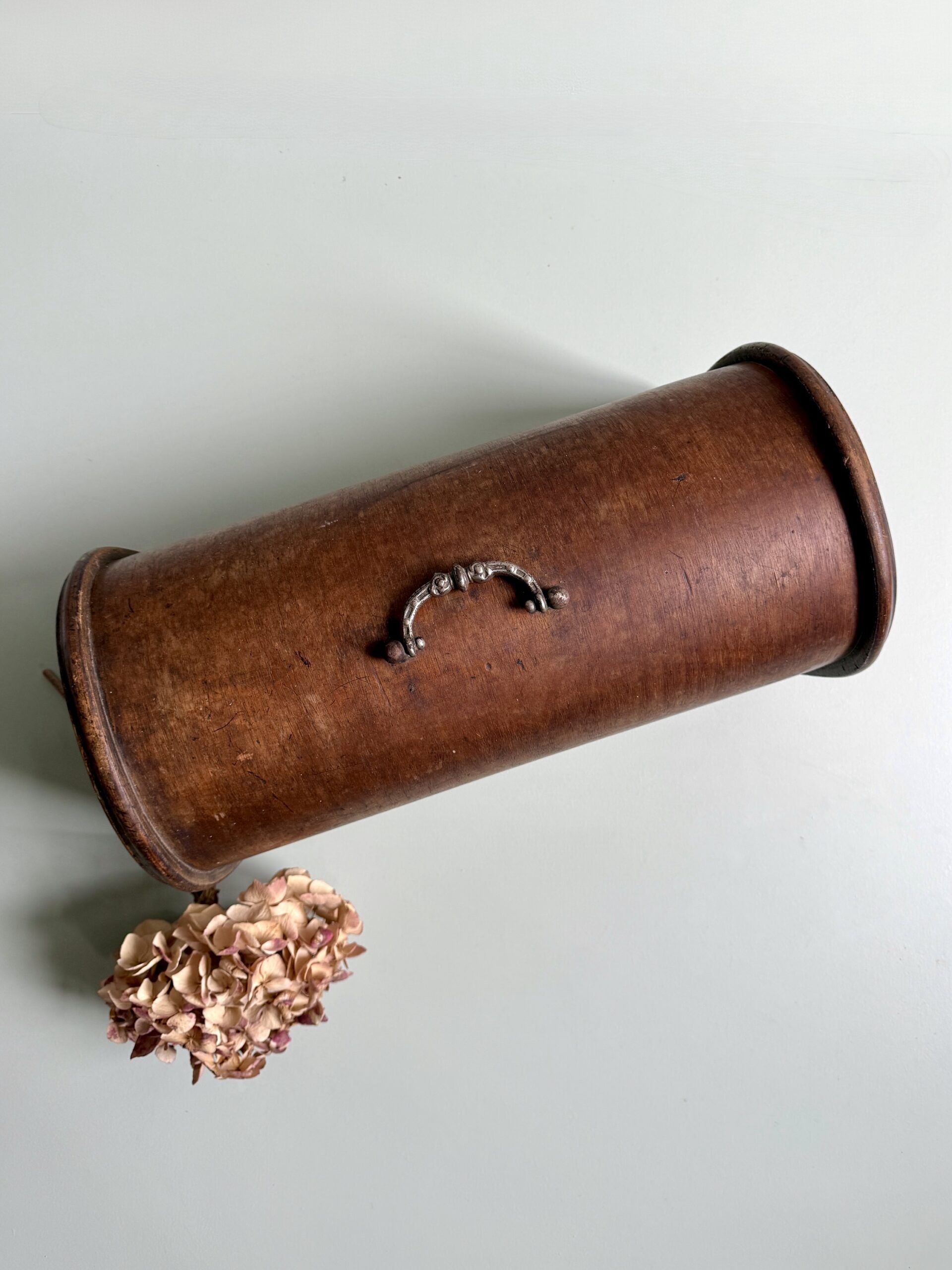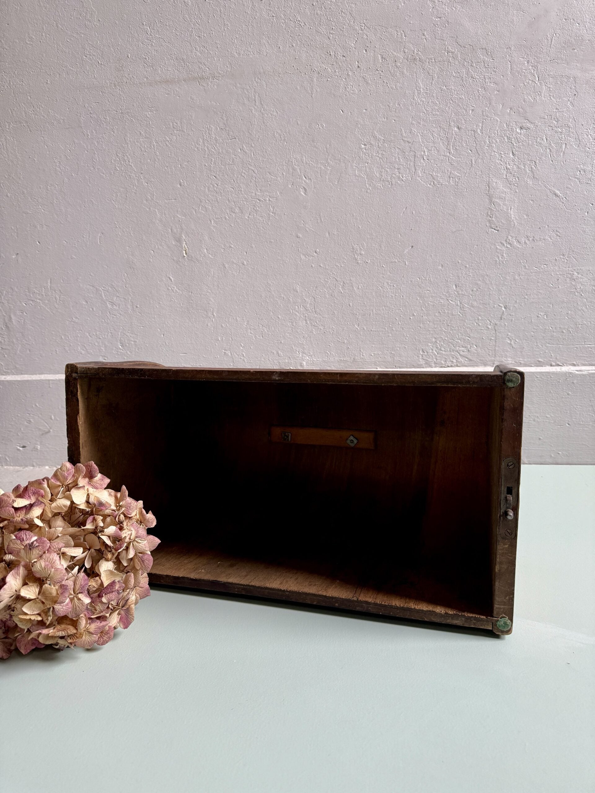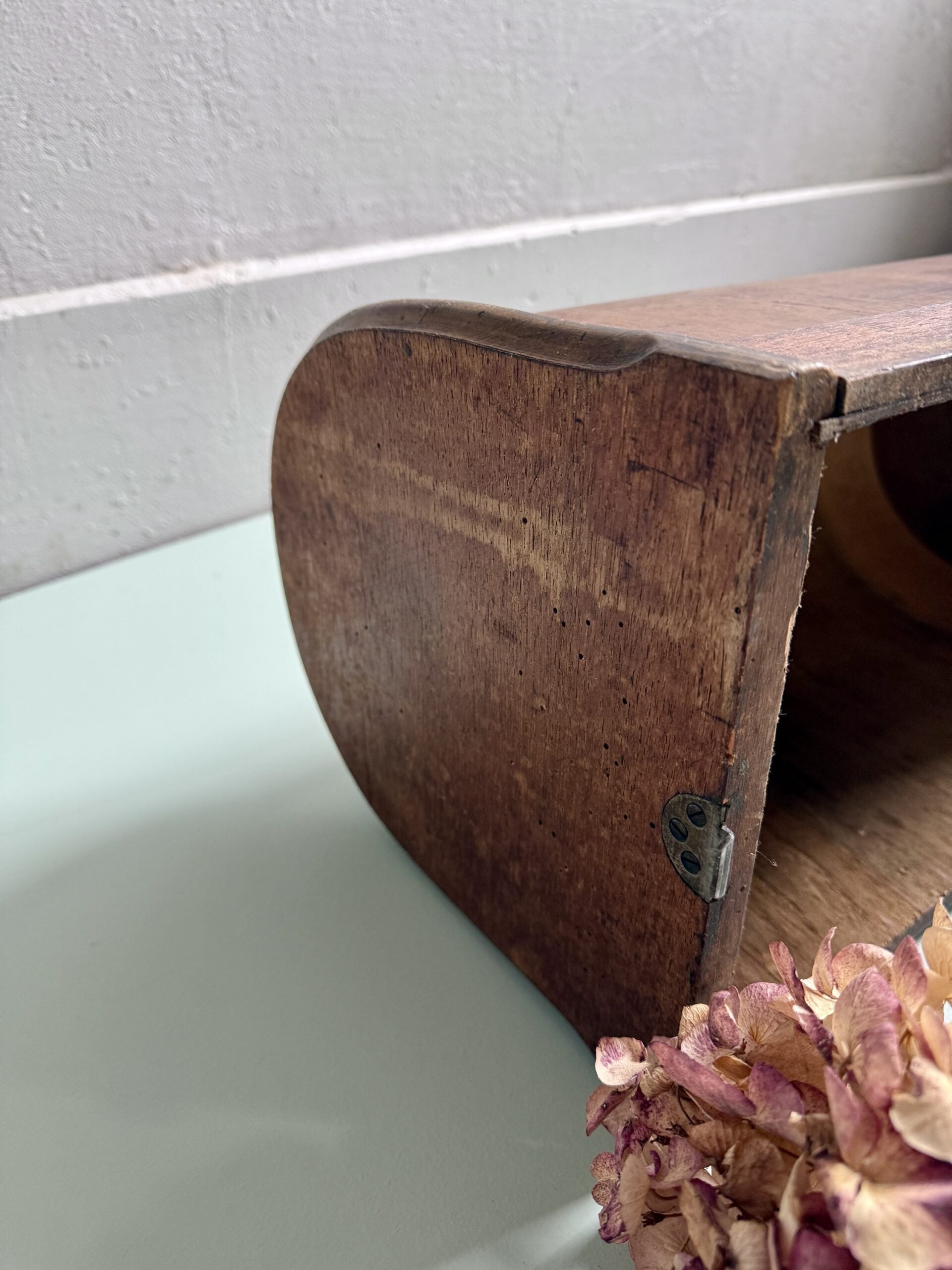 Couvercle ancien de machine à coudre en bois popoté, dans son état d’origine. Le bois présente des traces du temps et de l’usage, visibles et assumées. Ce type de couvercle peut facilement être détourné : posé sur un meuble, une étagère, ou utilisé sur une planche à pain pour couvrir des gâteaux ou du pain. Une pièce simple, utile ou décorative selon l’envie.