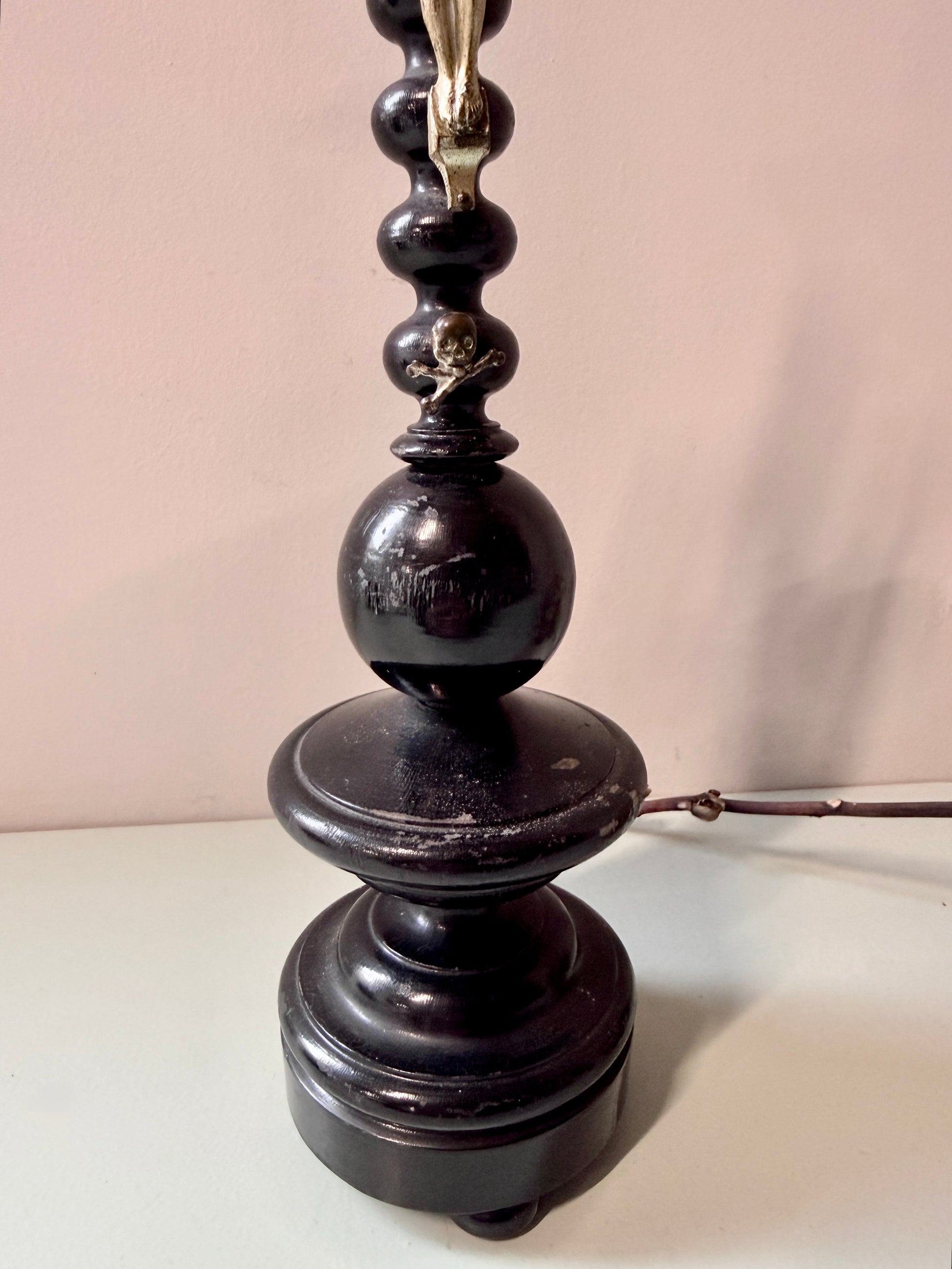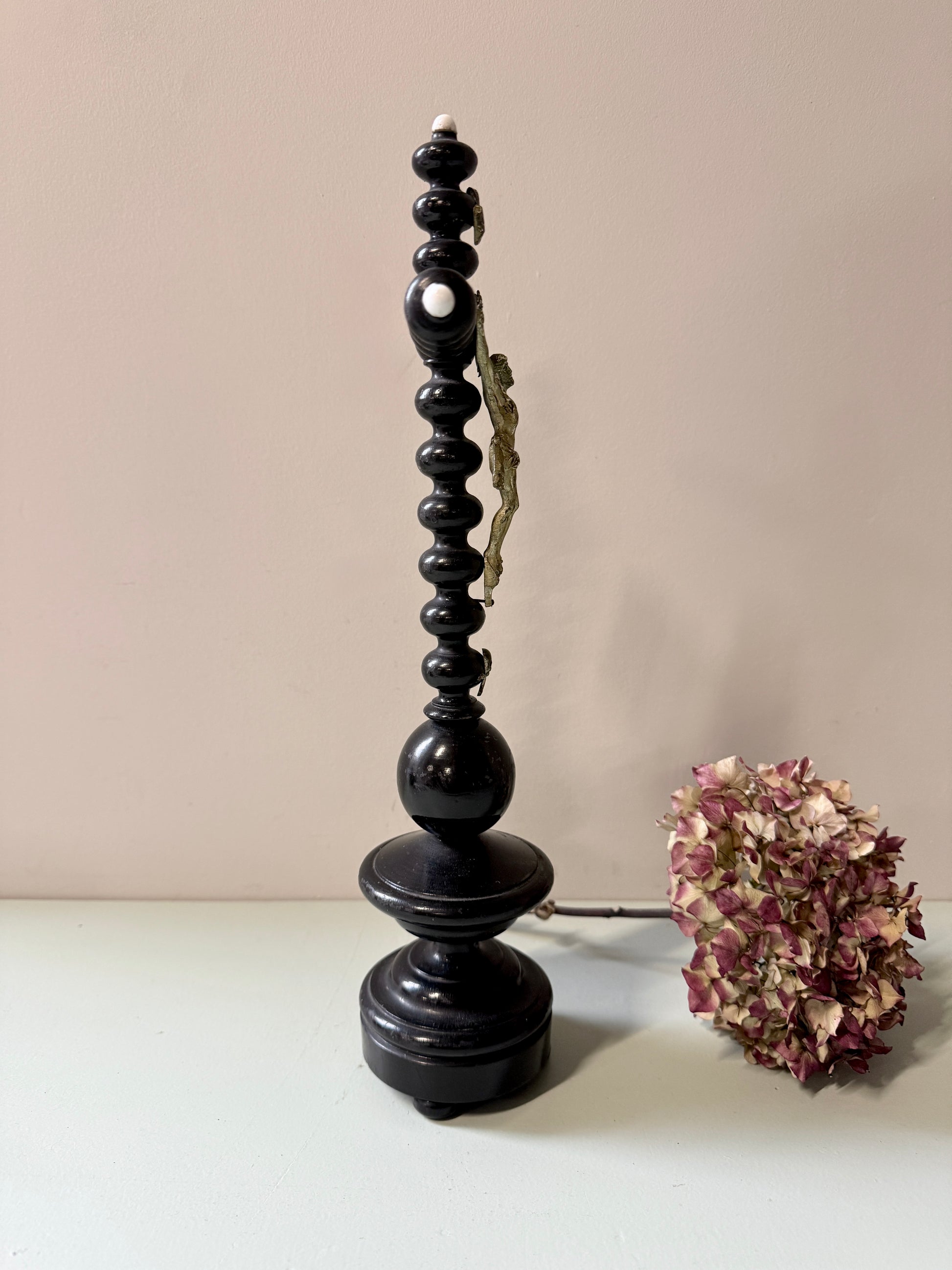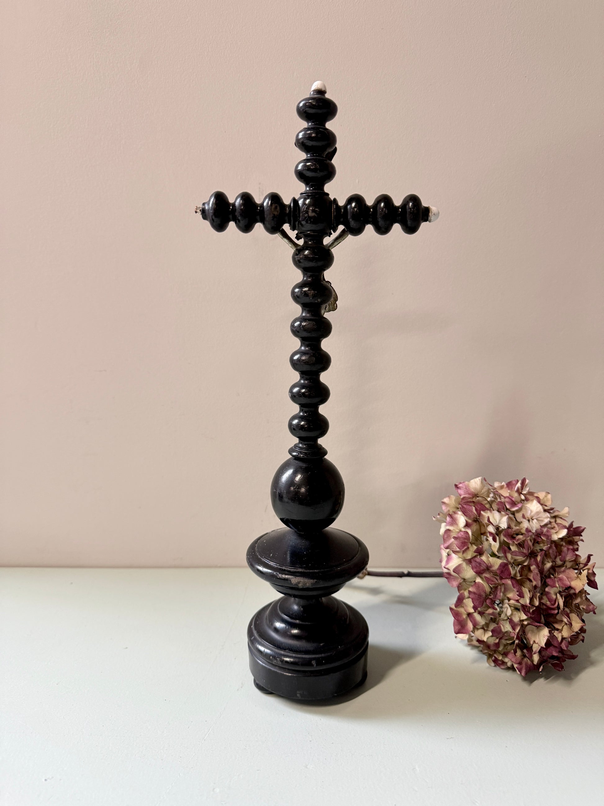 Crucifix ancien en bois noir tourné, monté sur un piètement travaillé. Le Christ en métal doré contraste joliment avec le bois sombre et apporte du relief à l’ensemble.