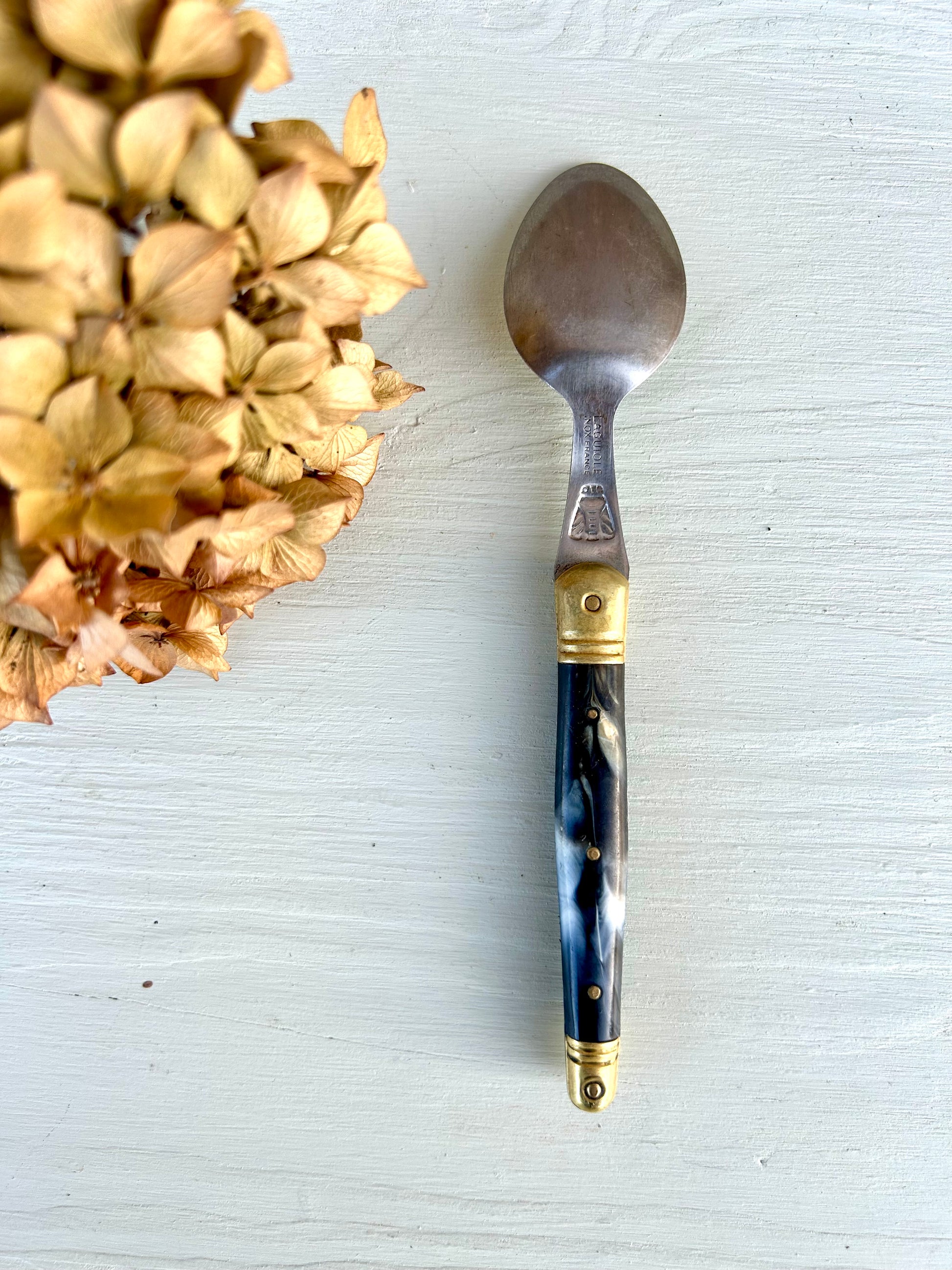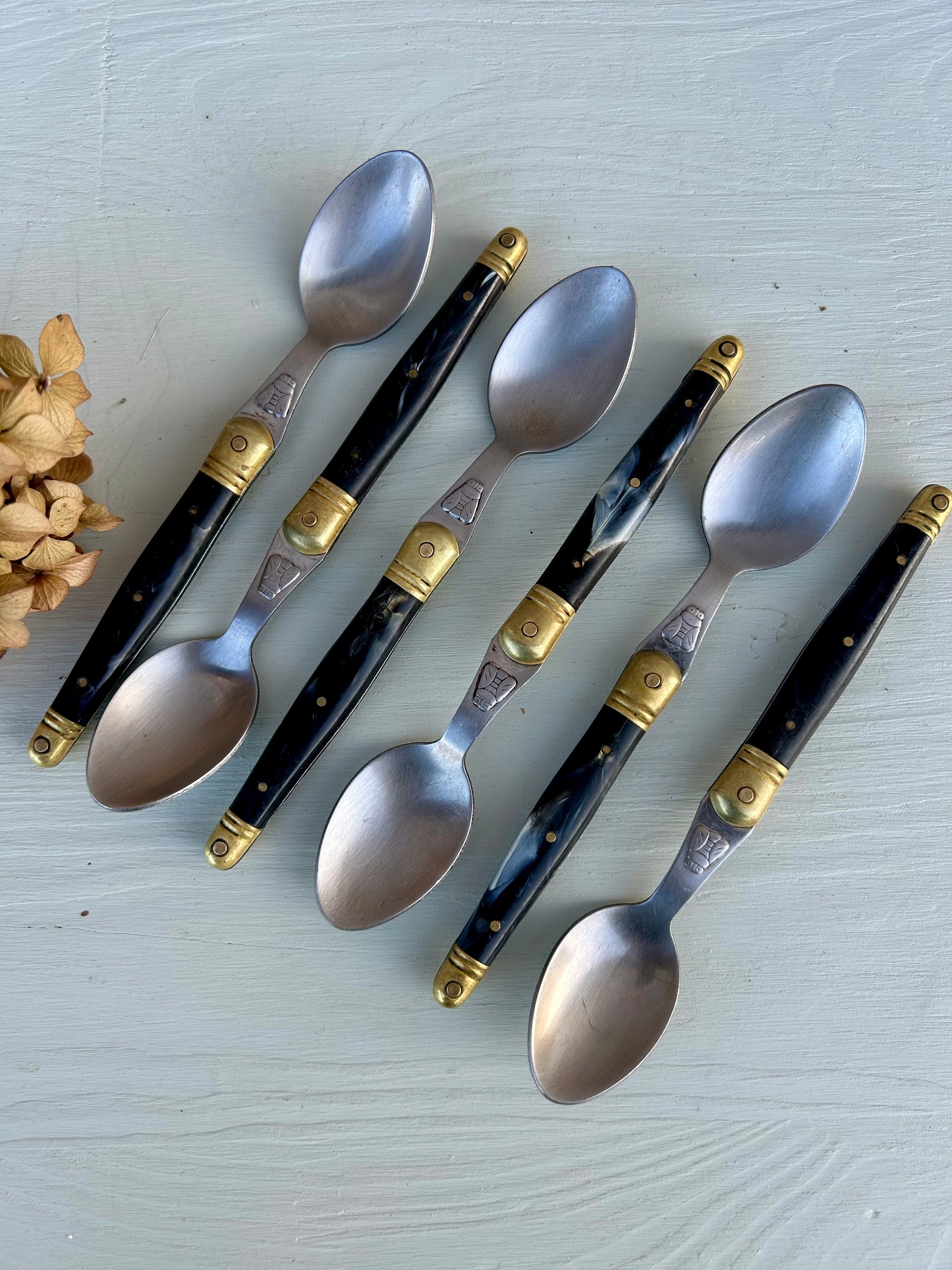 Ce lot comprend six cuillères à café Laguiole de 15 cm. Chaque pièce possède un manche en résine sombre aux nuances marbrées, complété par des finitions en laiton. On retrouve l'abeille, symbole historique de la marque, sur la partie métallique faisant la jonction avec le manche. Ce sont des couverts robustes et classiques, parfaits pour compléter un service de table existant ou pour un usage quotidien avec une touche rétro.