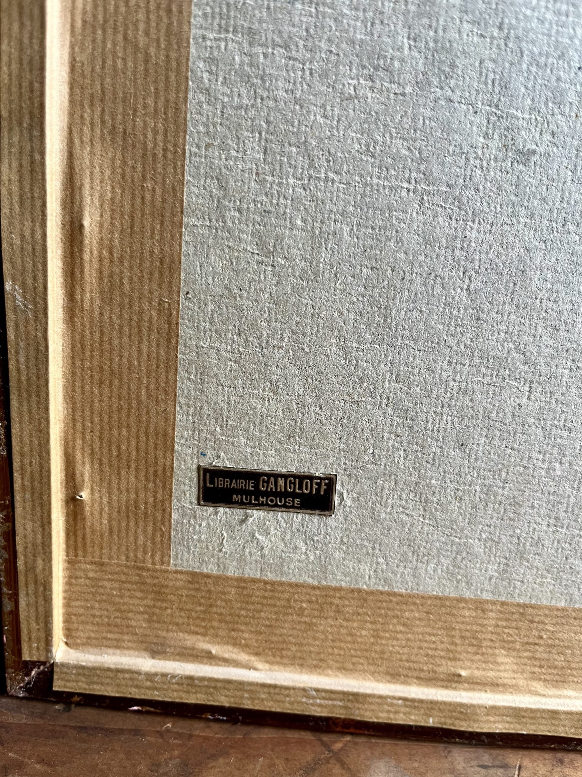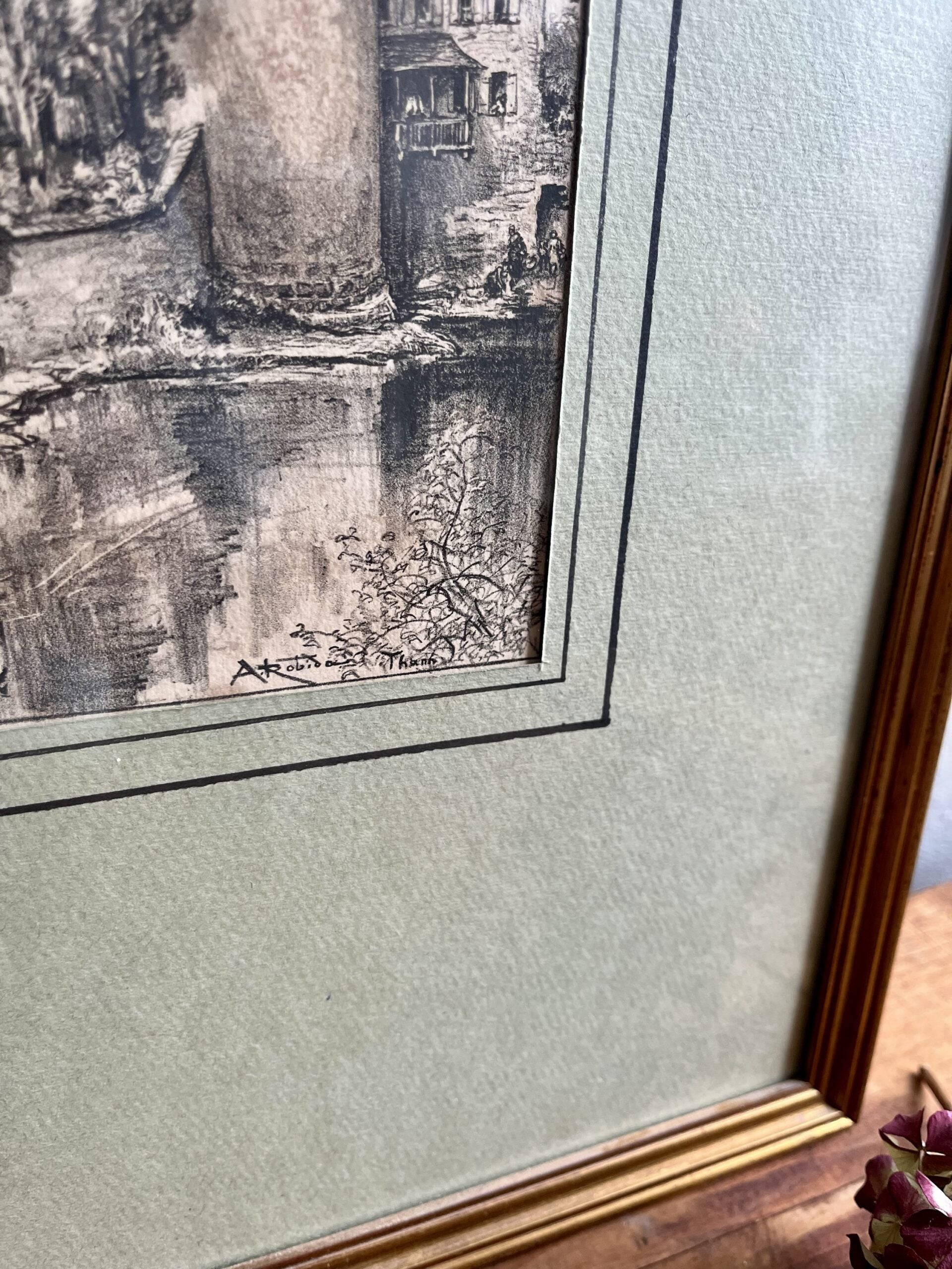 Le dessin est signé A. Robida en bas à droite et présenté dans un encadrement ancien avec passe-partout vert, qui met bien en valeur le sujet. Quelques traces du temps peuvent être visibles, en accord avec l’âge de la pièce.