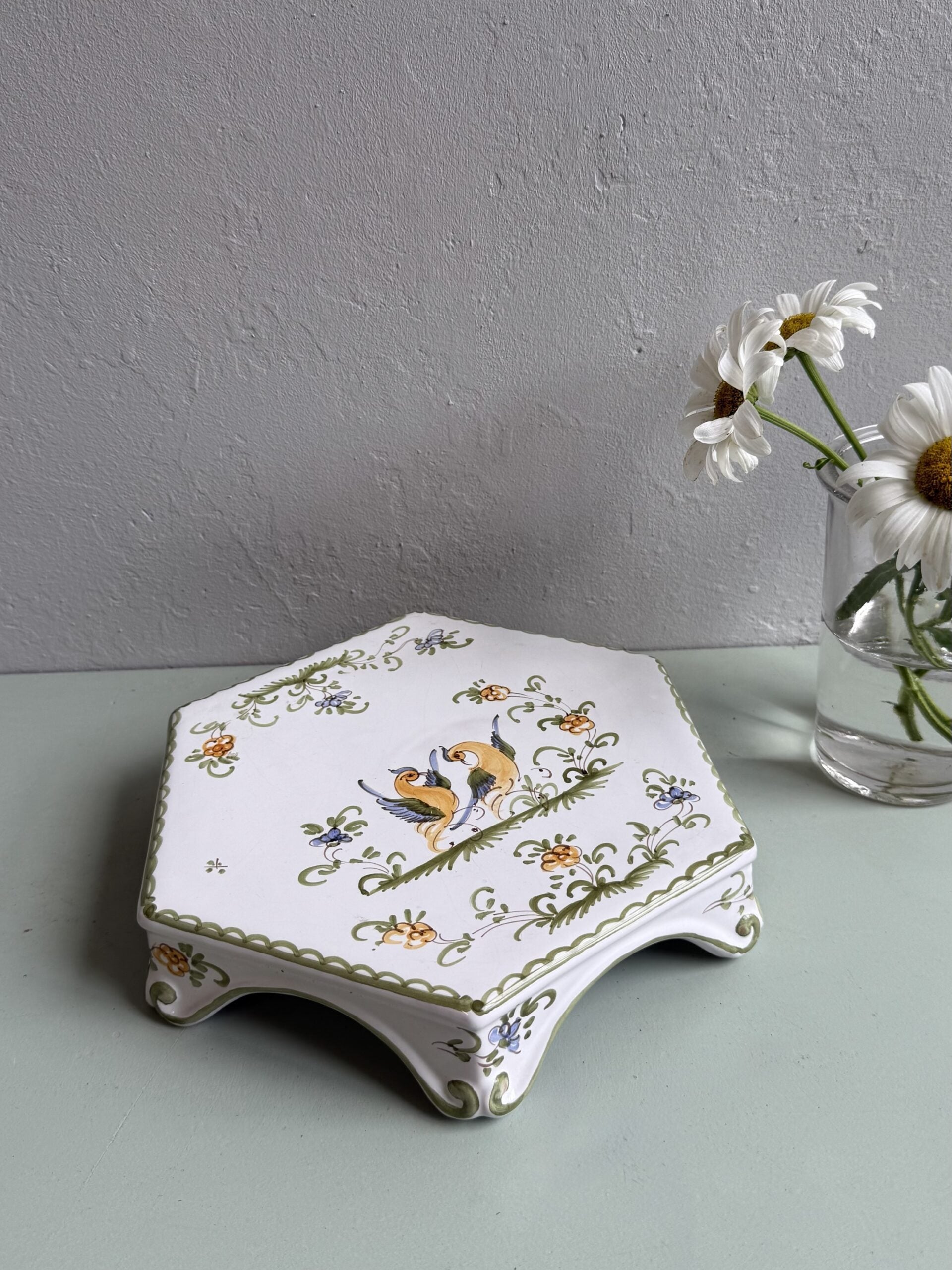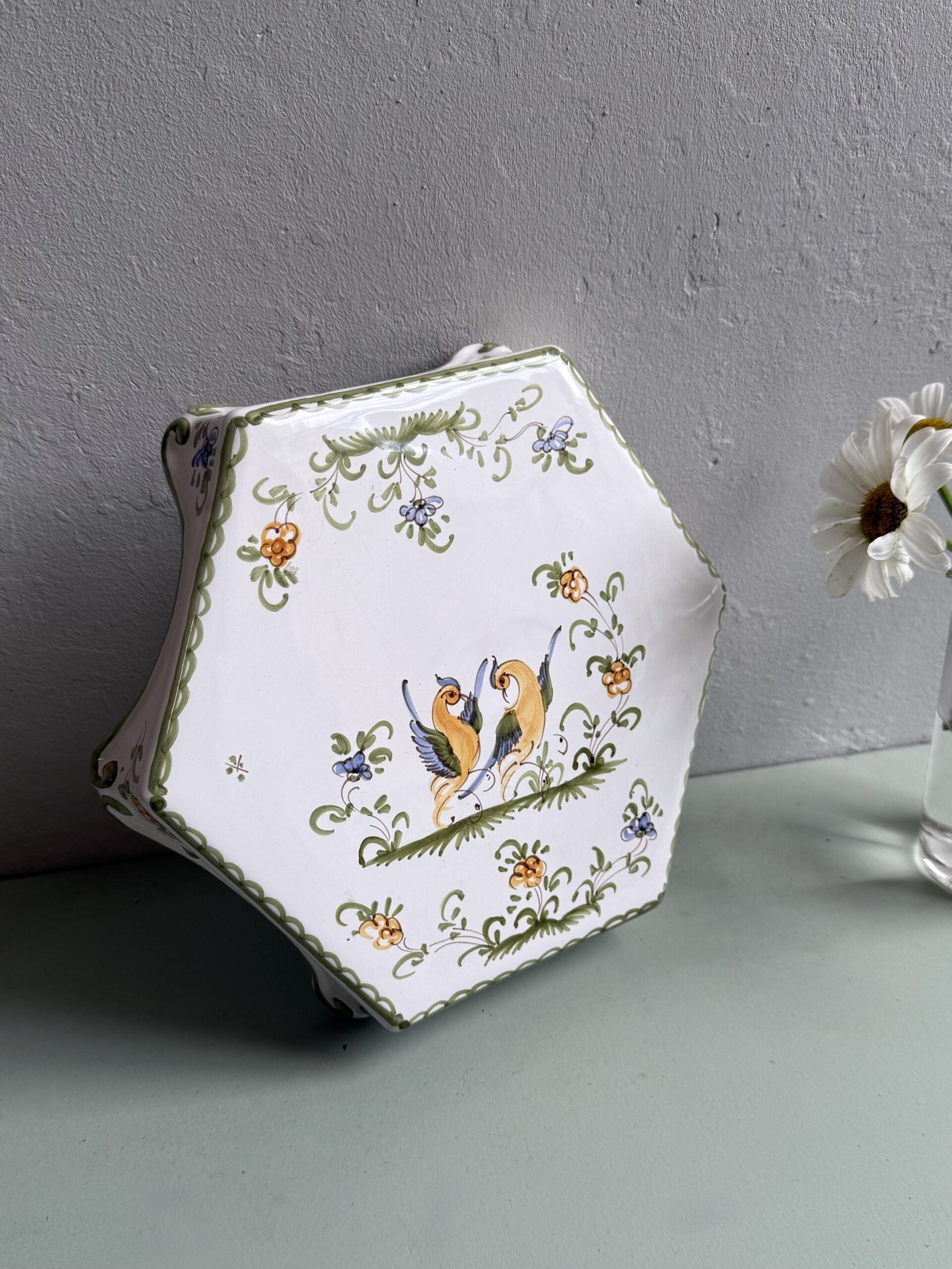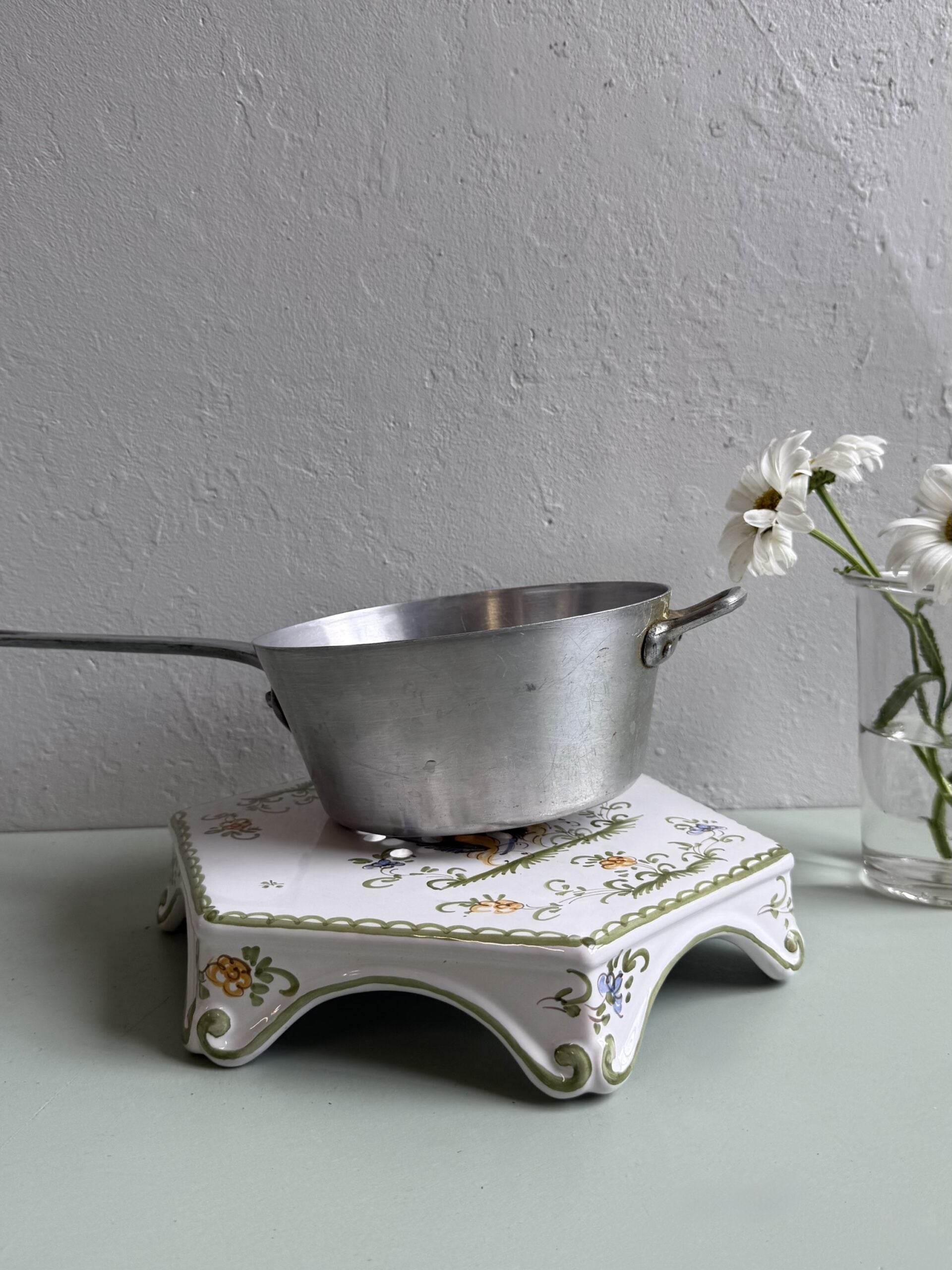 À utiliser pour poser un plat chaud ou simplement en décoration ancienne sur une table, un buffet ou une étagère. Sa forme hexagonale et ses pieds lui donnent une belle présence dans une cuisine ou une salle à manger esprit brocante.