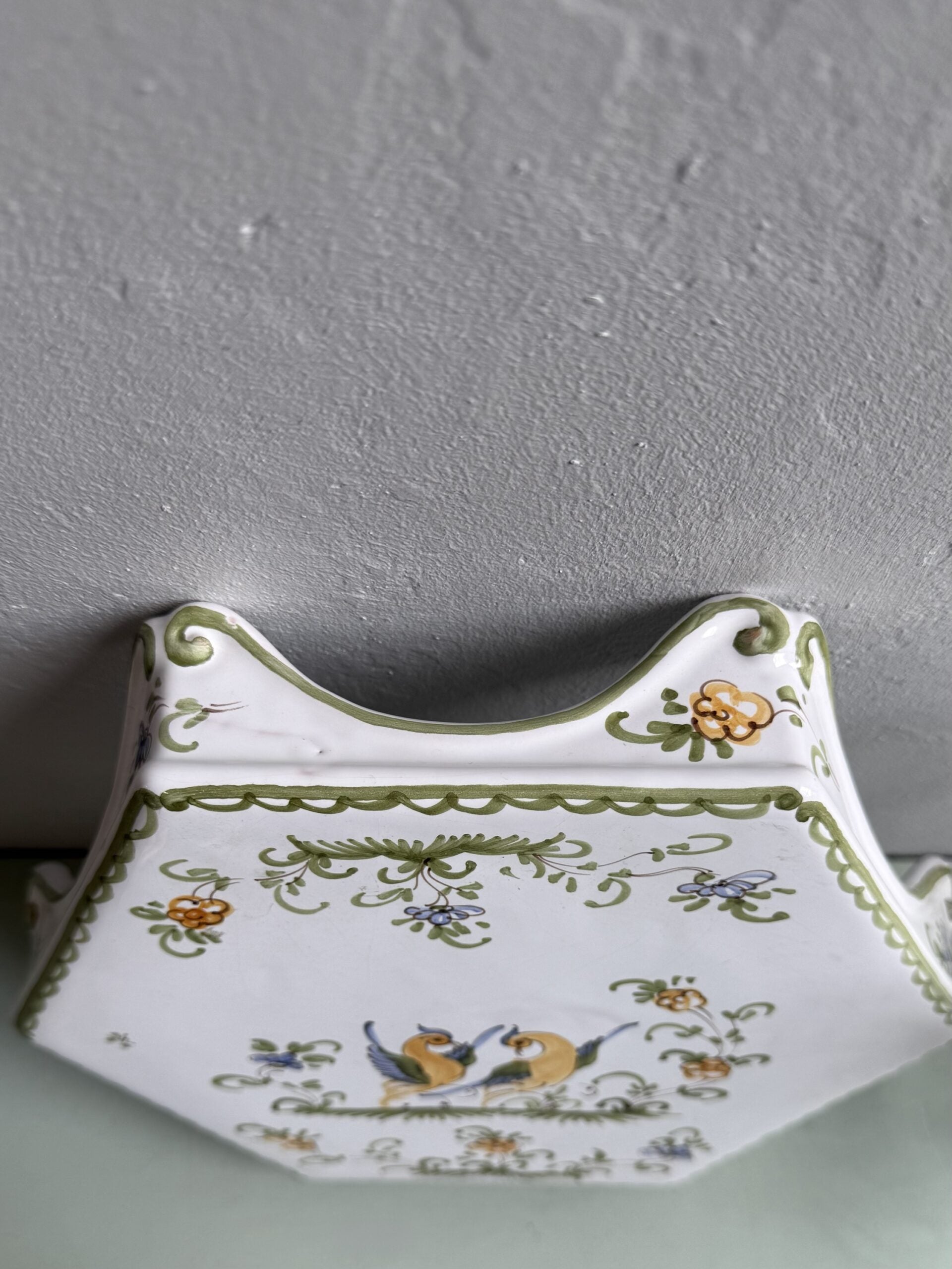 Dessous de plat en faïence de Moustiers, pièce artisanale décorée à la main avec oiseaux et motifs floraux. Travail typique de la tradition de Moustiers-Sainte-Marie, reconnu pour sa faïence ancienne au décor délicat.