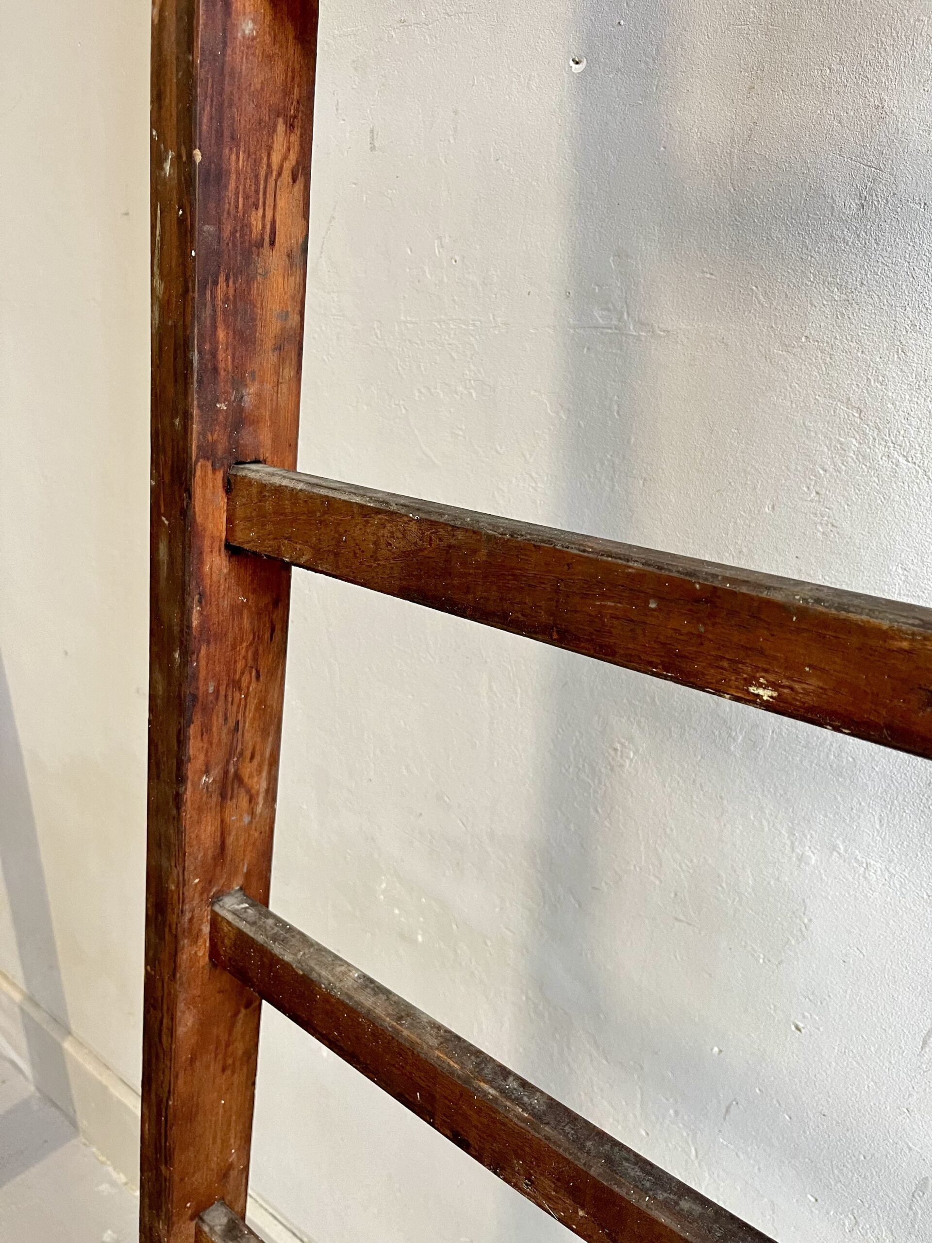 Grande échelle ancienne en bois massif, conservée dans sa patine d’origine. Le bois présente des marques liées à son usage passé, qui participent à son caractère.