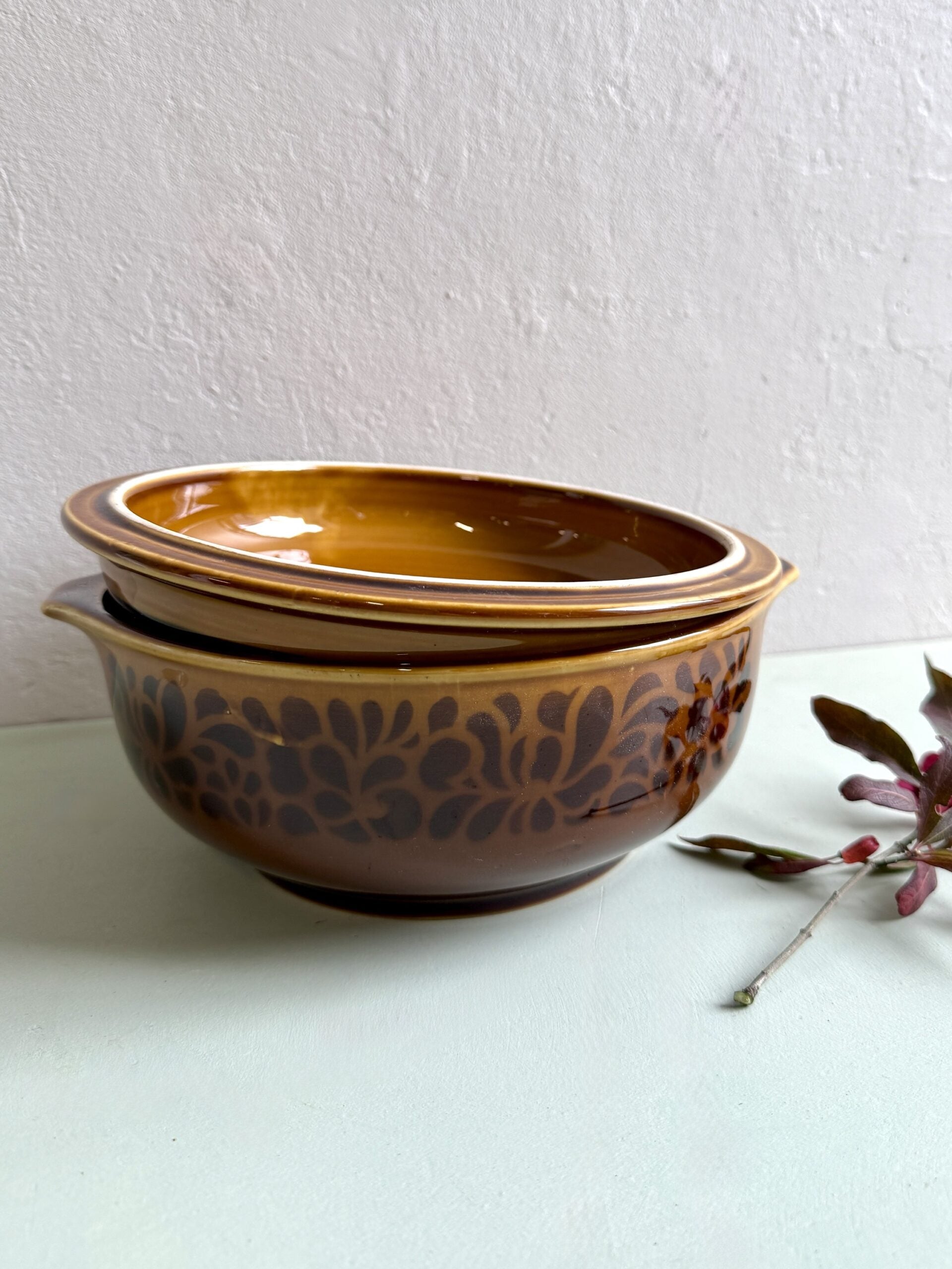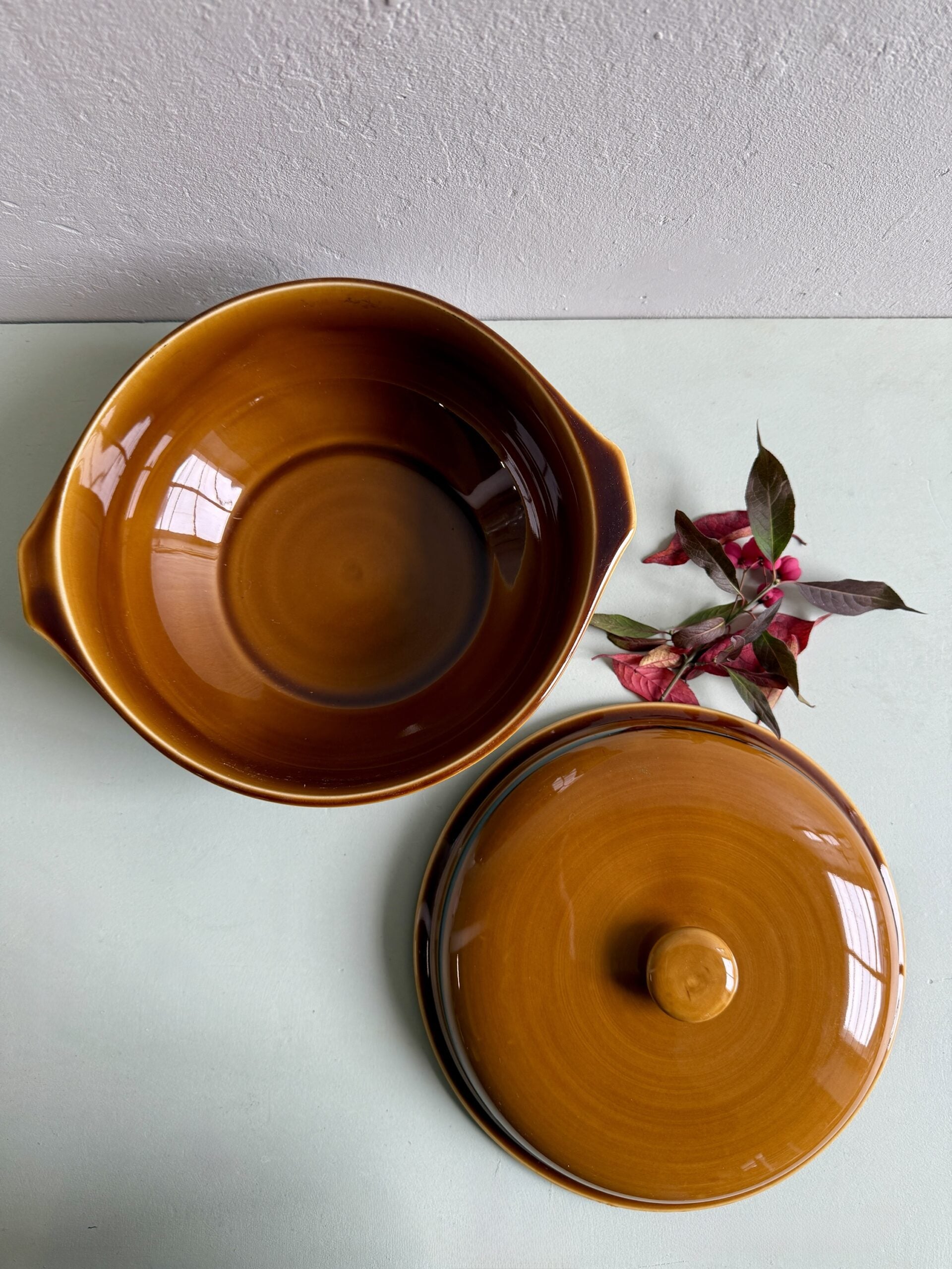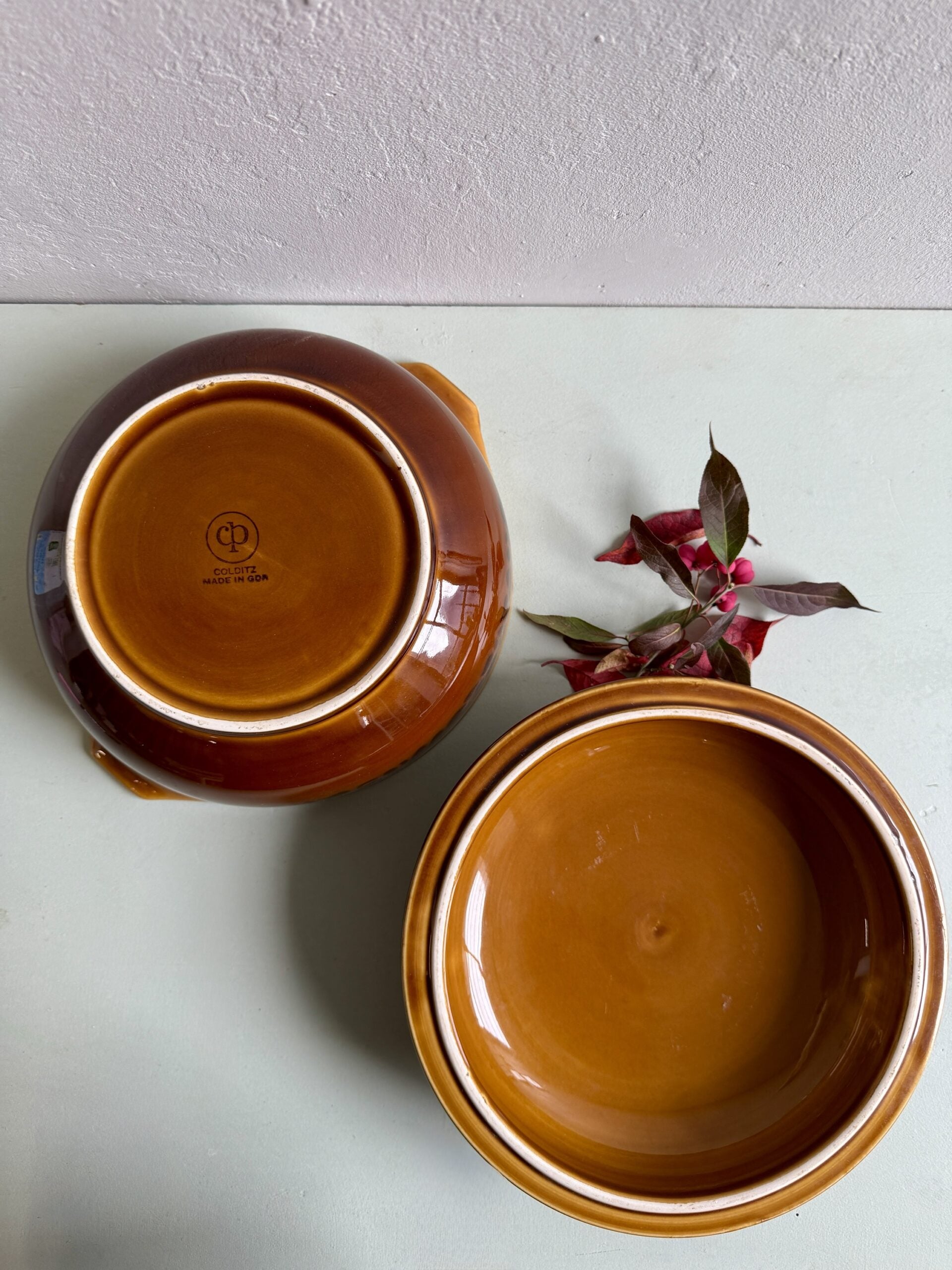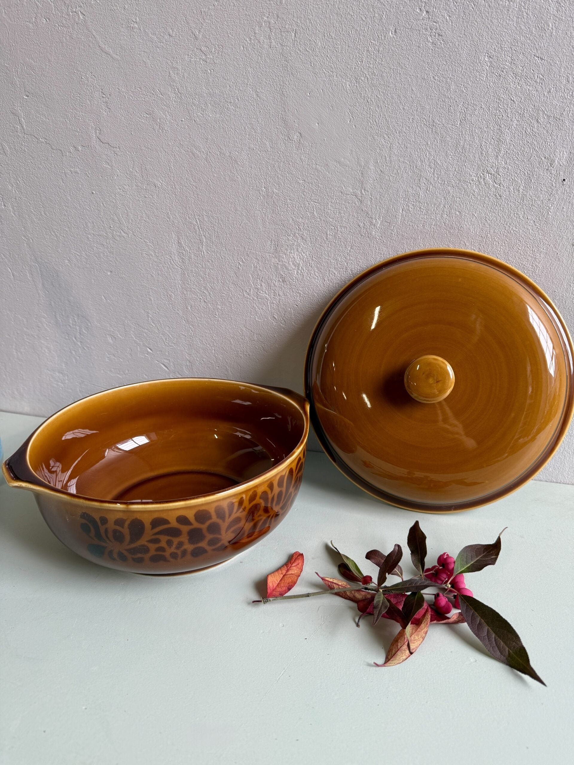 Faitout en céramique émaillée marron signé CP Colditz, fabriqué en Allemagne. Modèle typique des années 70, avec frise florale graphique sur le pourtour et couvercle assorti en céramique ancienne.
