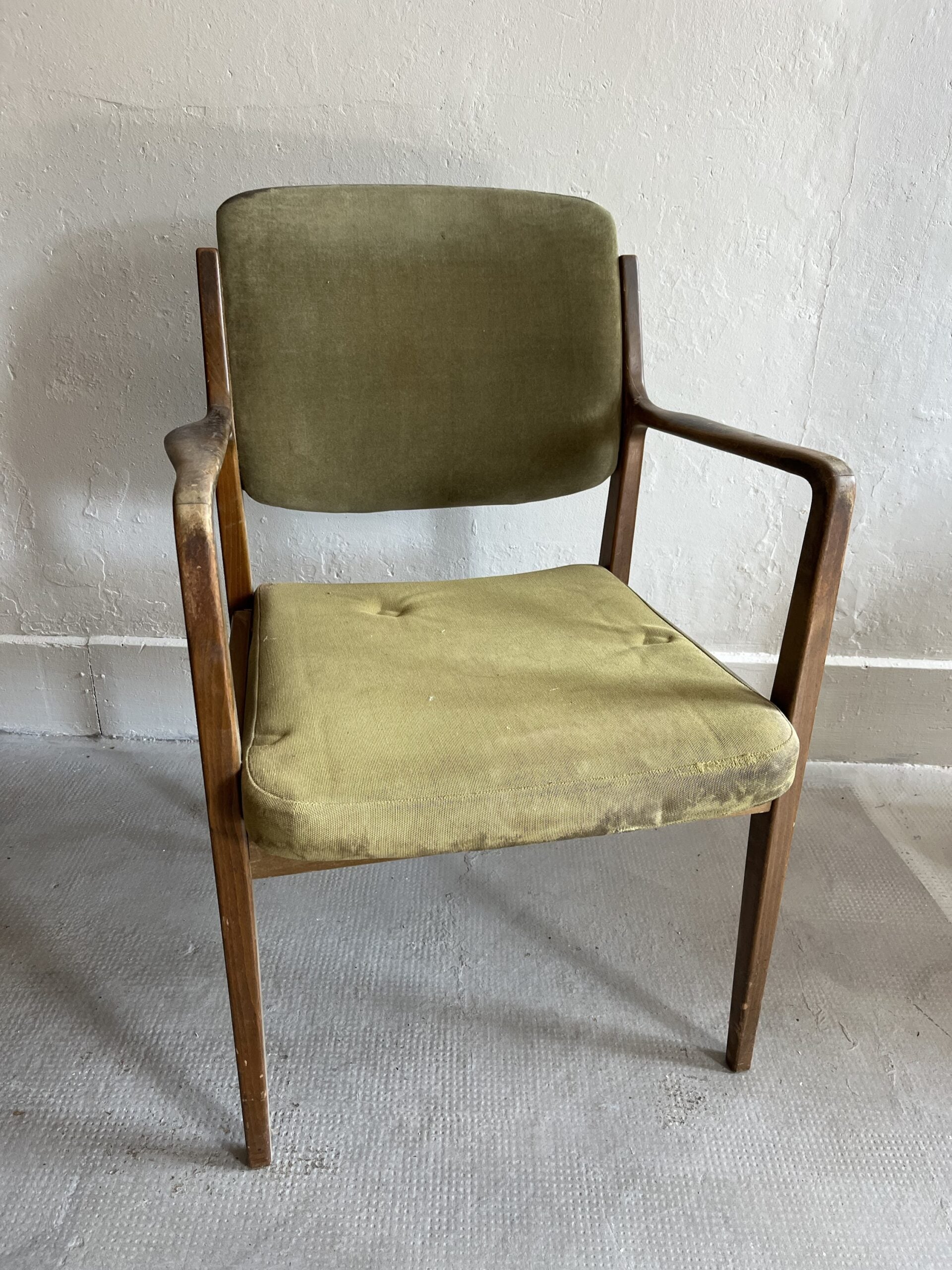 Fauteuil en bois, actuellement disponible à la rénovation dans notre atelier.\n\nSa structure solide peut être remise en valeur avec la finition de votre choix, et l’assise ainsi que le dossier peuvent être retapissés avec un nouveau tissu pour un rendu totalement personnalisé.\n\nLe tarif affiché est indicatif et sera ajusté en fonction des choix de personnalisation.\n\nUn fauteuil de caractère, prêt à s’offrir une seconde jeunesse et à s’adapter parfaitement à votre intérieur.\n\nDimensions: hauteur dossier 85cm/ hauteur assise 46cm/ profondeur assise 51cm/ largeur 57cm
