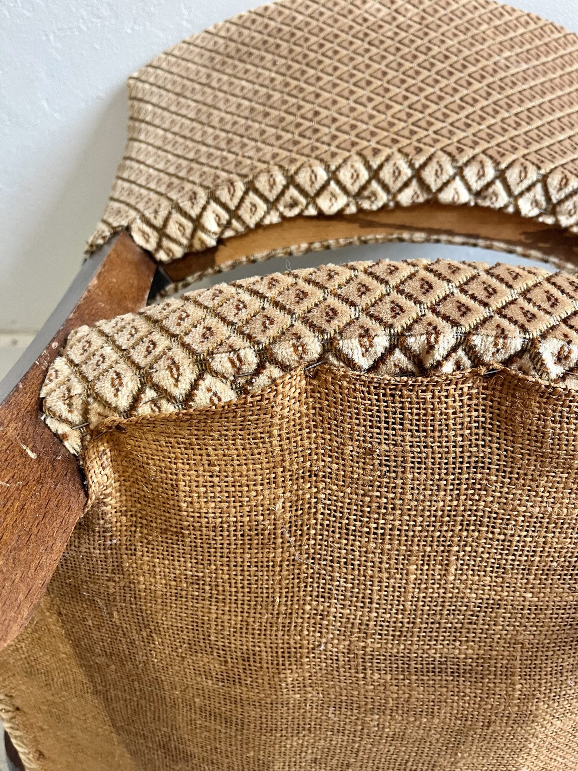 Fauteuil bridge ancien en bois, avec assise et dossier rembourrés recouverts d’un tissu beige à petits motifs géométriques. Une pièce confortable et simple, typique des années 40–50.