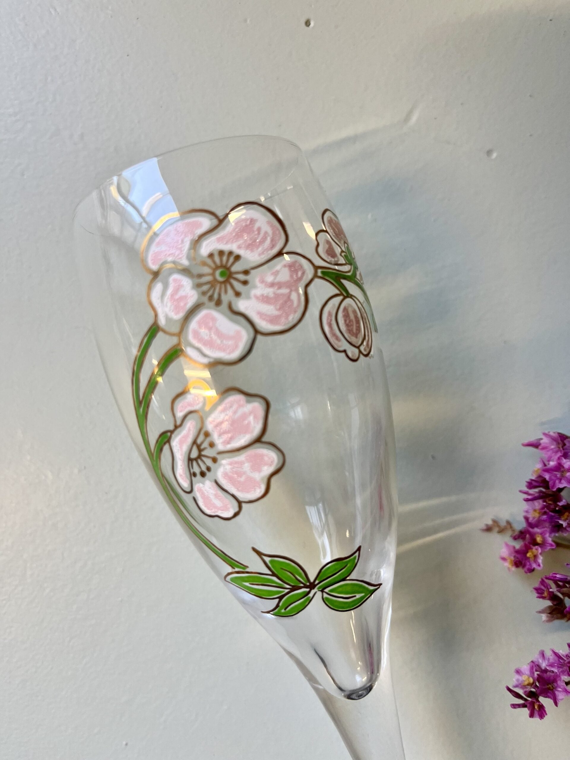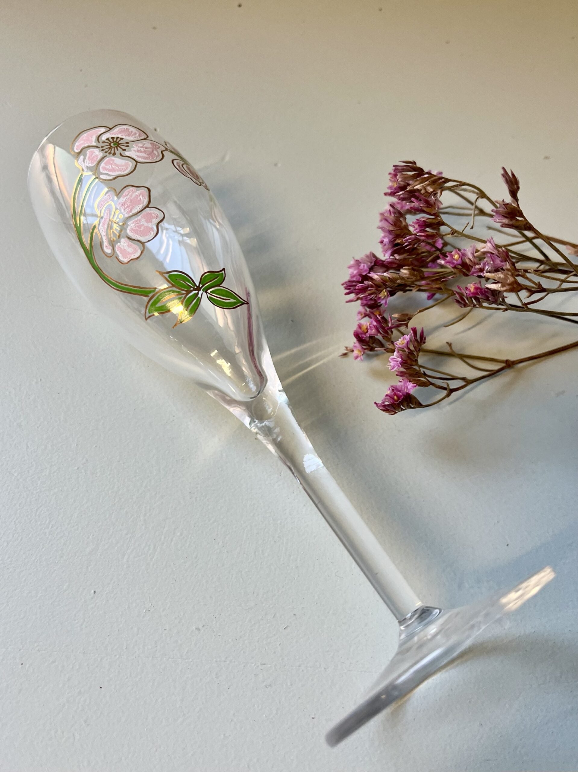 Flûtes à champagne décorées de fleurs Perrier-Jouët, peintes à la main, avec ce motif floral reconnaissable entre tous. Leur silhouette élancée et leur décor délicat rappellent les verres que l’on sortait pour les grandes occasions, ceux que l’on gardait précieusement dans un vaisselier et que l’on réservait aux beaux moments.Le décor floral, fin et poétique, apporte une vraie douceur à l’ensemble. Ces flûtes évoquent les tables d’autrefois, les repas partagés et une certaine idée de l’art de recevoir, simple et soigné, avec ce petit supplément d’âme propre aux belles pièces anciennes.