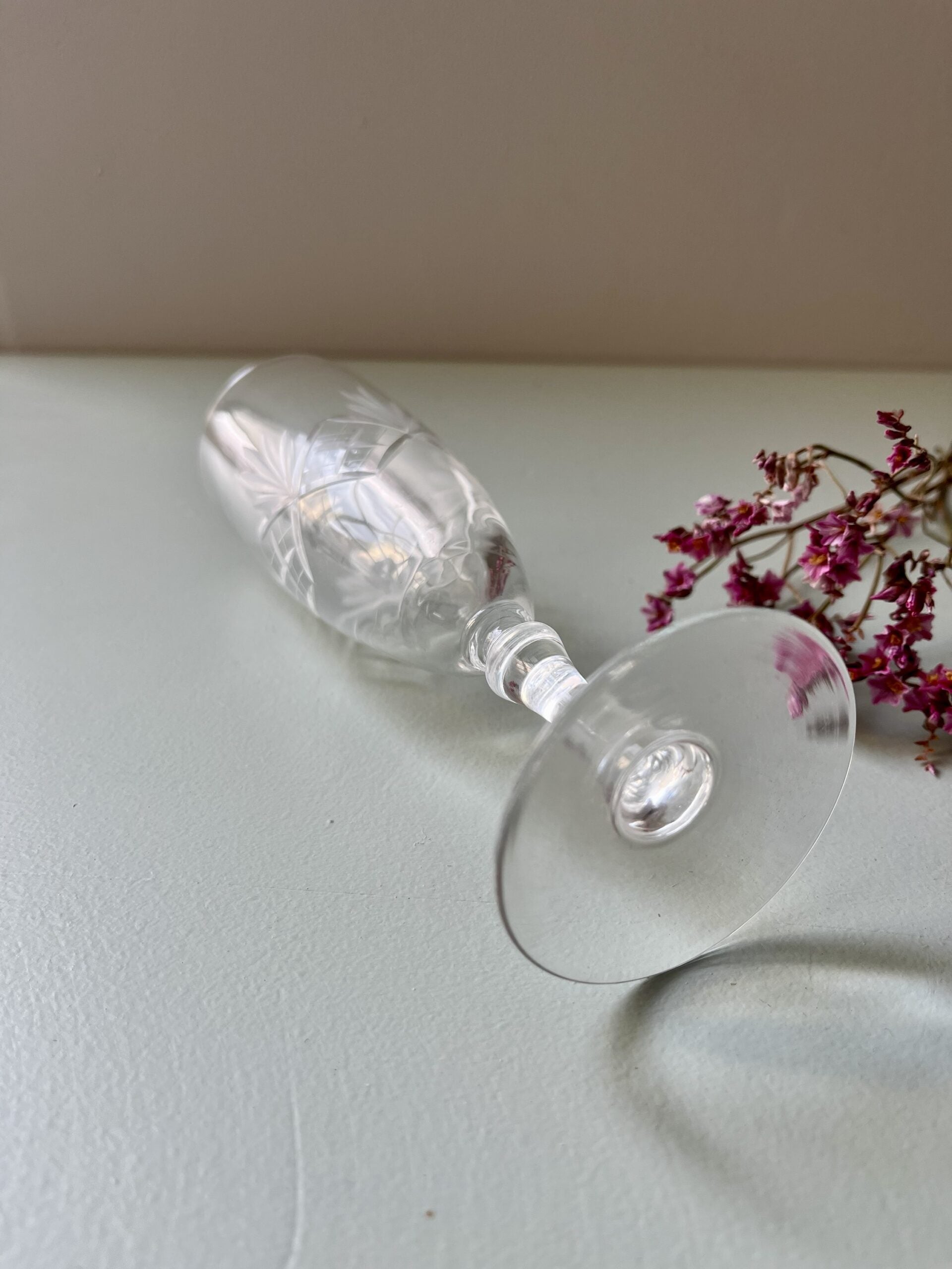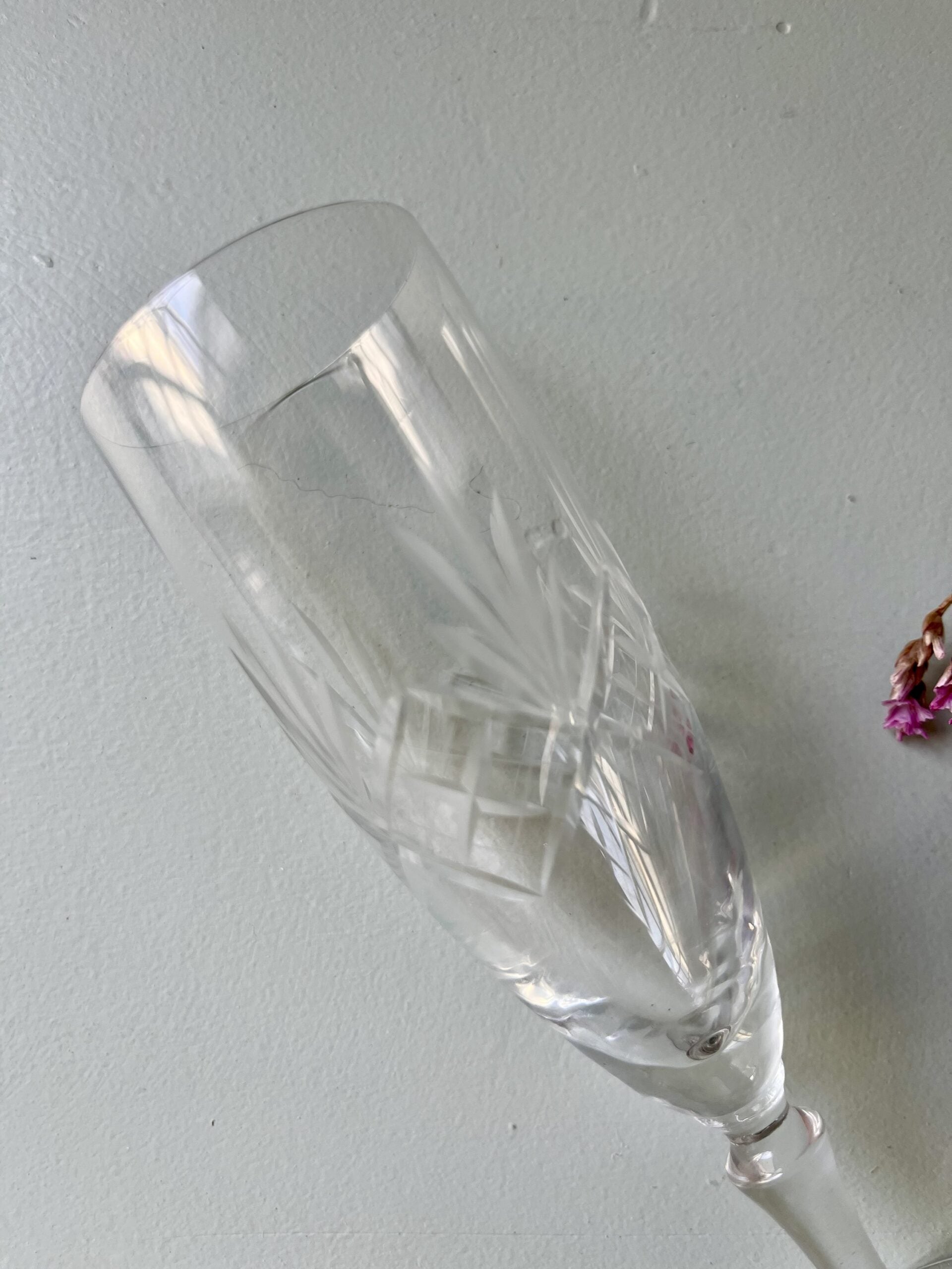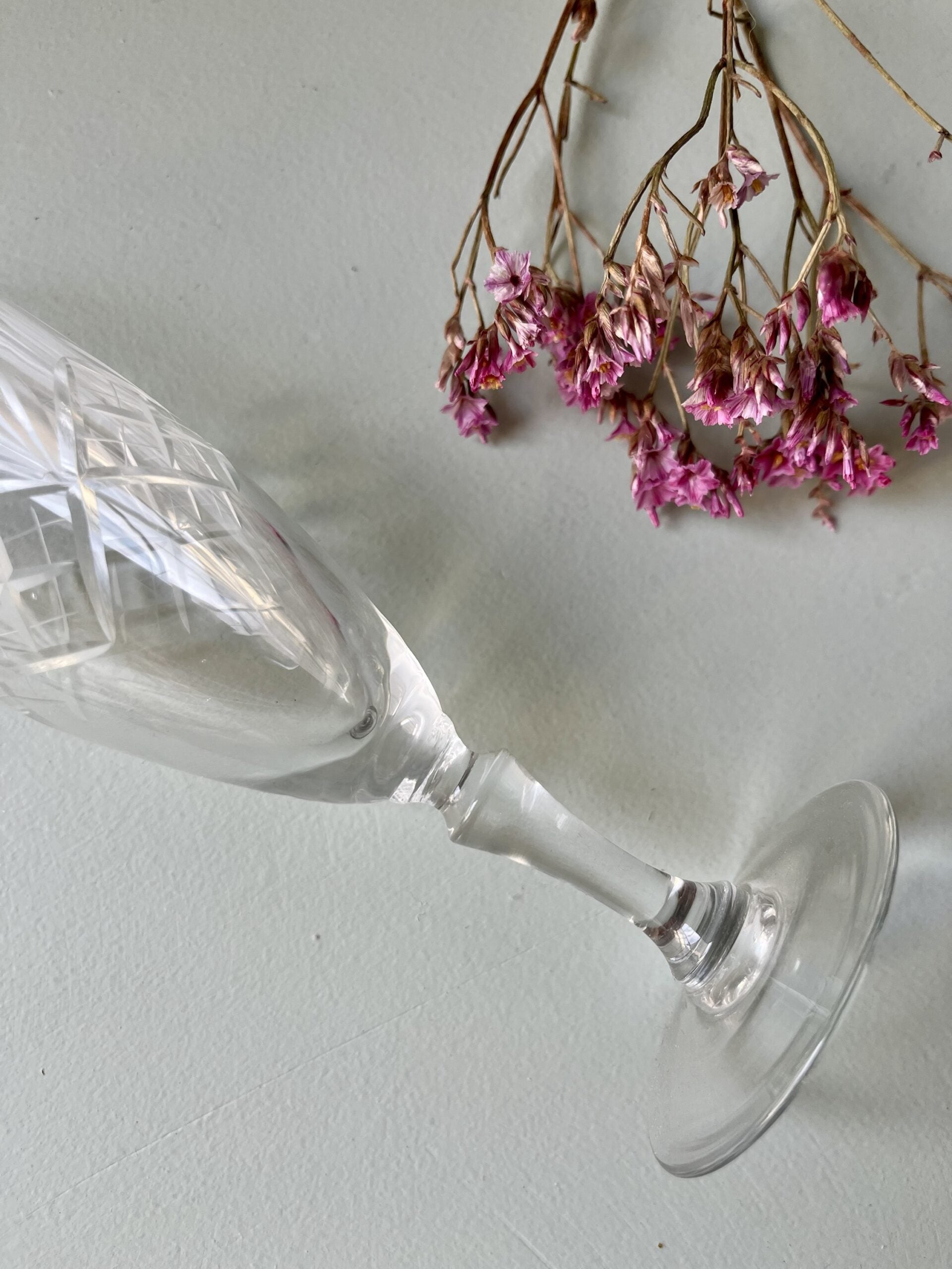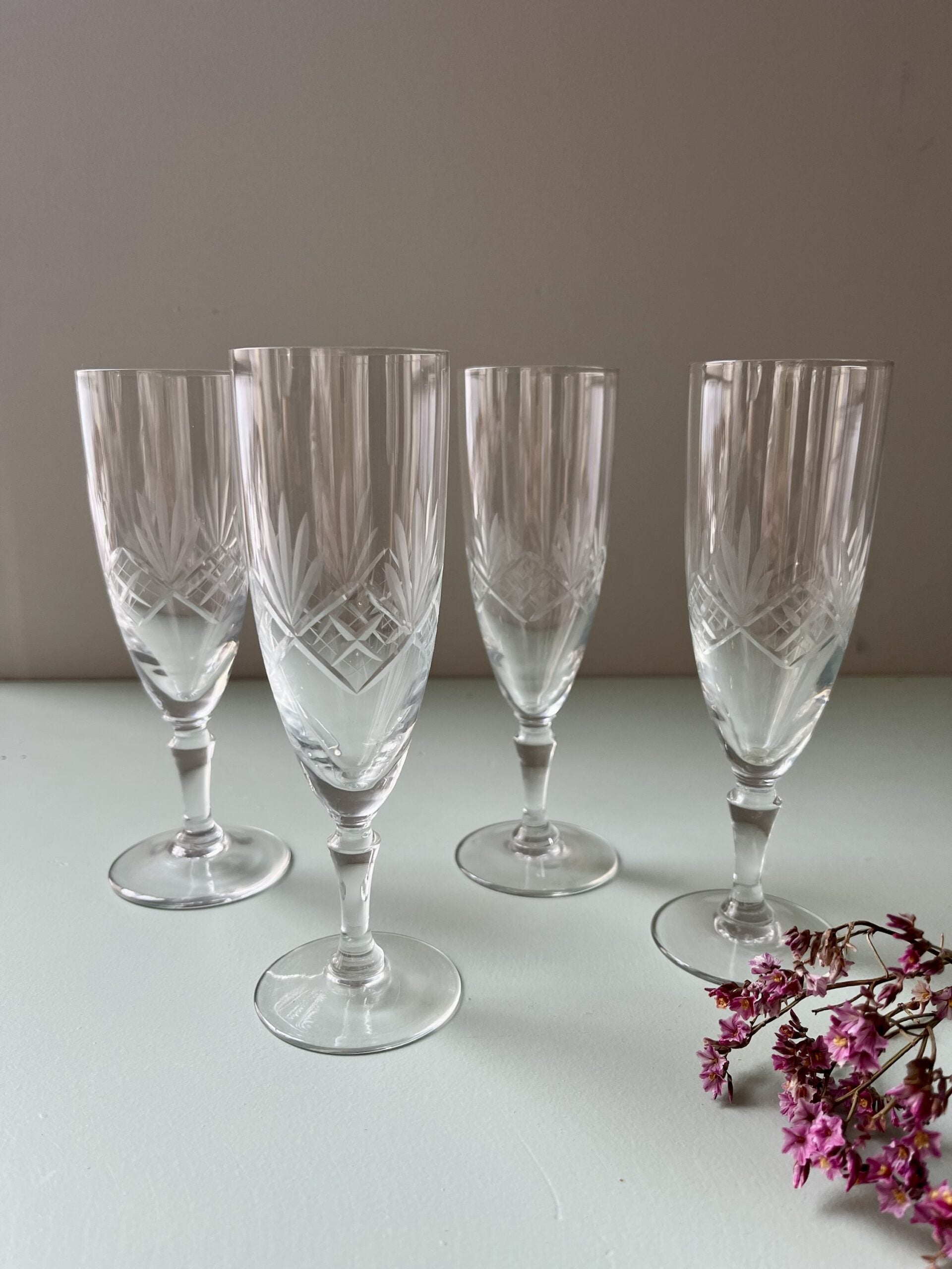 Lot de flûtes en cristal taillé fait main, avec décor gravé typique de la cristallerie artisanale ancienne. Le travail du cristal ancien accroche la lumière et met en valeur les bulles sur une table de fête.