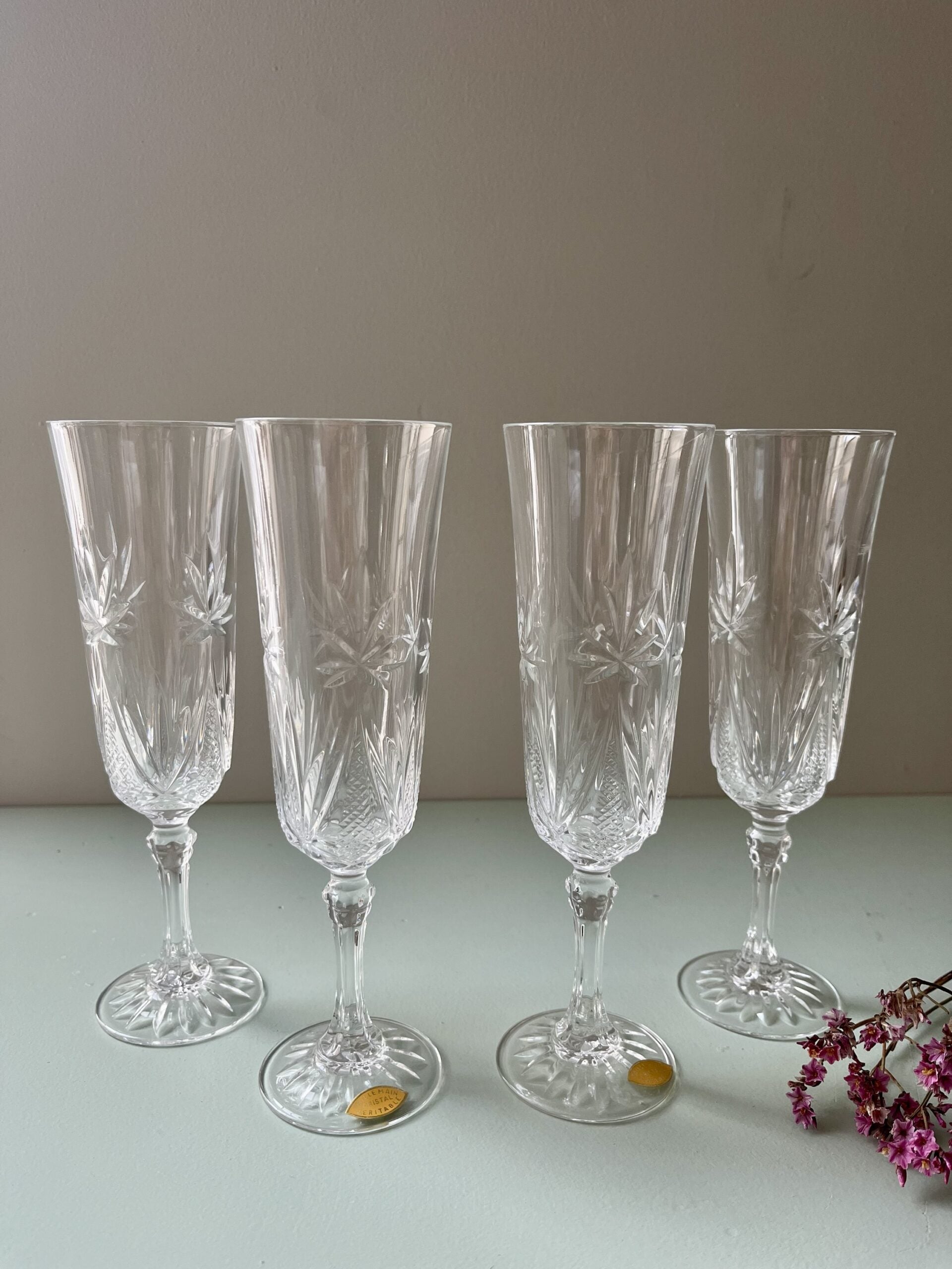 Lot de flûtes en cristal taillé fait main, avec décor gravé étoilé et géométrique typique de la cristallerie ancienne. Le travail du cristal ancien capte la lumière et met en valeur champagne, crémant ou vin effervescent sur une table de fête.