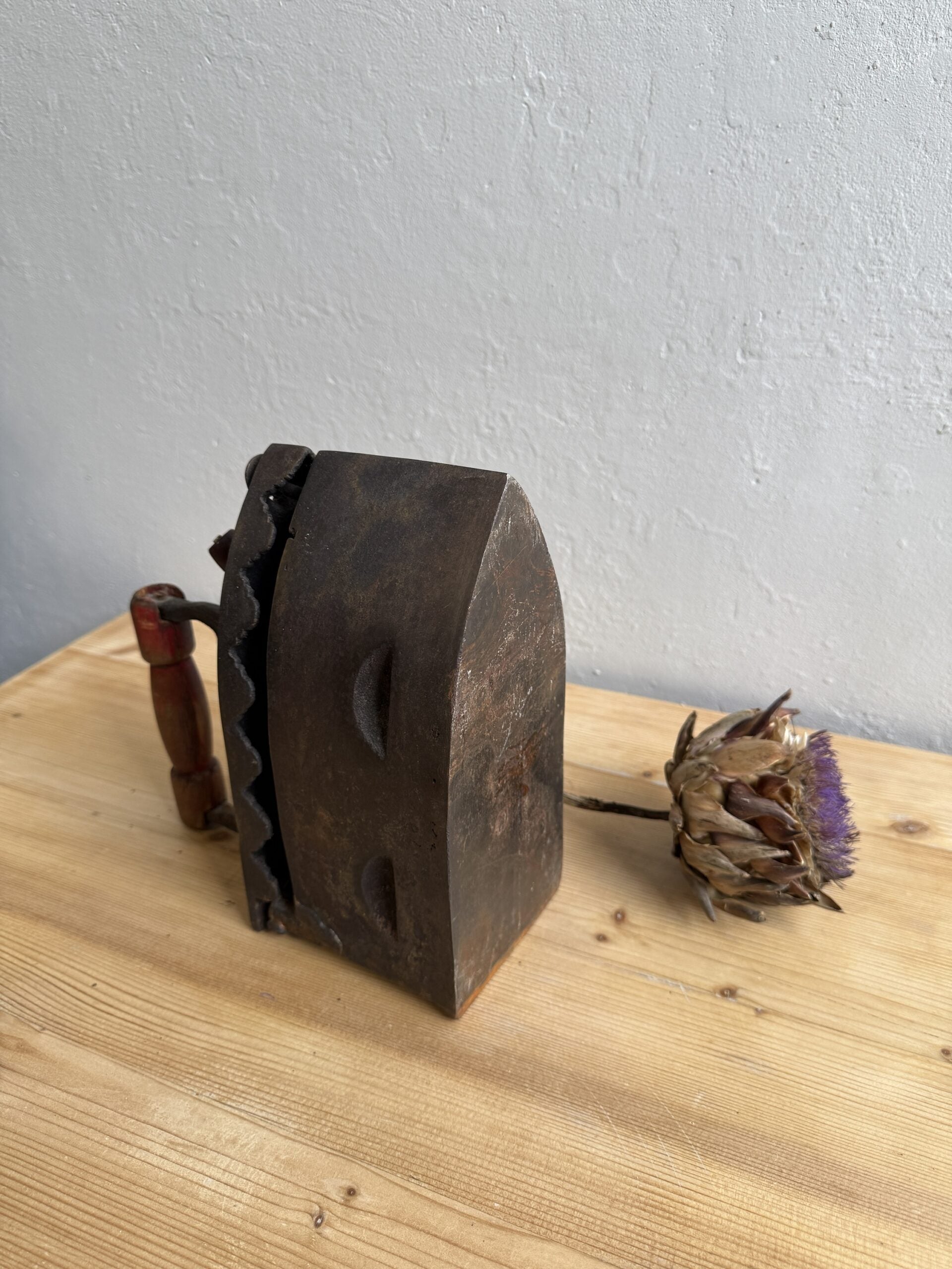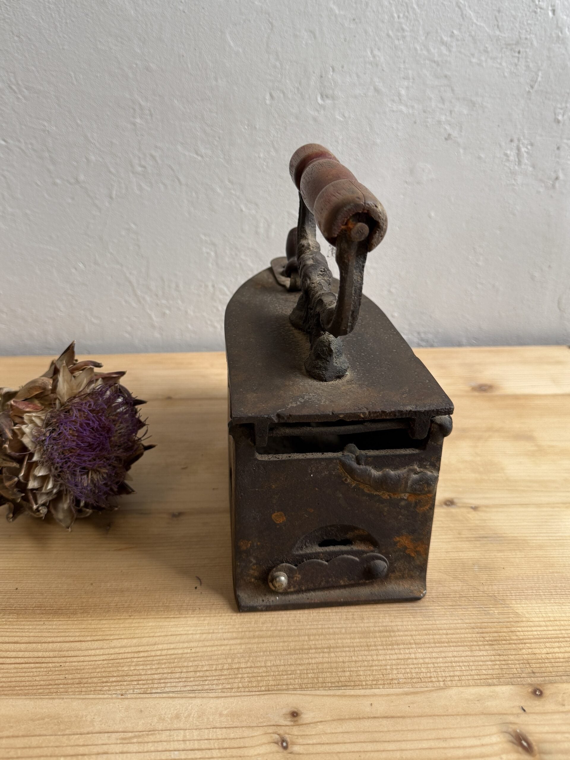 Fer à repasser ancien en métal, de grande taille, typique des modèles utilisés autrefois pour le linge. Objet décoratif idéal pour une collection, une mise en scène vintage ou pour apporter une touche d’authenticité à une cuisine ou une buanderie.