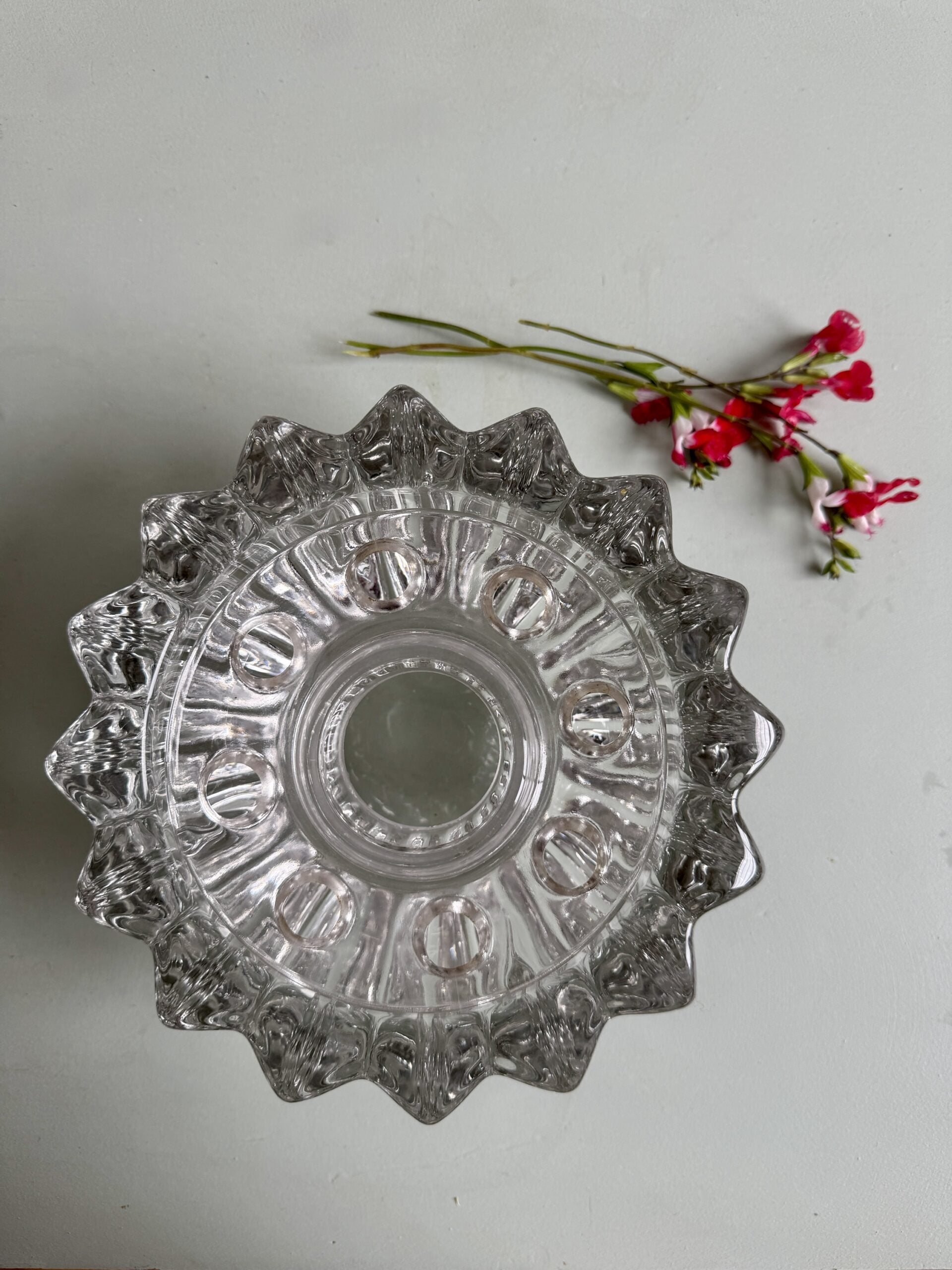 Grand pique-fleurs ancien en verre transparent. Sa forme circulaire avec plusieurs ouvertures permet de composer facilement des bouquets en maintenant chaque tige séparée.