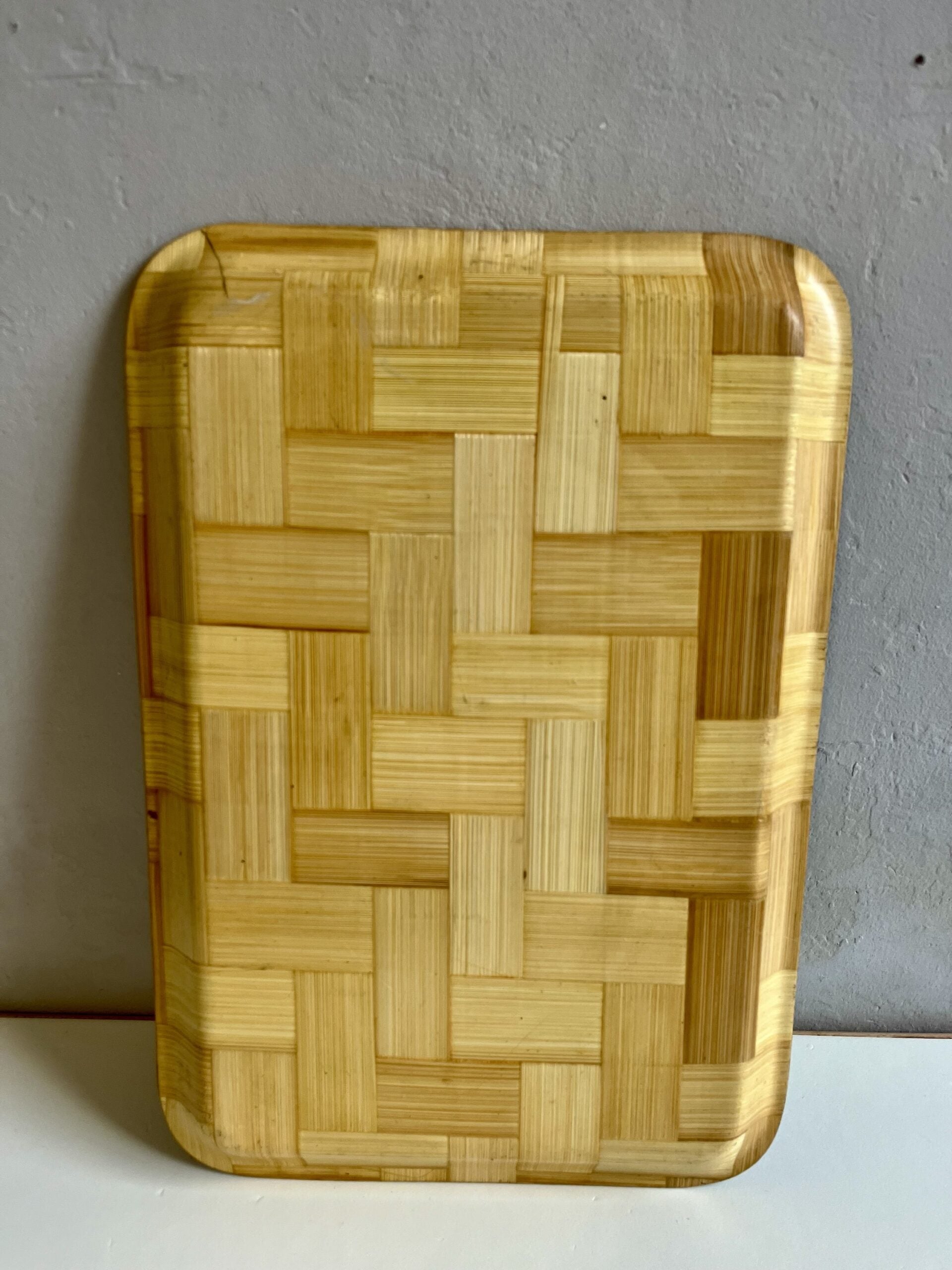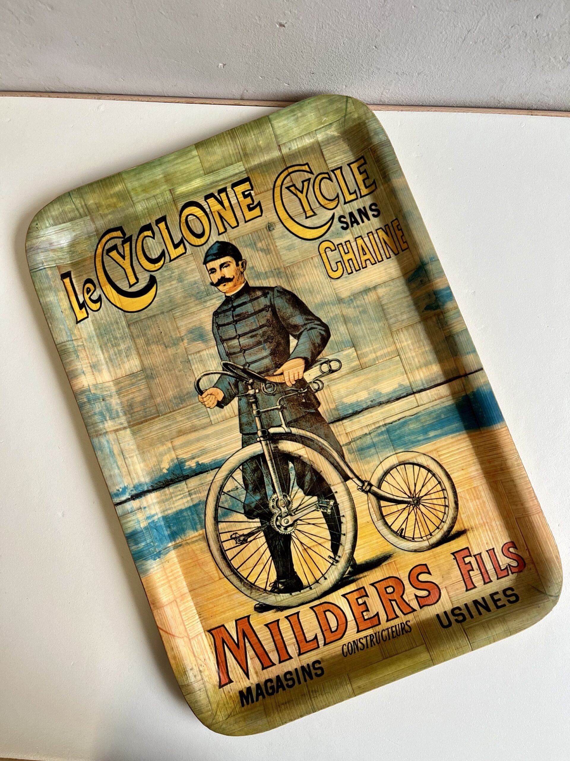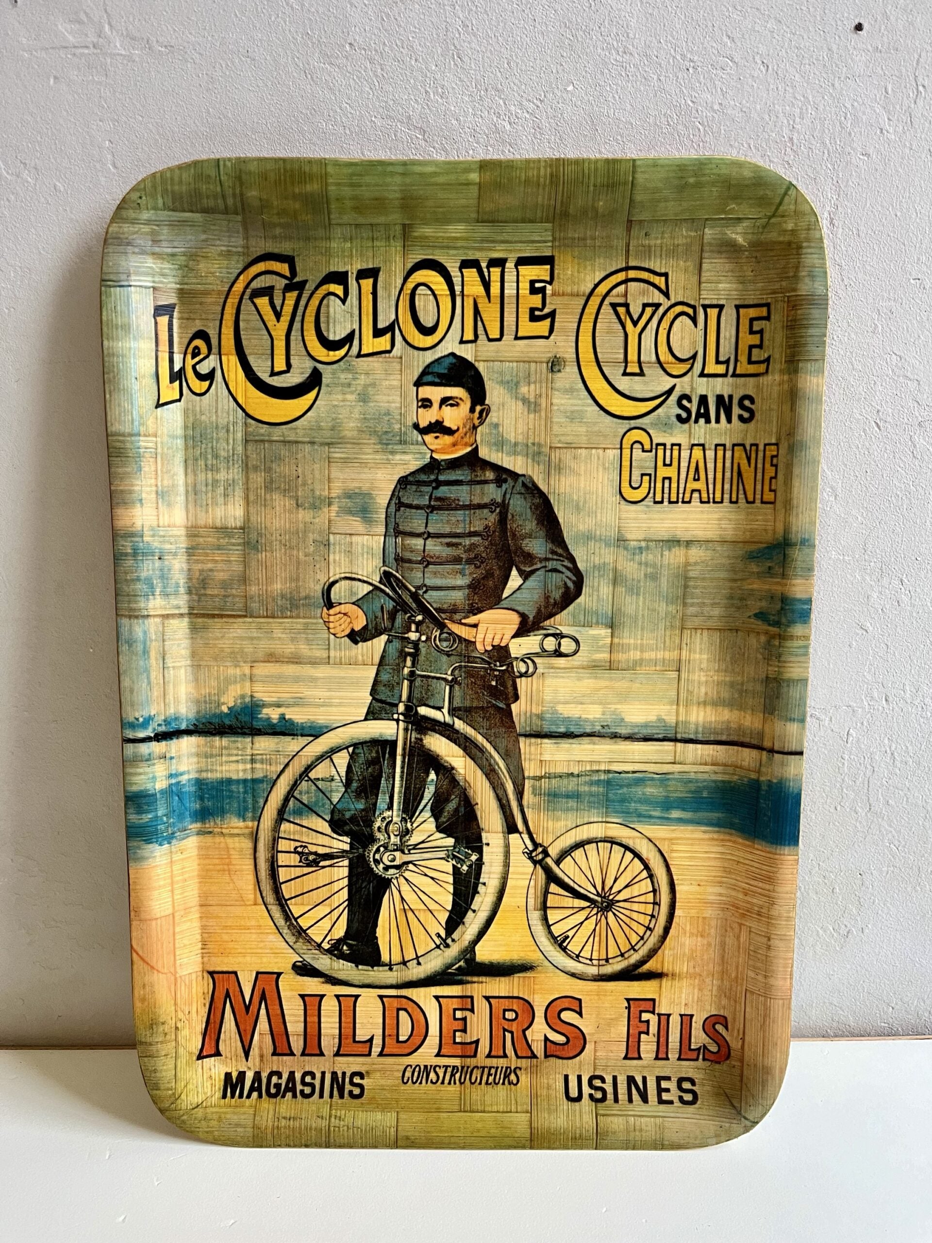 Grand plateau en bambou publicitaire des années 70/80, décoré d’un cycliste ancien et du nom "Le Cyclone" – Milders Fils. Une pièce typique de la décoration vintage qui attire tout de suite l’œil.