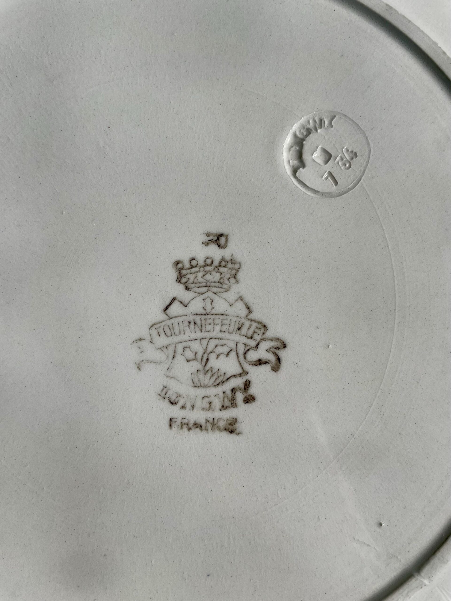 Grande assiette ancienne Longwy collection Tournefeuille, décorée de jolis motifs dans des teintes vertes caractéristiques de la faïence Longwy. Modèle apprécié pour son décor végétal et son style de vaisselle ancienne française.