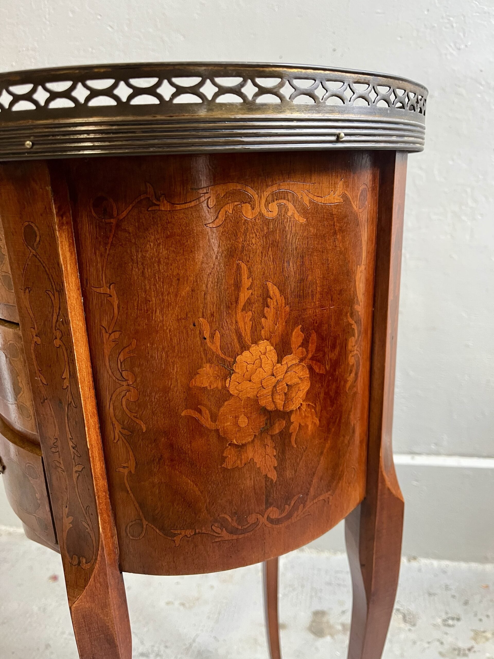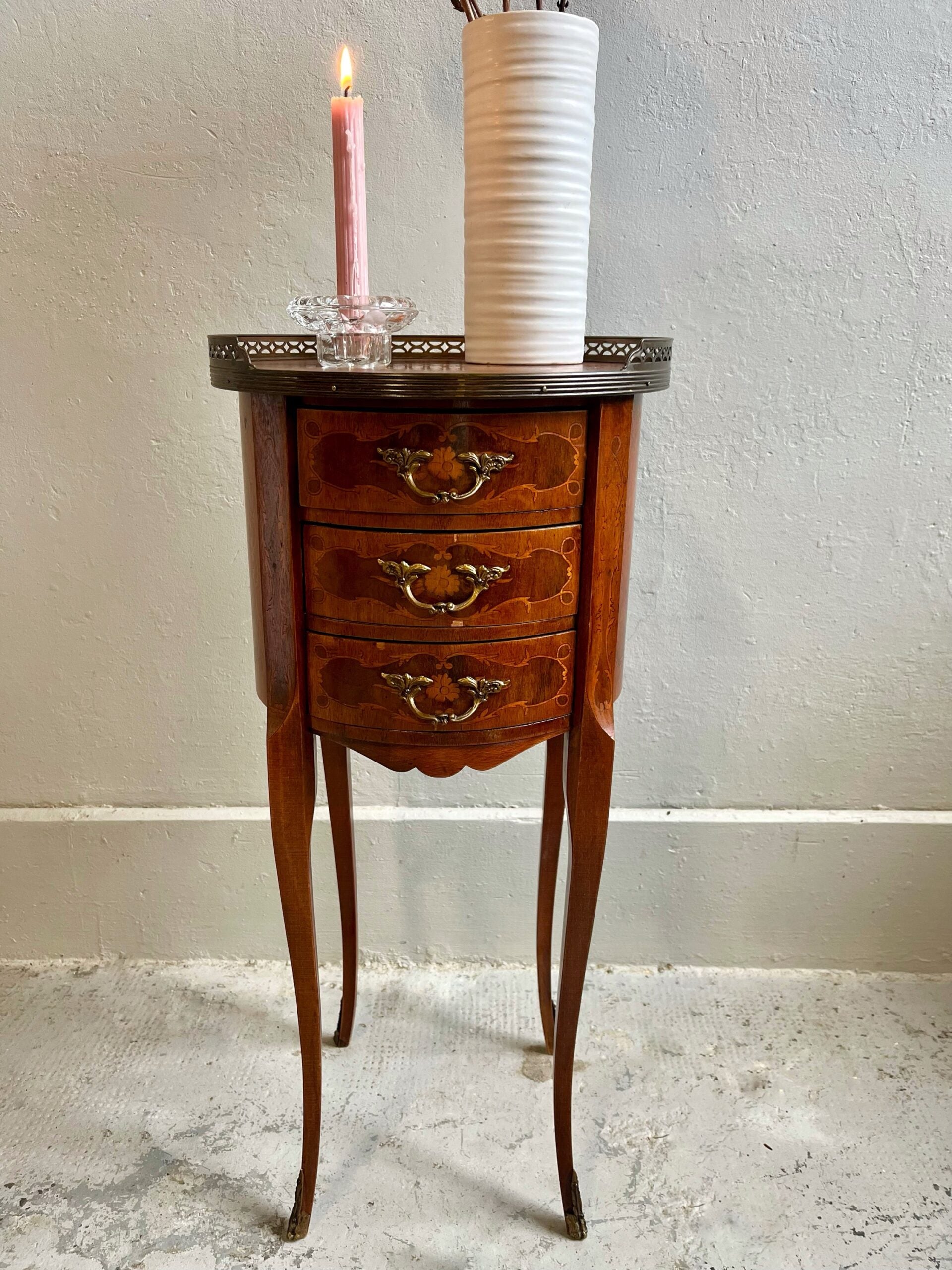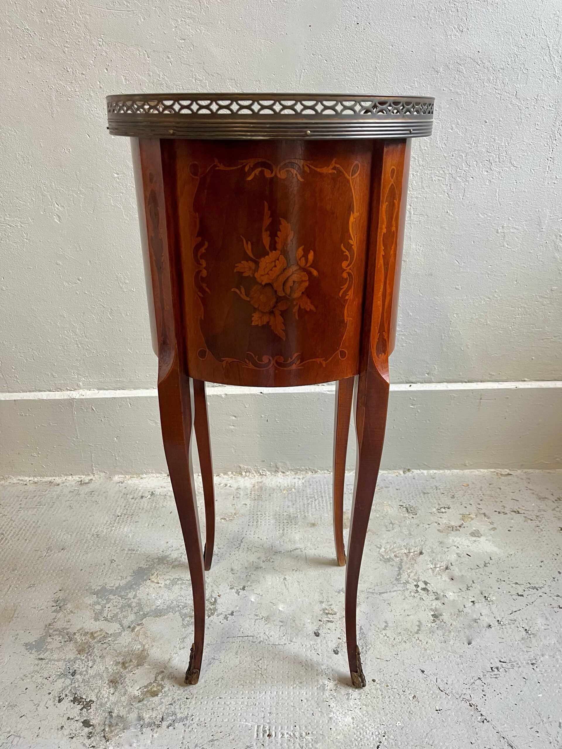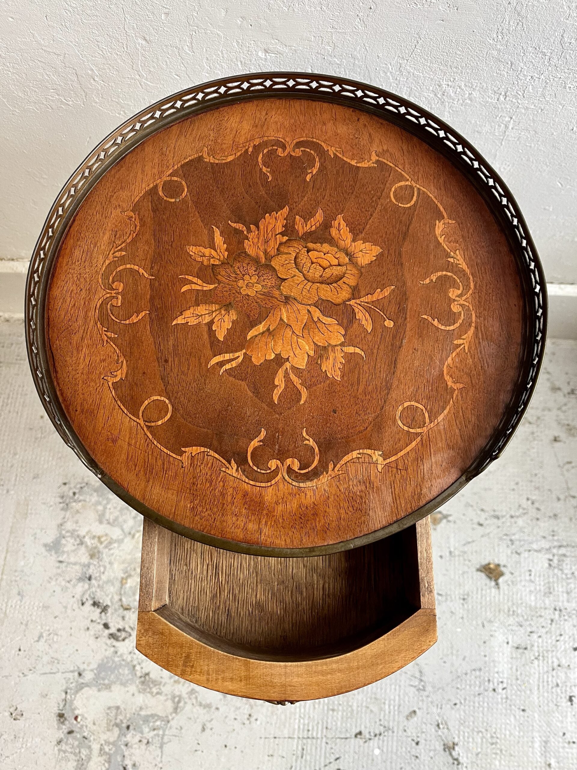 Guéridon ancien de style Louis XV, à plateau circulaire finement marqueté d’un décor floral central, entouré d’une galerie ajourée en laiton. Le piètement galbé, terminé par des sabots en laiton, donne au meuble une silhouette élancée et facile à intégrer dans différents espaces.La présence de trois tiroirs en ceinture apporte un vrai côté pratique, assez rare sur ce format. La marqueterie se prolonge également sur les côtés, avec des motifs floraux et des filets décoratifs visibles sous tous les angles. Un petit meuble plein de caractère, idéal en bout de canapé, table d’appoint ou table de chevet.