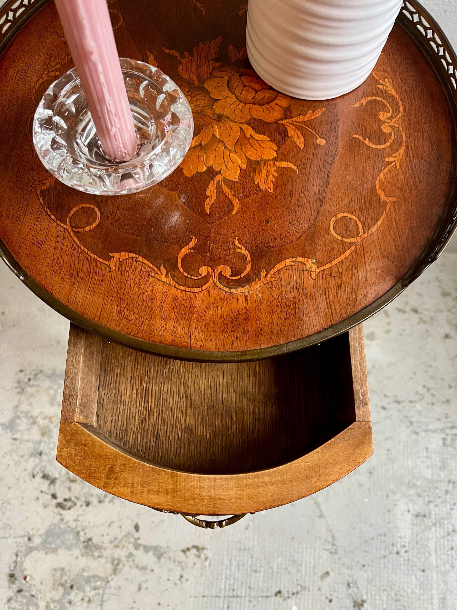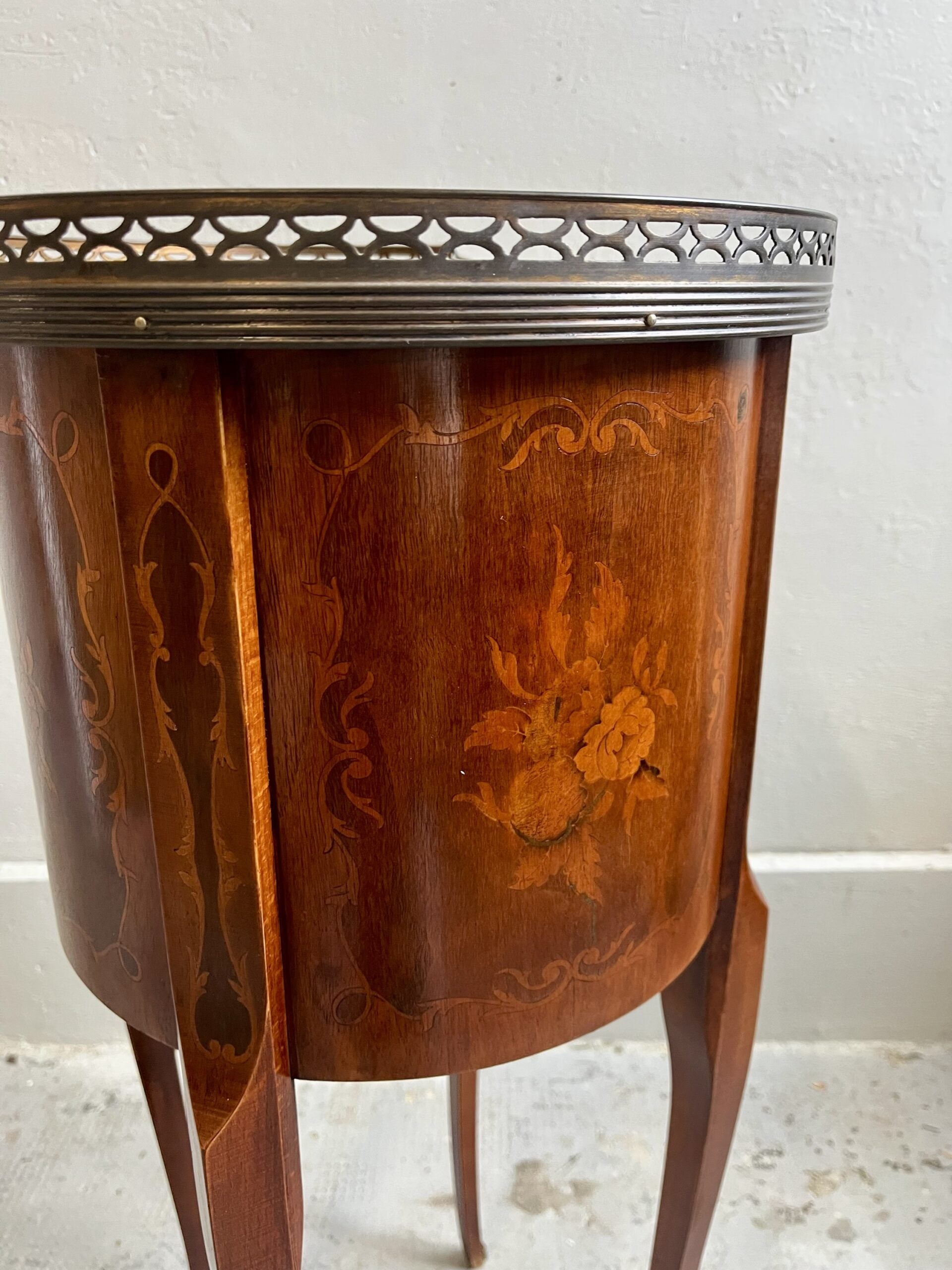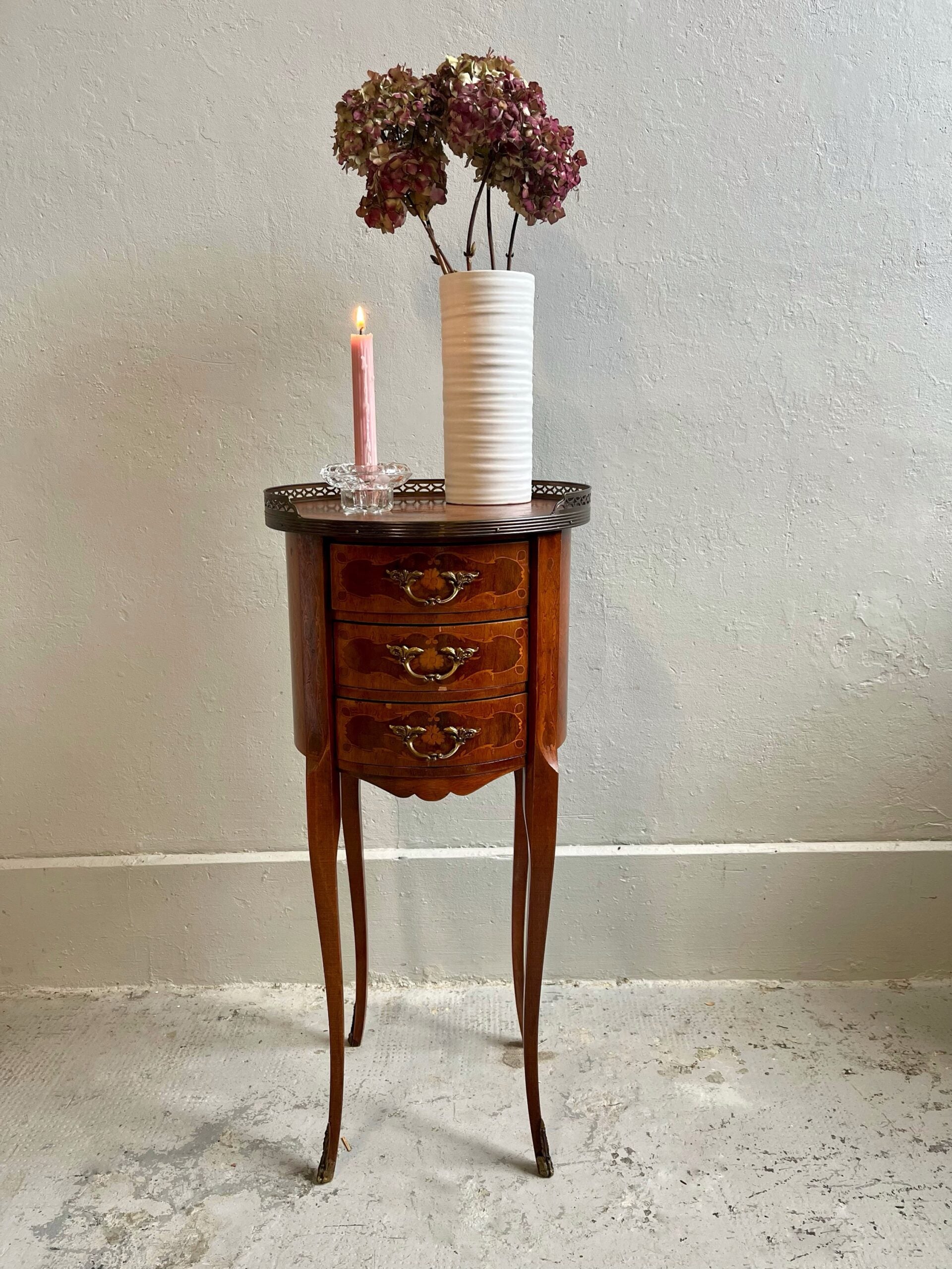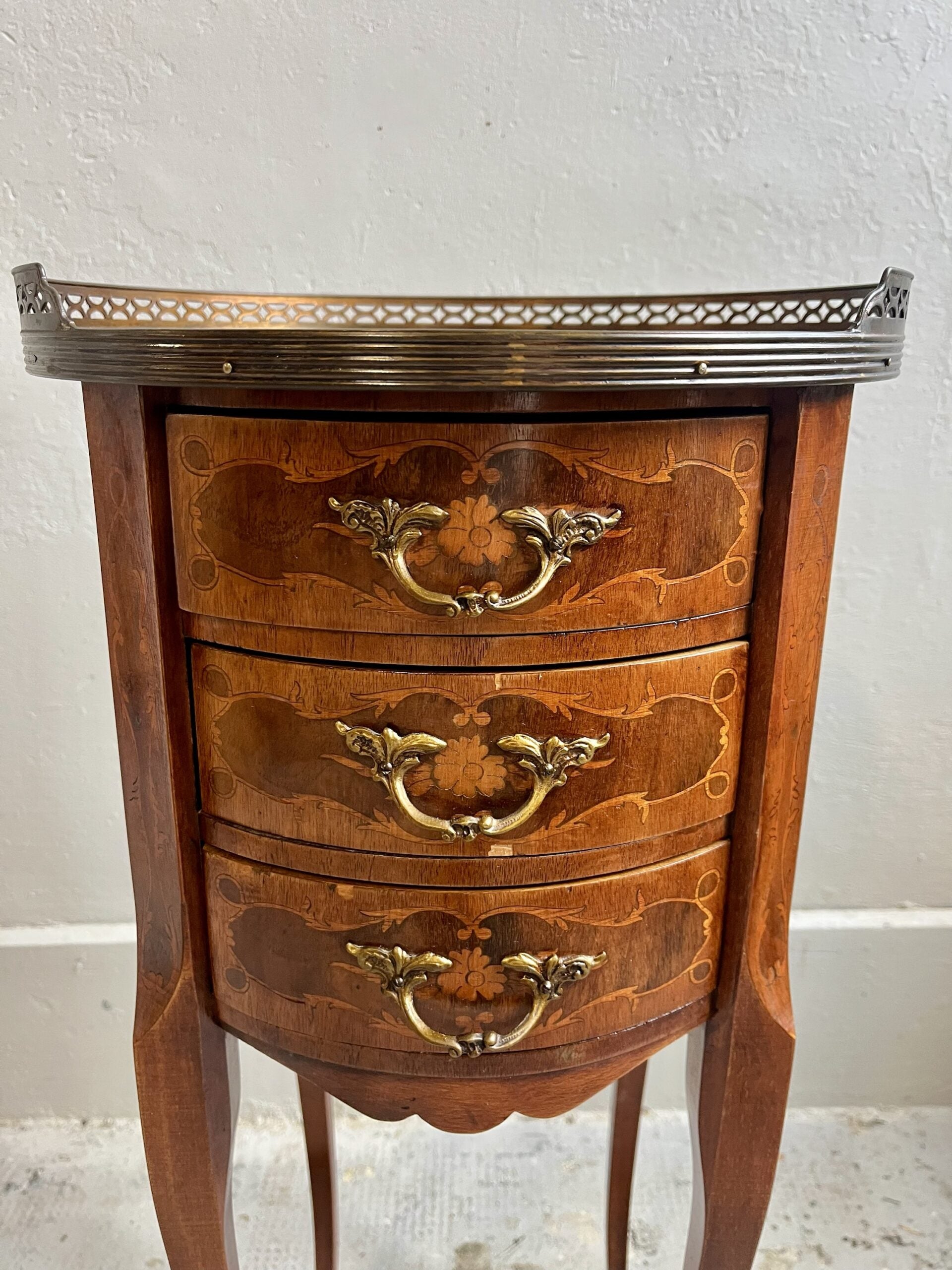Guéridon ancien de style Louis XV, à plateau circulaire finement marqueté d’un décor floral central, entouré d’une galerie ajourée en laiton. Le piètement galbé, terminé par des sabots en laiton, donne au meuble une silhouette élancée et facile à intégrer dans différents espaces.La présence de trois tiroirs en ceinture apporte un vrai côté pratique, assez rare sur ce format. La marqueterie se prolonge également sur les côtés, avec des motifs floraux et des filets décoratifs visibles sous tous les angles. Un petit meuble plein de caractère, idéal en bout de canapé, table d’appoint ou table de chevet.