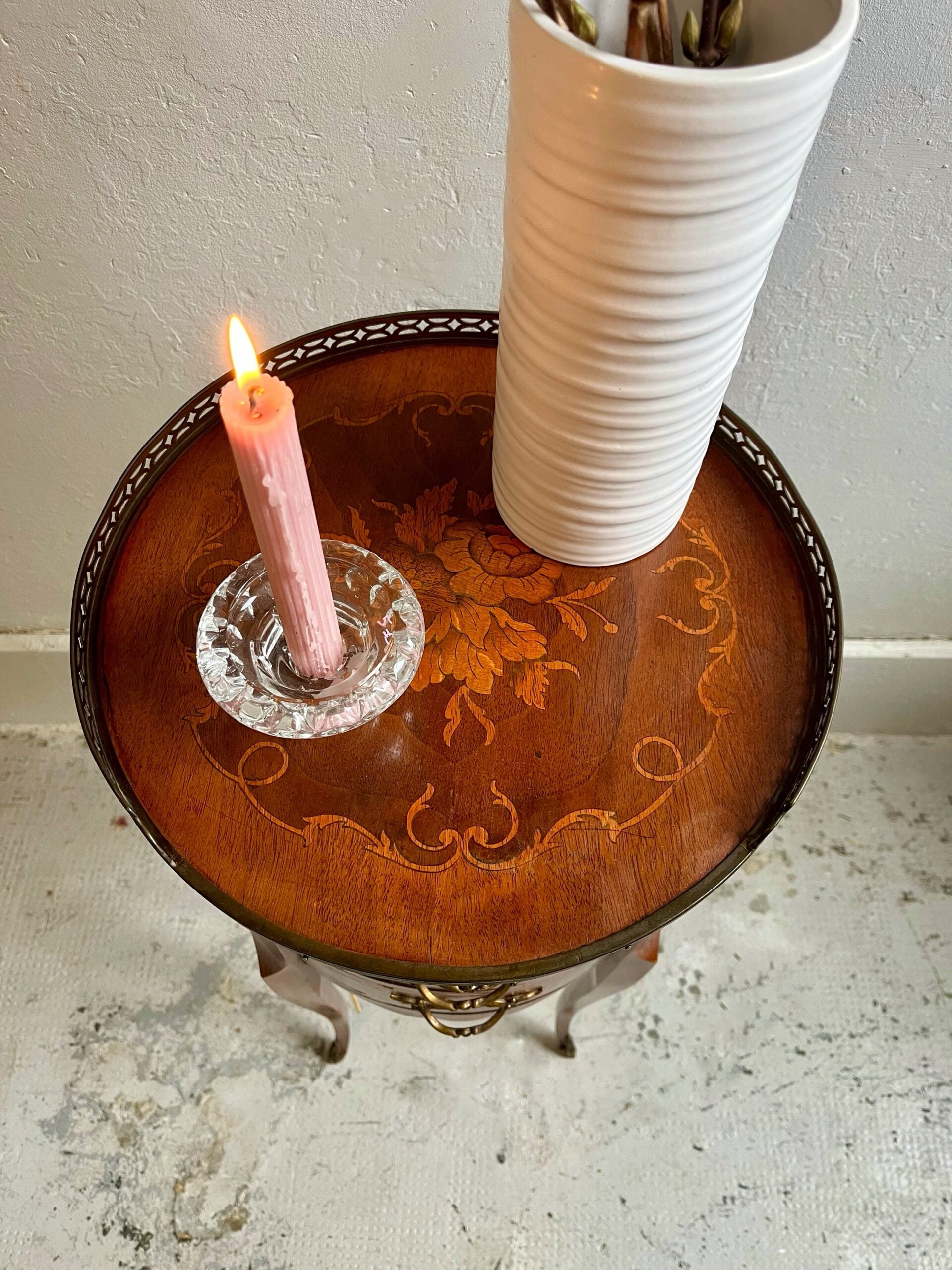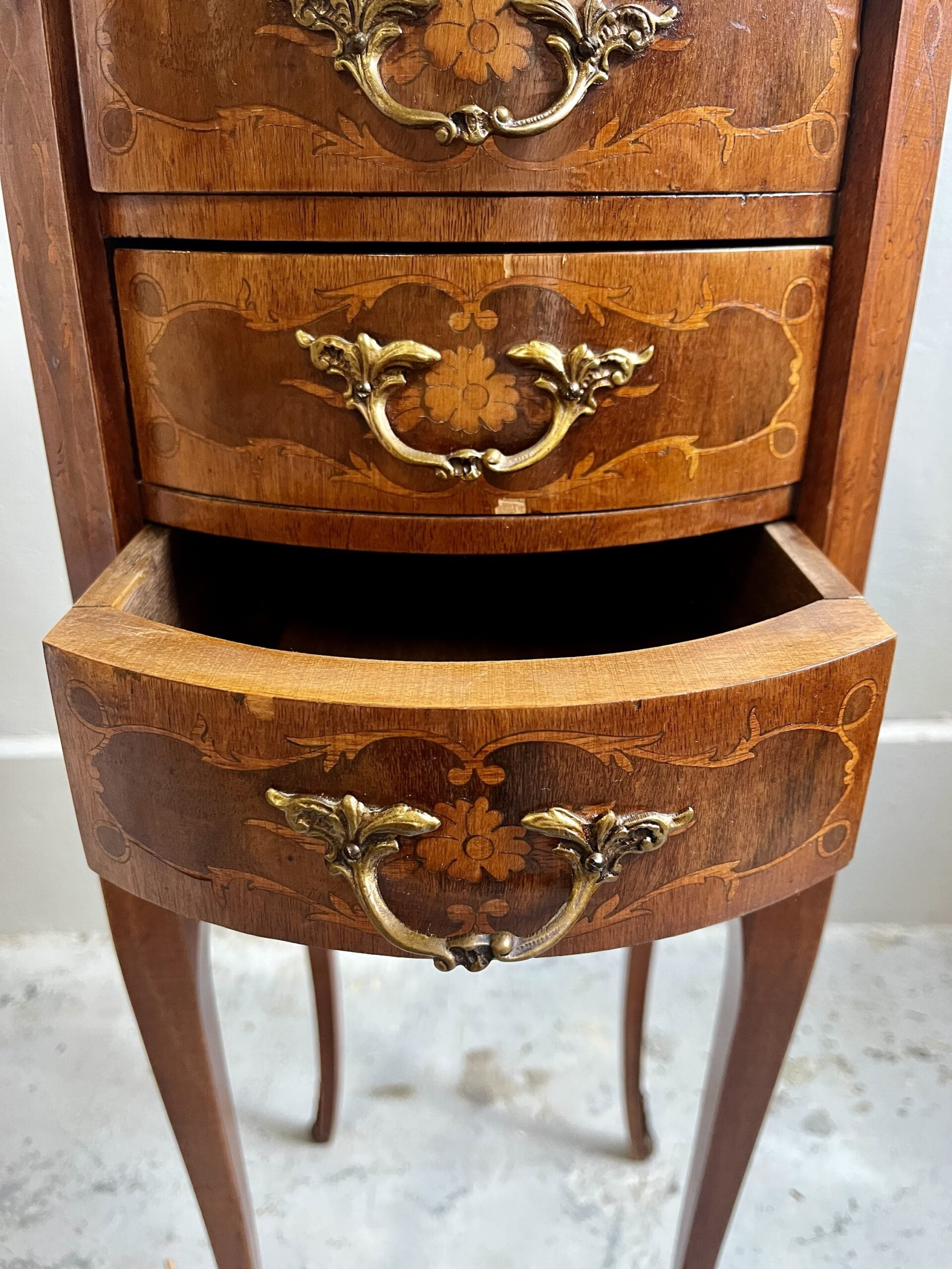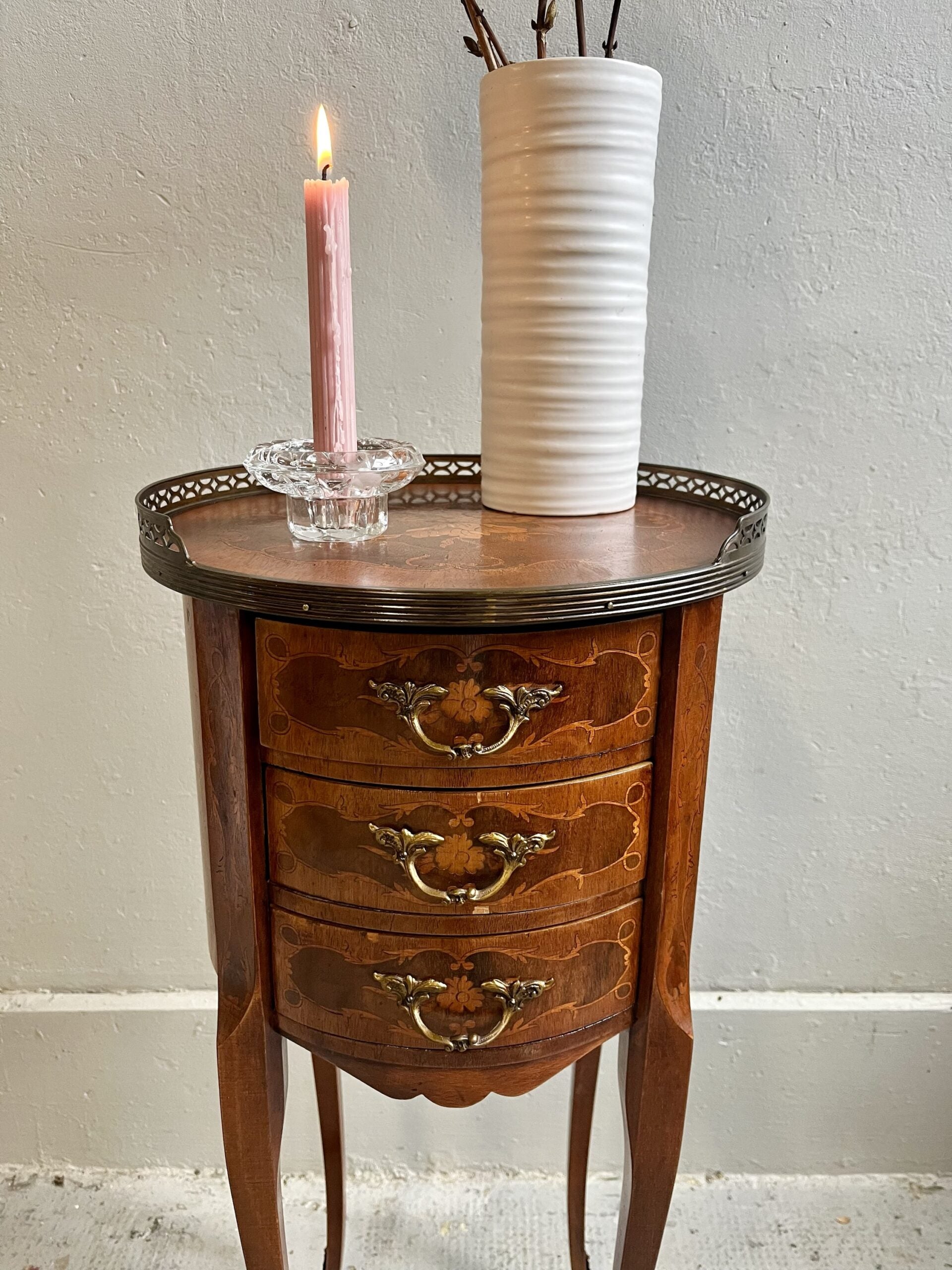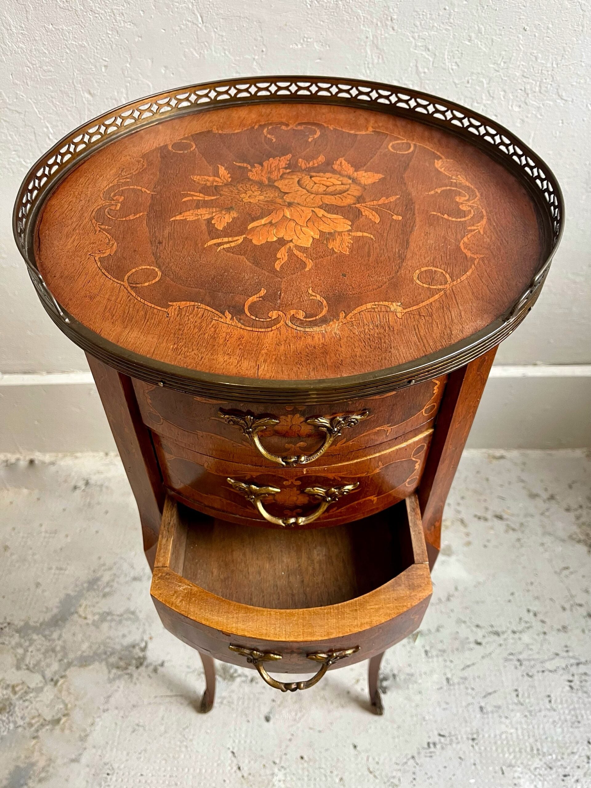 Guéridon ancien de style Louis XV, à plateau circulaire finement marqueté d’un décor floral central, entouré d’une galerie ajourée en laiton. Le piètement galbé, terminé par des sabots en laiton, donne au meuble une silhouette élancée et facile à intégrer dans différents espaces.La présence de trois tiroirs en ceinture apporte un vrai côté pratique, assez rare sur ce format. La marqueterie se prolonge également sur les côtés, avec des motifs floraux et des filets décoratifs visibles sous tous les angles. Un petit meuble plein de caractère, idéal en bout de canapé, table d’appoint ou table de chevet.