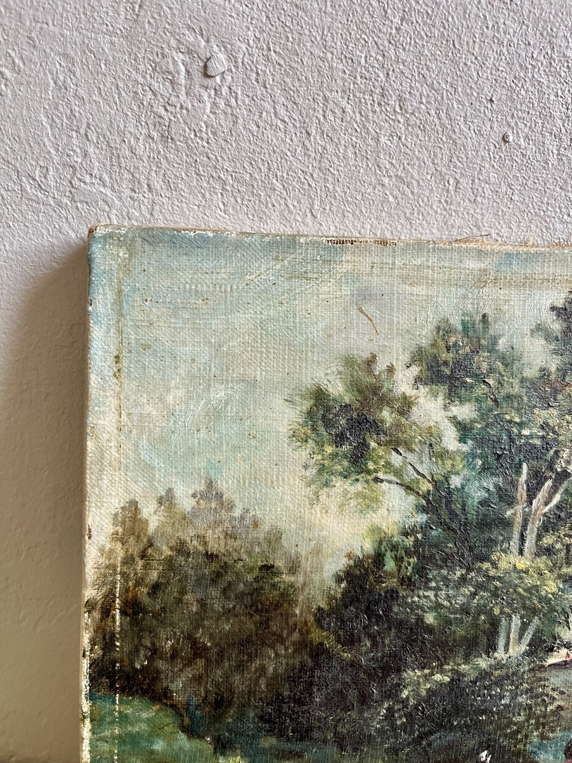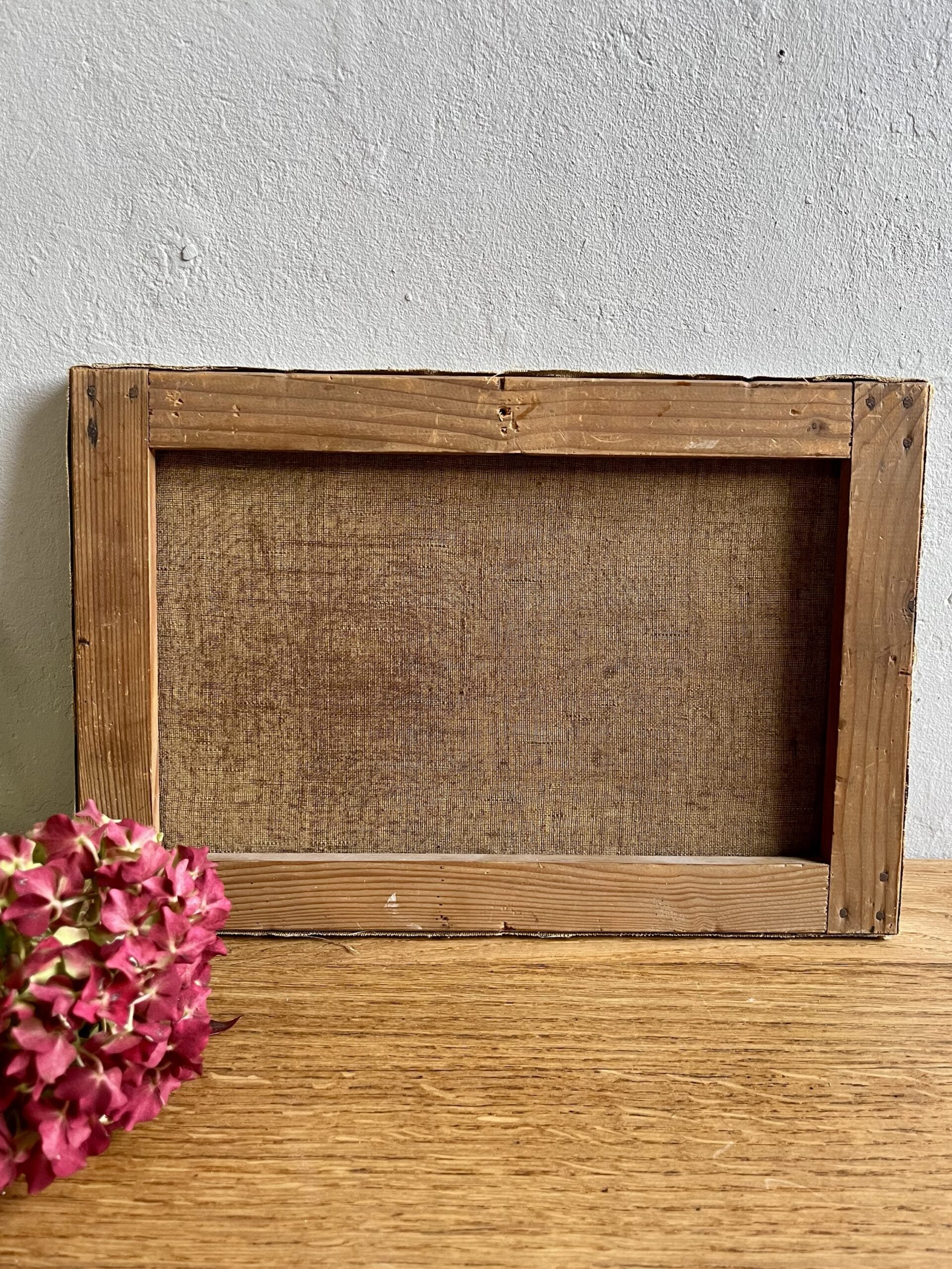 Cette peinture, montée sur son châssis d’origine en bois brut, a traversé le temps avec élégance. Quelques marques du temps sont visibles mais n’enlèvent rien à son charme d’antan.