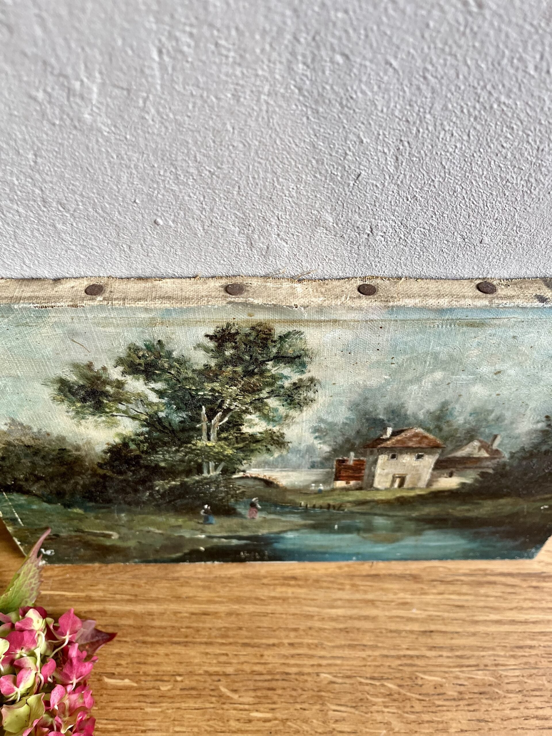 Charmante huile sur toile ancienne représentant une scène bucolique : un paysage de campagne avec une rivière, un petit pont de pierre et quelques personnages au bord de l’eau, devant des maisons aux toits rouges.