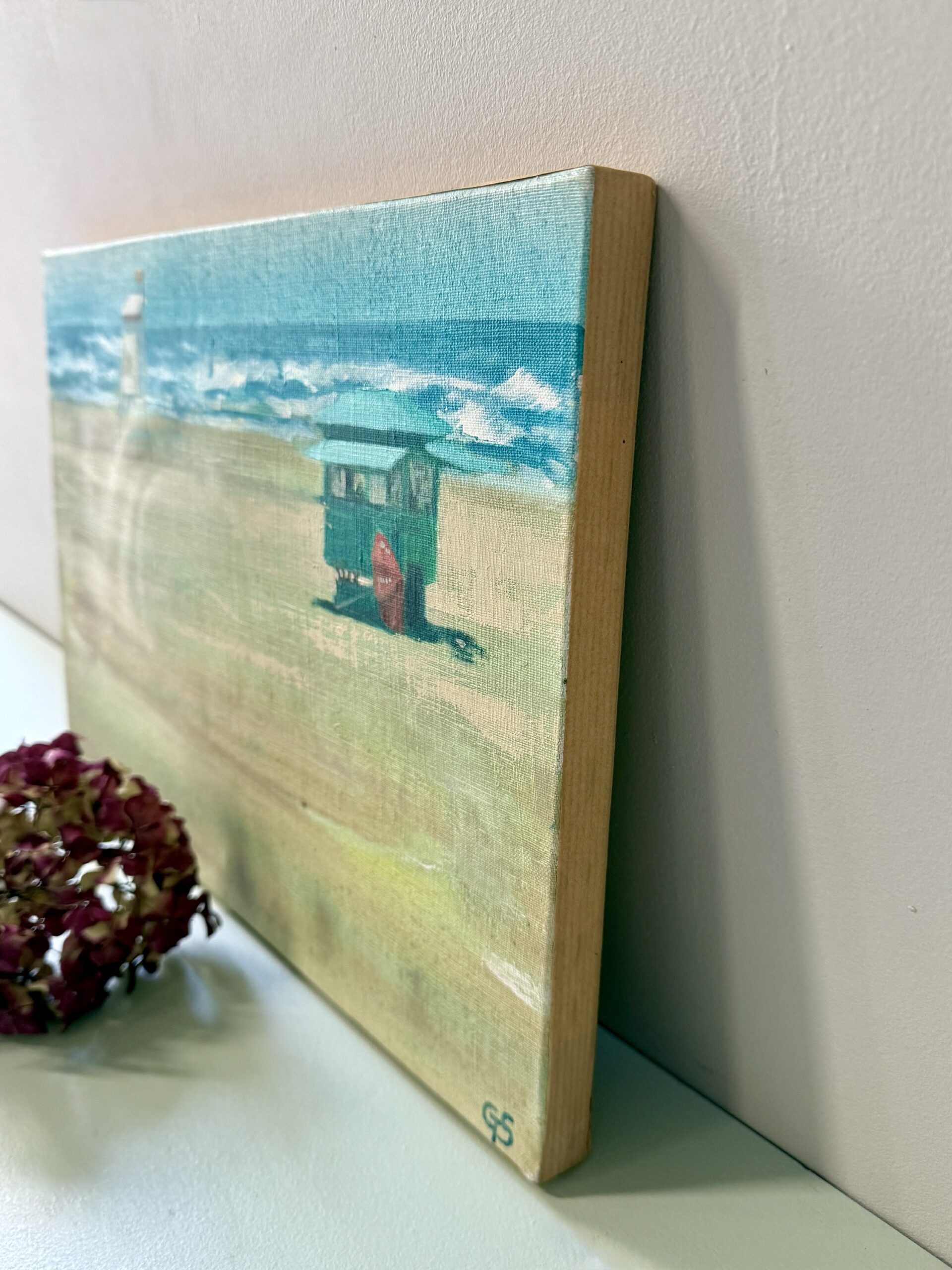 Cette peinture représente une vaste étendue de sable texturé sur laquelle se détachent deux postes de secours, l’un blanc et l’autre vert. La composition est volontairement épurée, laissant une large place aux matières et aux touches visibles qui structurent le paysage.