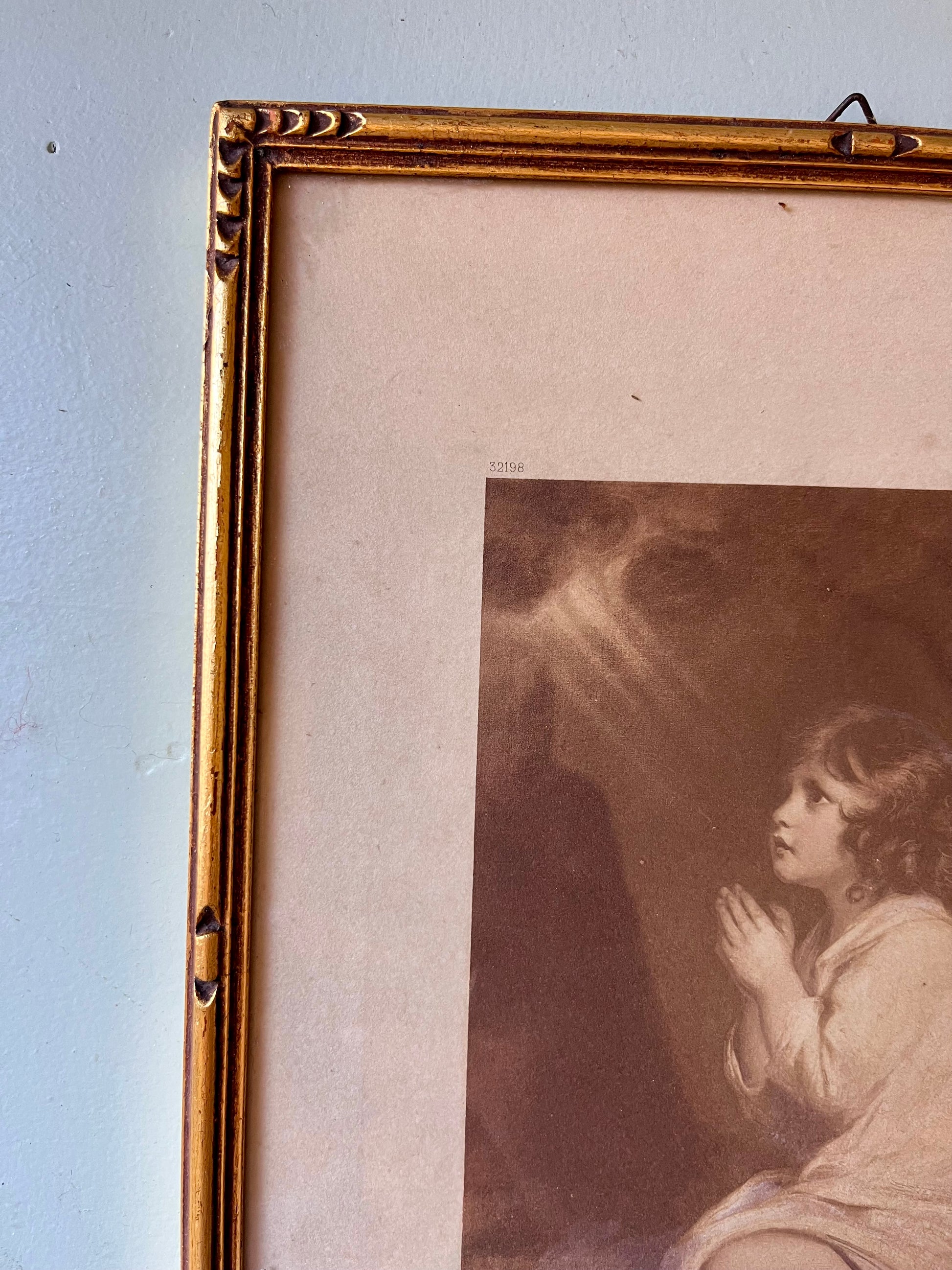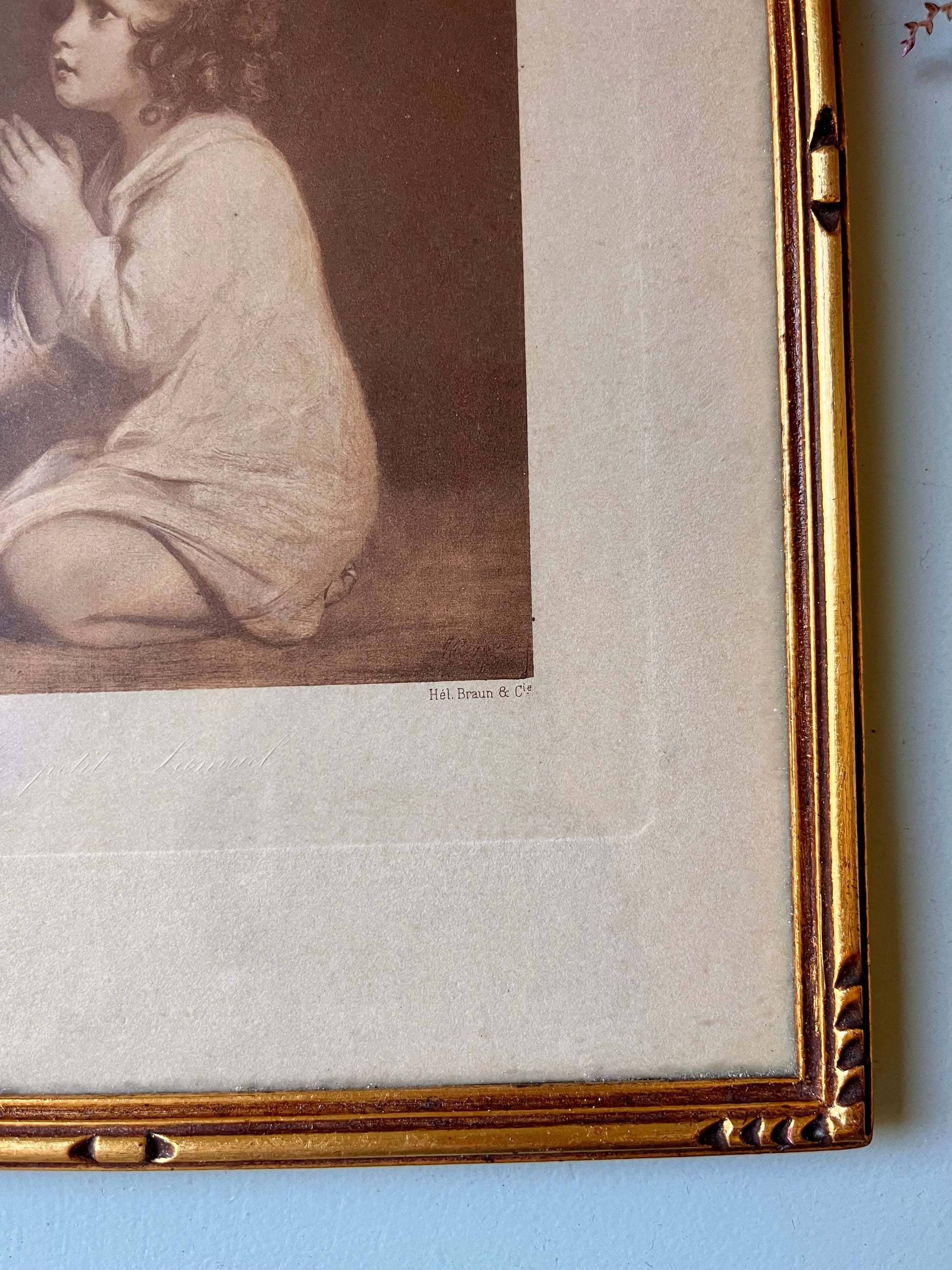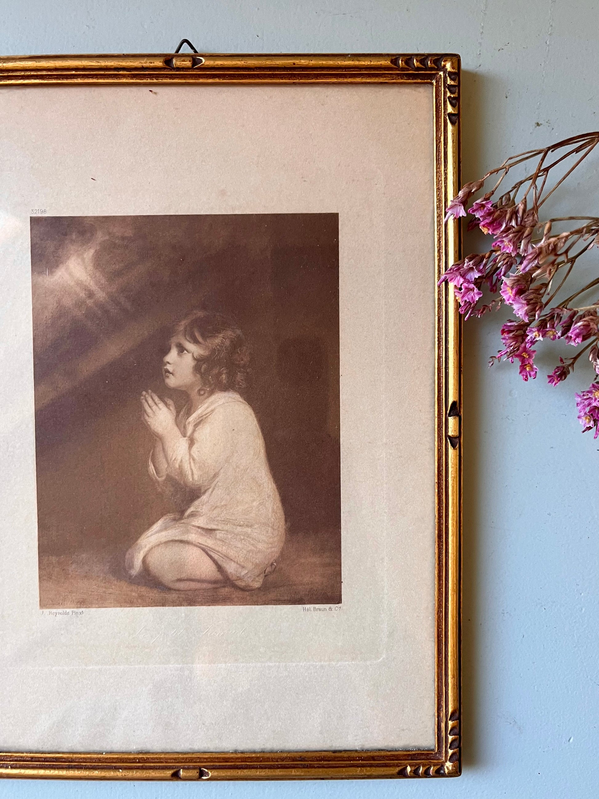 Cadre ancien en bois doré renfermant une reproduction religieuse aux tons sépia représentant un enfant en prière. L’ensemble dégage une atmosphère douce et ancienne, typique des images pieuses du début/milieu du XXe siècle.