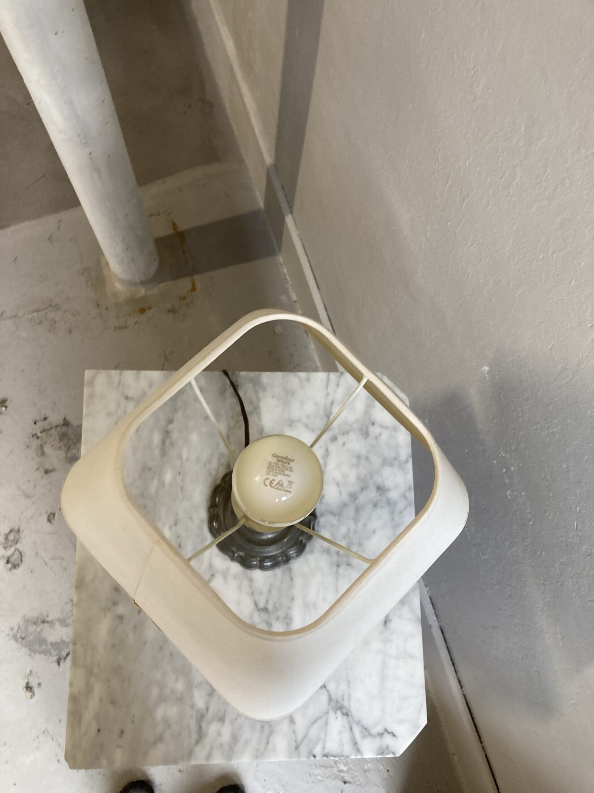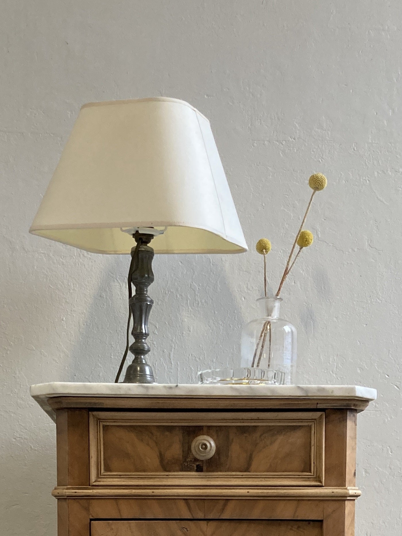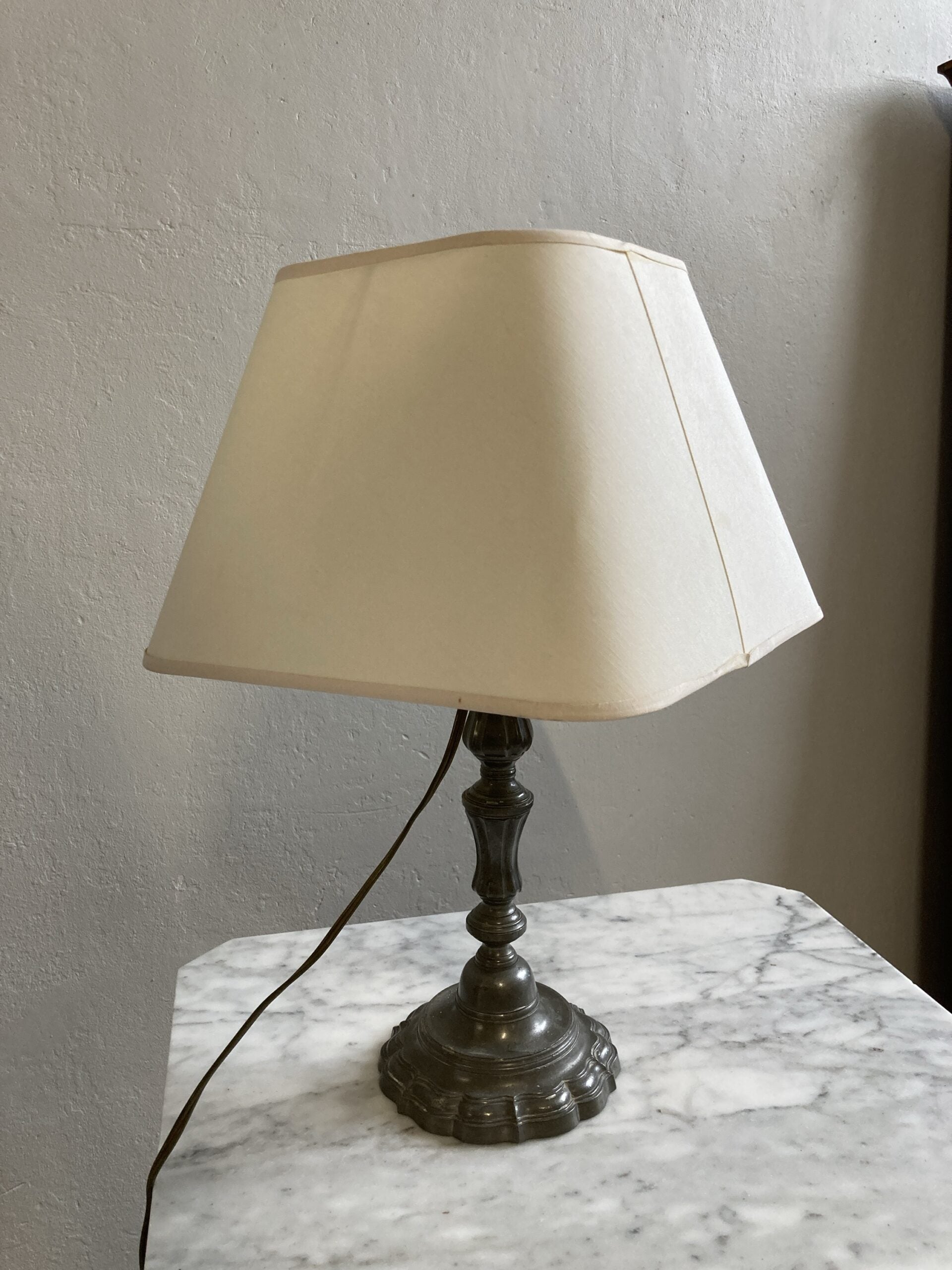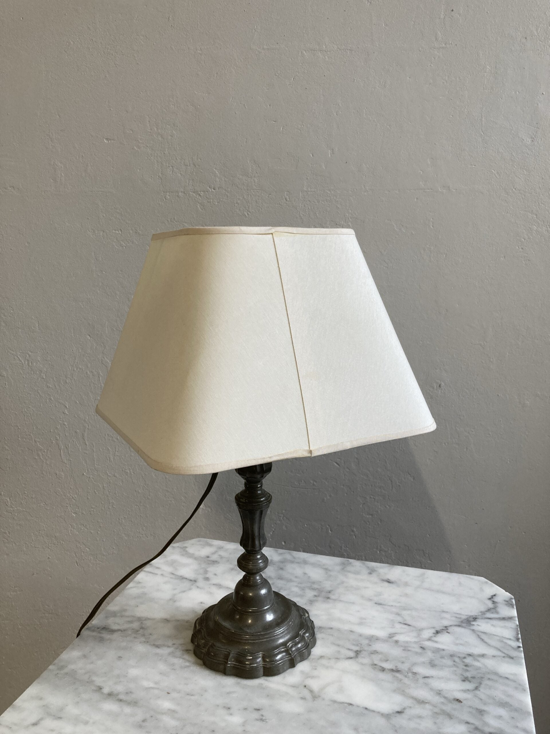 Lampe de chevet ancienne en étain patiné – Abat-jour écru