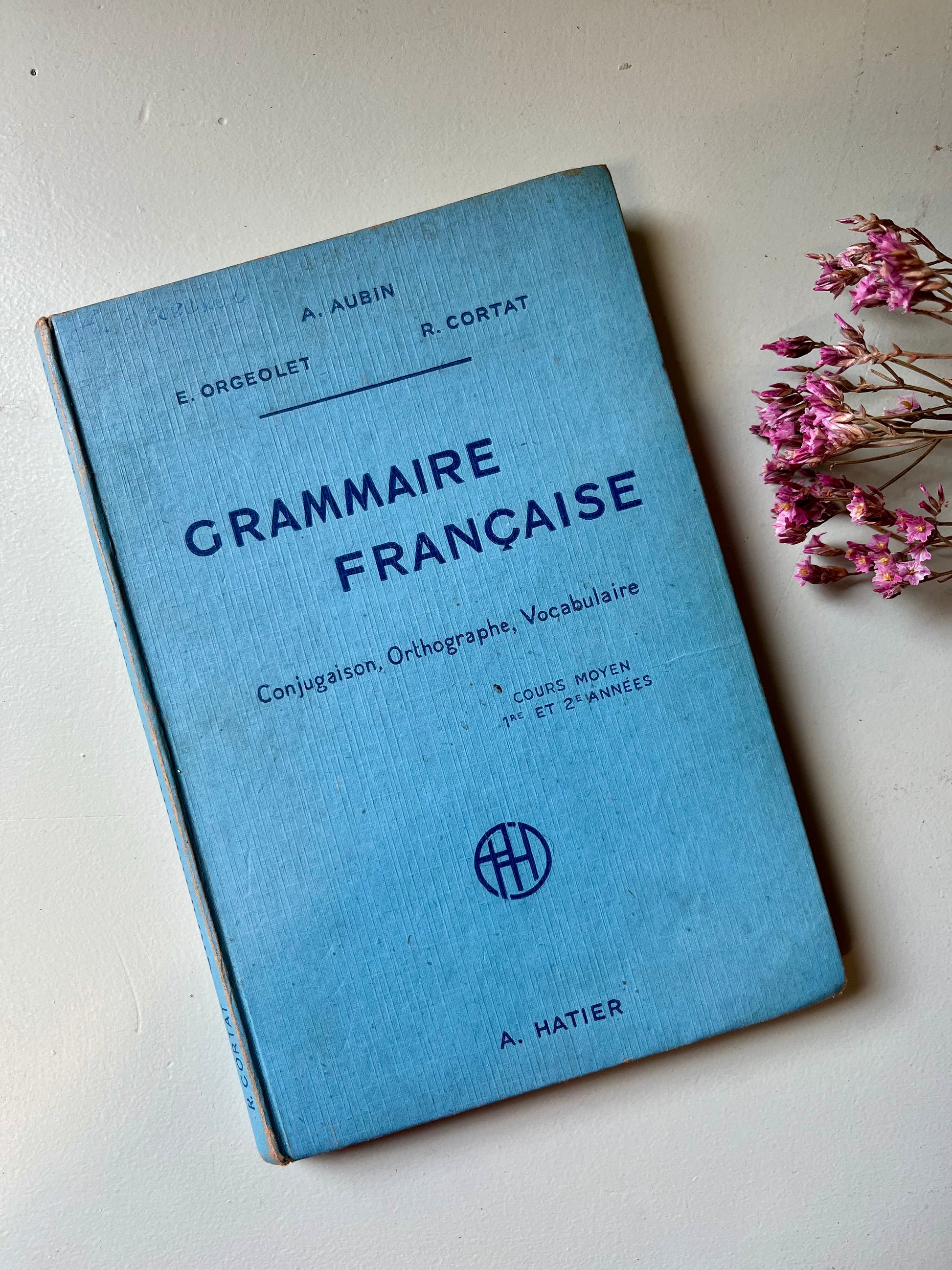 Grammaire Française ancien manuel scolaire édité chez Hatier, avec sa couverture cartonnée bleue typique des livres d’école d’autrefois. Un classique des salles de classe, consacré à la conjugaison, l’orthographe et au vocabulaire.