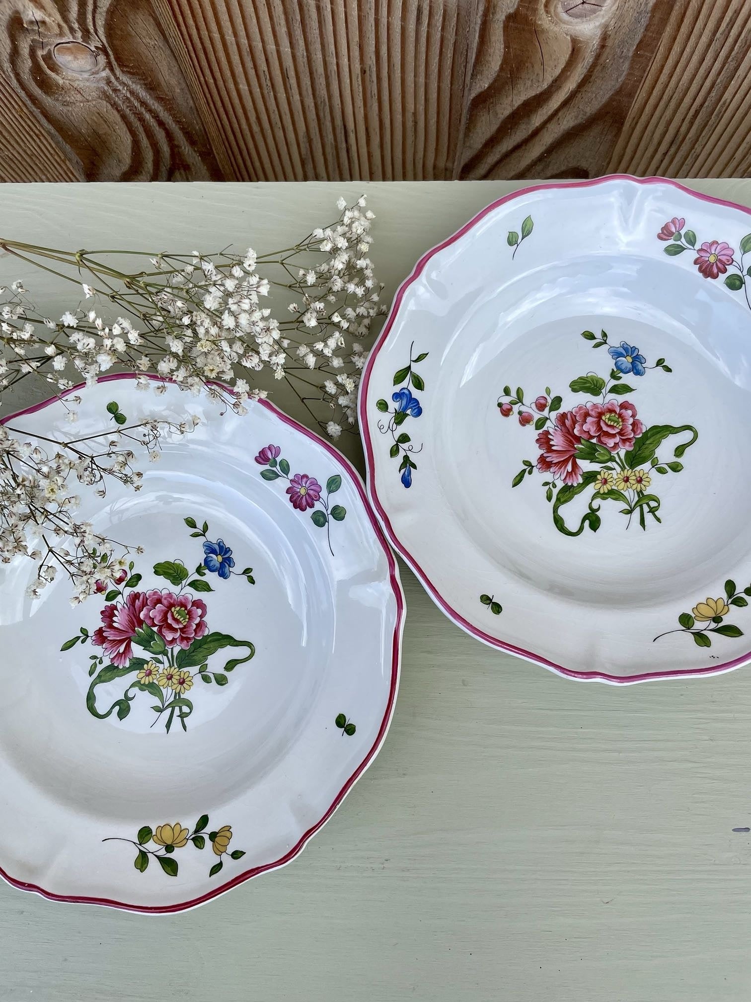 Assiettes creuses Vieux Saint-Amand en faïence ancienne, décorées d’un bouquet floral central aux tons rose, bleu et jaune, avec bord festonné souligné d’un liseré rose. Modèle typique de la vaisselle ancienne française du début du XXᵉ siècle.