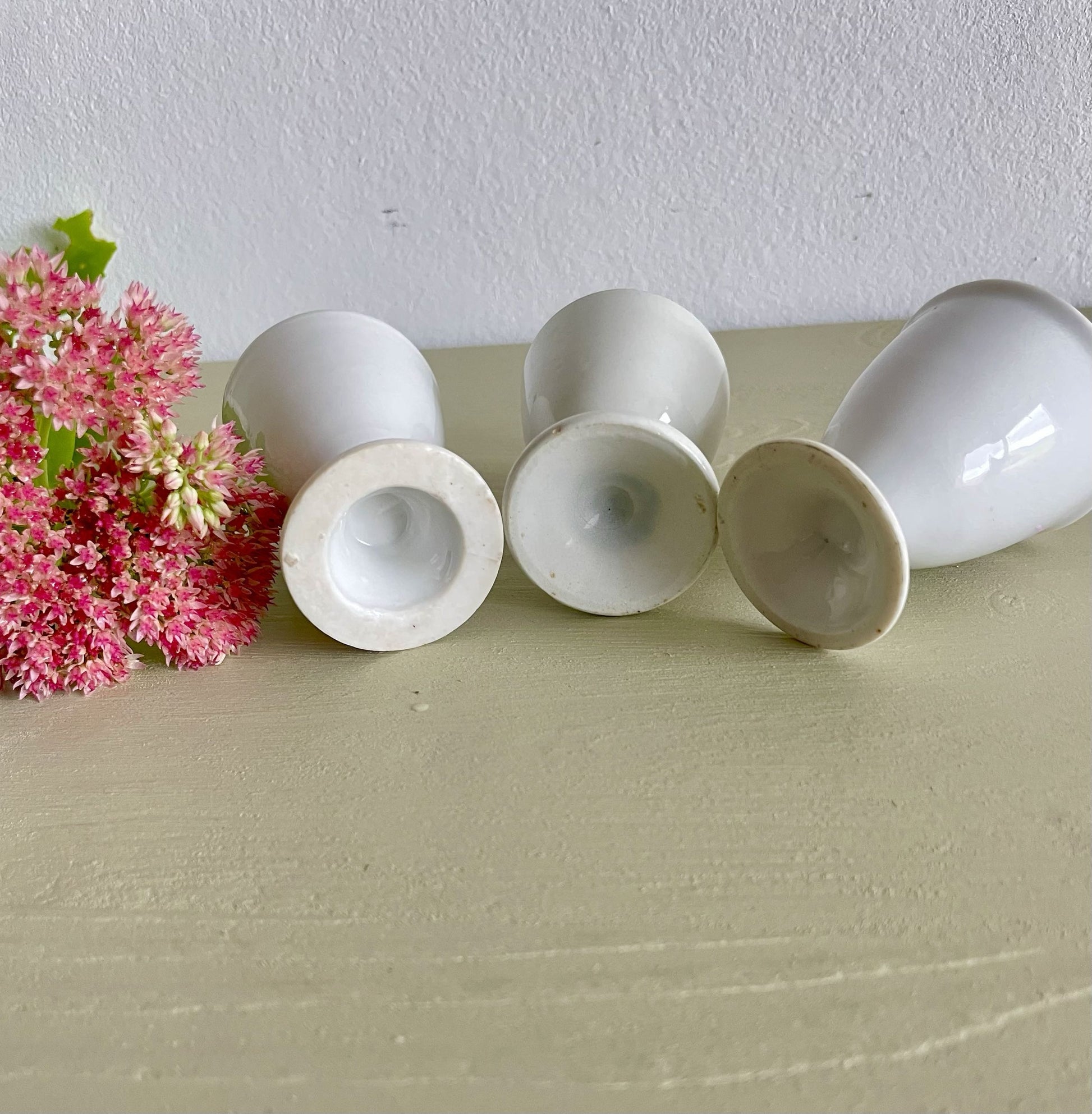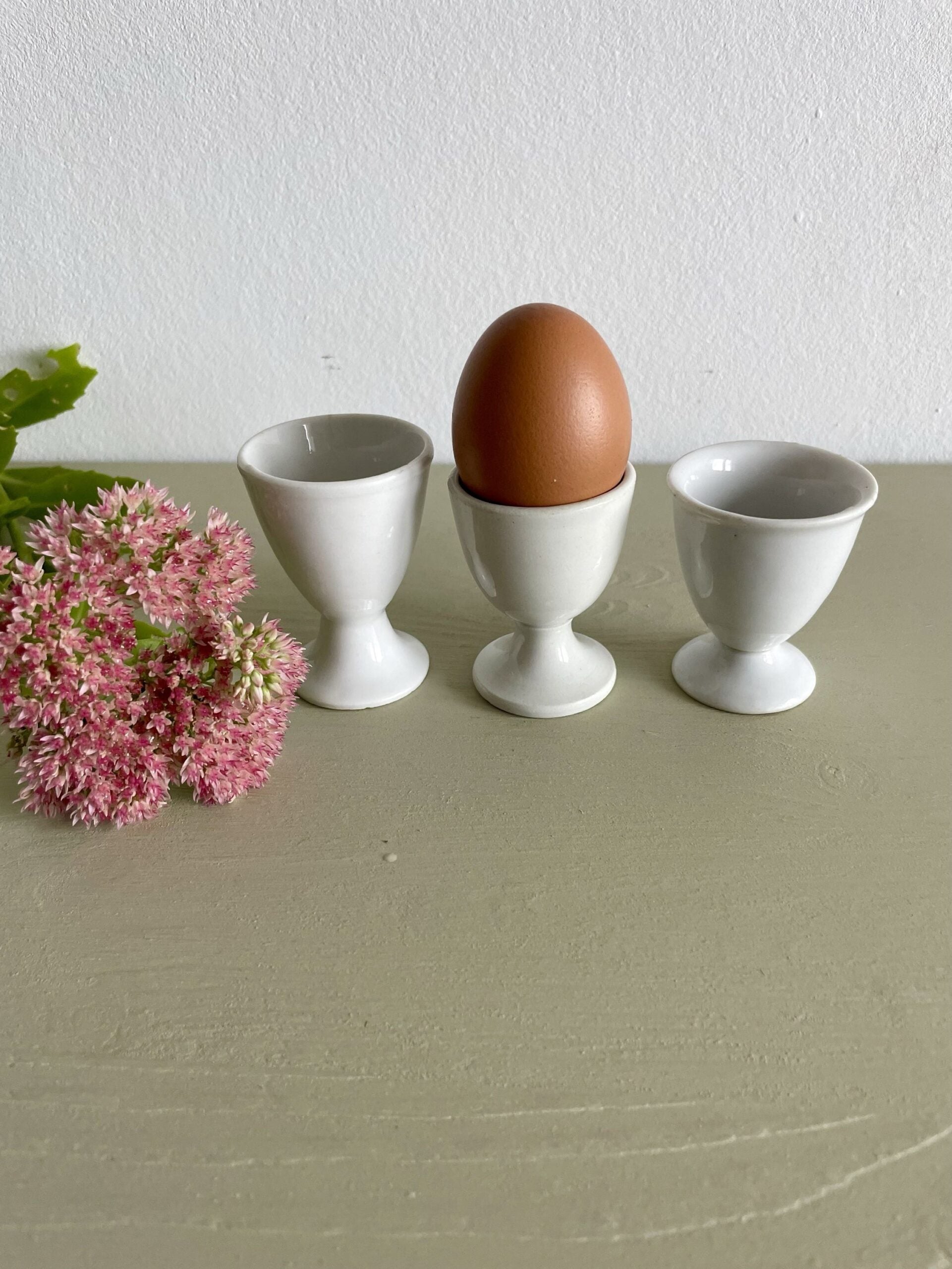 Lot de 3 coquetiers vintage en faïence blanche, simples et faciles à associer à une vaisselle ancienne ou plus contemporaine. Parfaits pour le petit-déjeuner ou un brunch, ils complètent une table avec discrétion.
