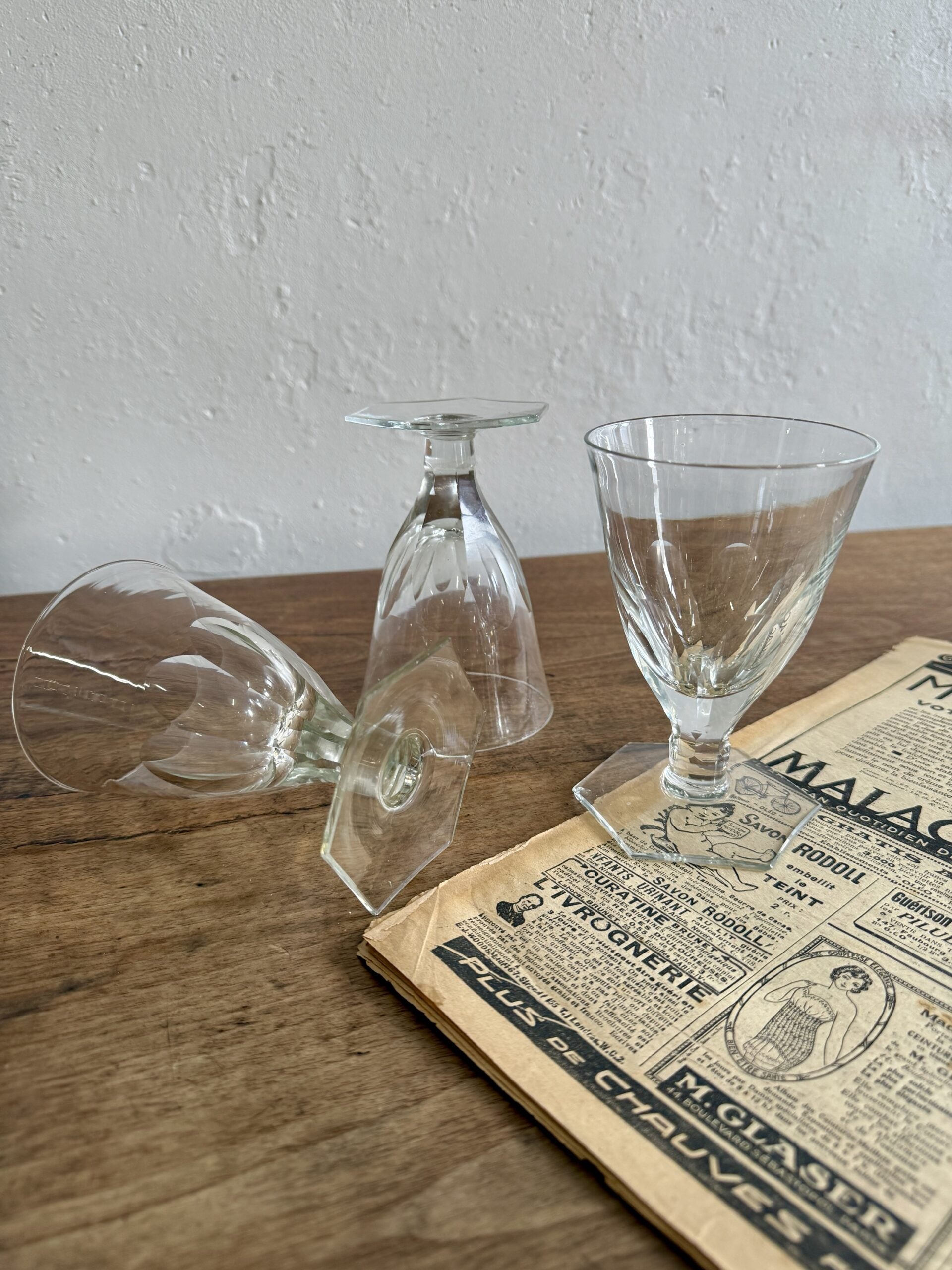 Lot de 3 verres en cristal ancien qui sent bon la brocante et les belles tables d’autrefois. Cristal fin légèrement travaillé, transparence lumineuse : ce petit trio a tout pour plaire aux amoureux de vaisselle vintage et d’objets authentiques.Deux des verres présentent de très légers impacts à l’intérieur du cristal, au niveau du pied — rien qui n’altère l’utilisation ni le plaisir de s’en servir. Au contraire, ces petites marques racontent leur histoire et rappellent qu’il s’agit de véritables pièces anciennes.