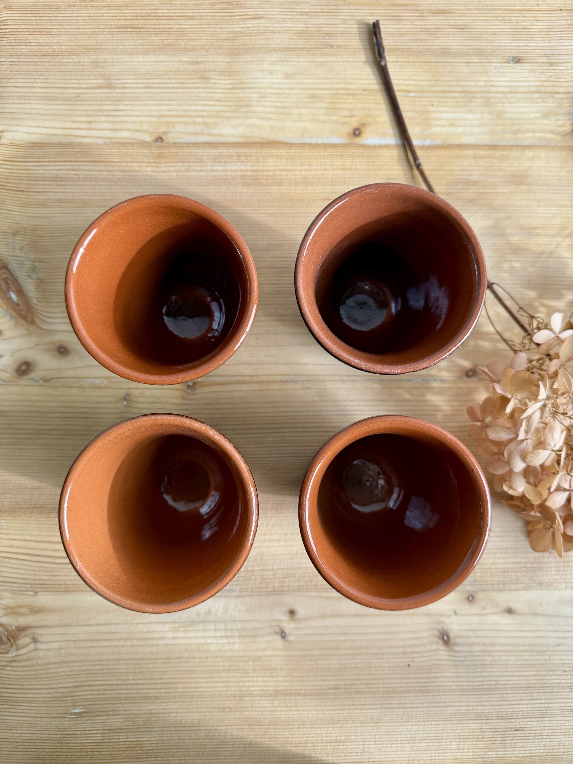 Lot de 4 tasses en terre cuite avec un émail transparent. Leur forme simple et naturelle permet de les utiliser au quotidien pour le café, le thé ou d’autres boissons chaudes.