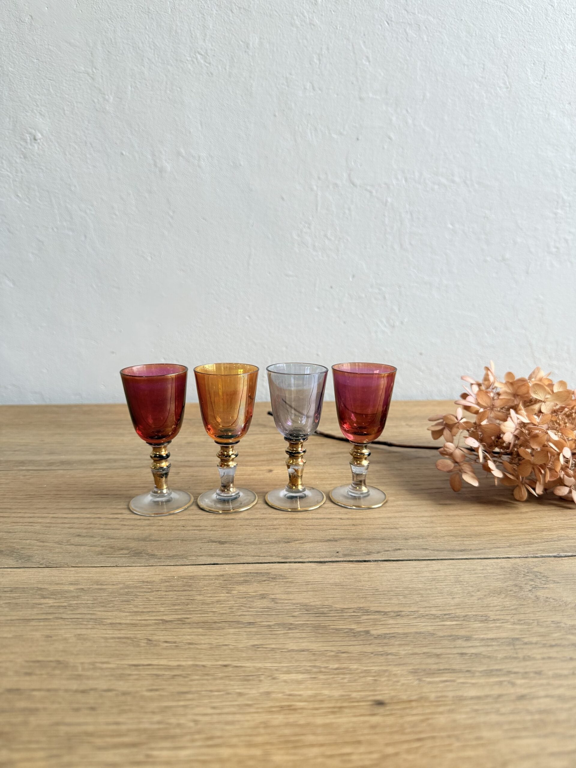 Lot de 4 petits verres à digestif ou liqueur au style vintage et élégant.