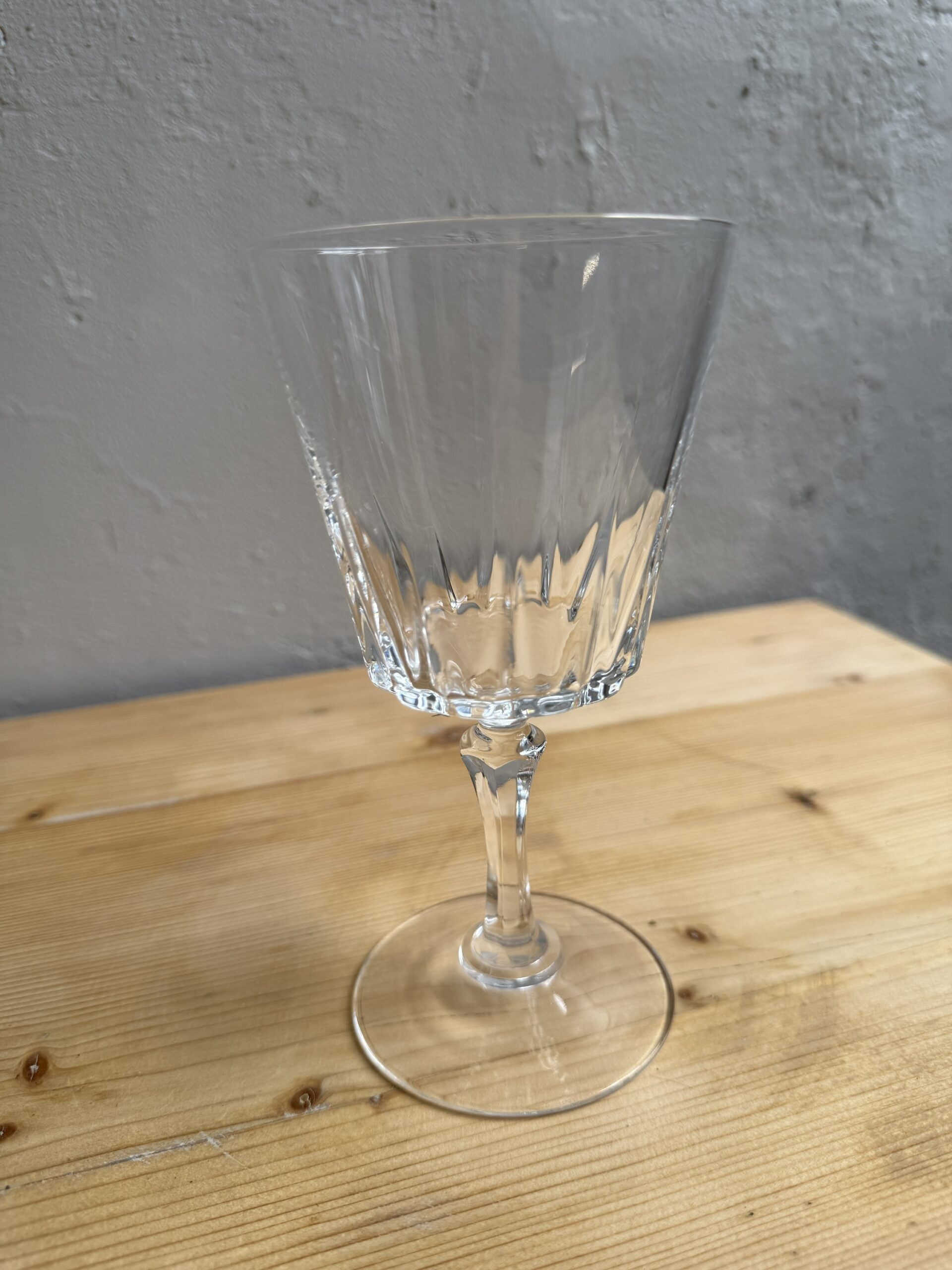 Lot de 4 verres à pied en cristal transparent, décorés d’un motif dentelé qui leur donne un relief simple et élégant. Leur taille les rend adaptés au service du vin, de l’eau ou d’autres boissons à table.