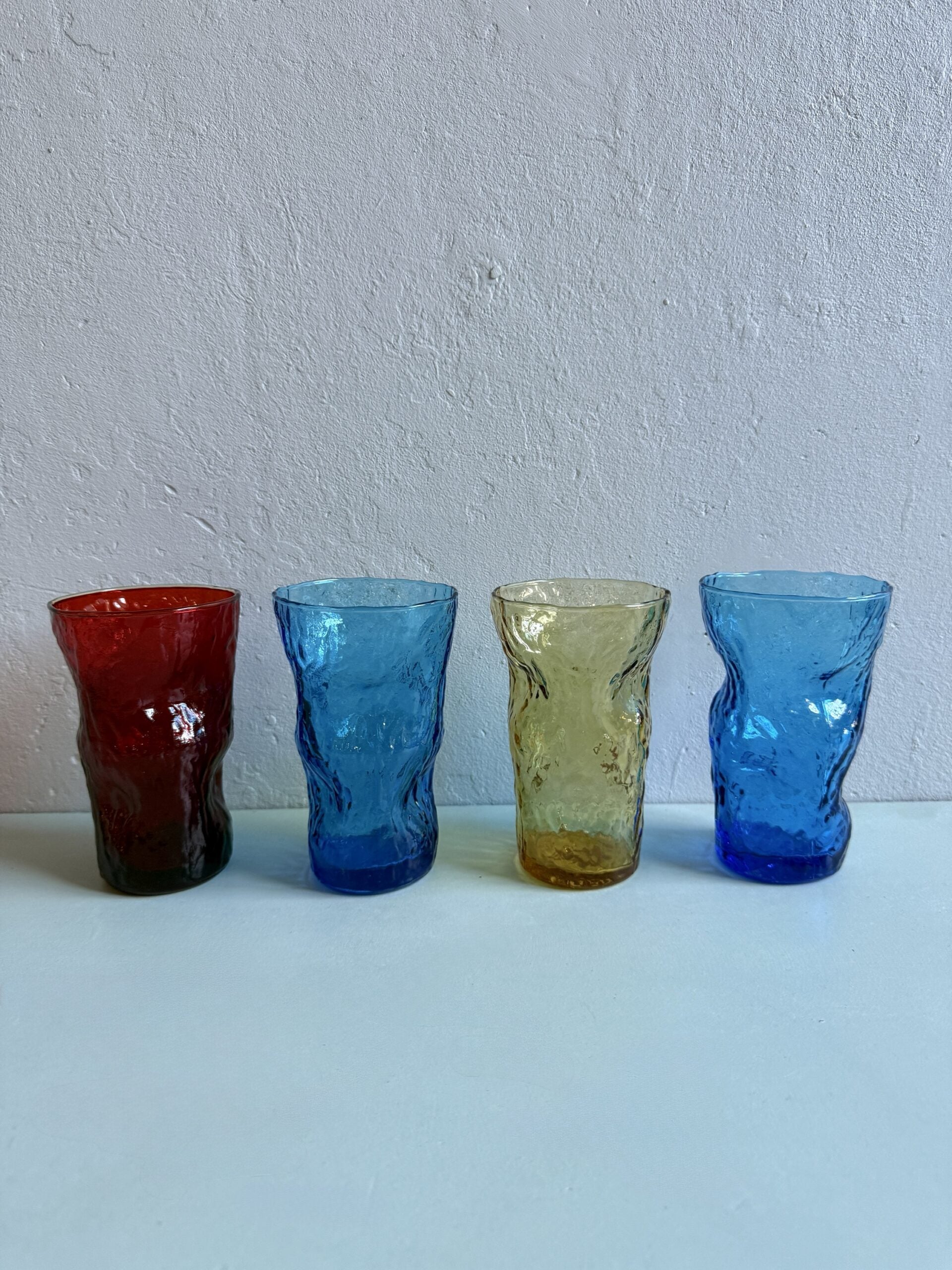 Ensemble de 4 verres anciens aux formes irrégulières, chacun présentant une couleur différente : deux bleus, un rouge et un jaune. Leur forme leur donne un aspect singulier et apporte une touche ludique à la table.