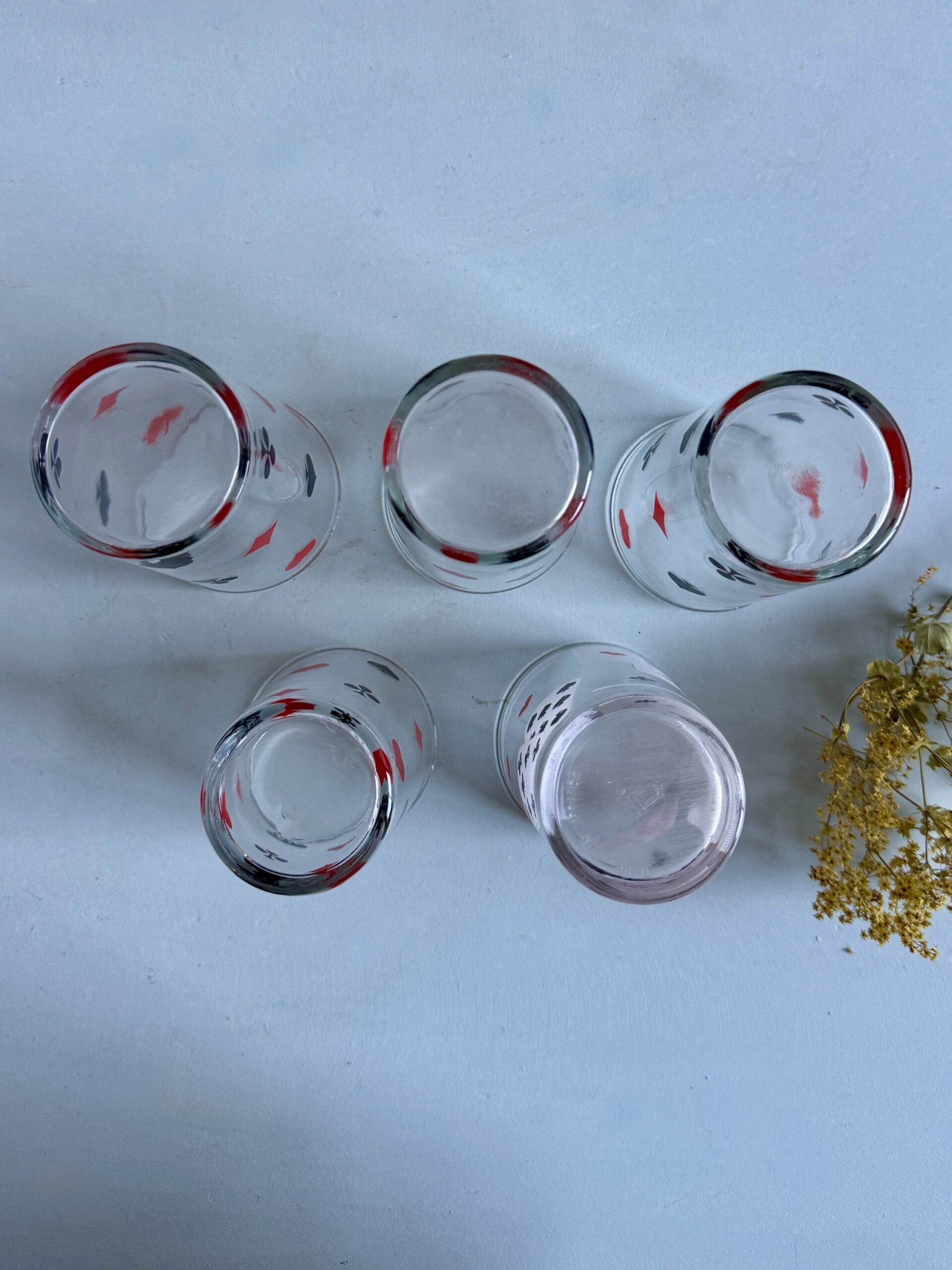 Ensemble de 5 verres anciens décorés de symboles de jeux de cartes : trèfle, pique, carreau et cœur. Plusieurs verres présentent des dimensions légèrement différentes, ce qui en fait un lot varié et original.