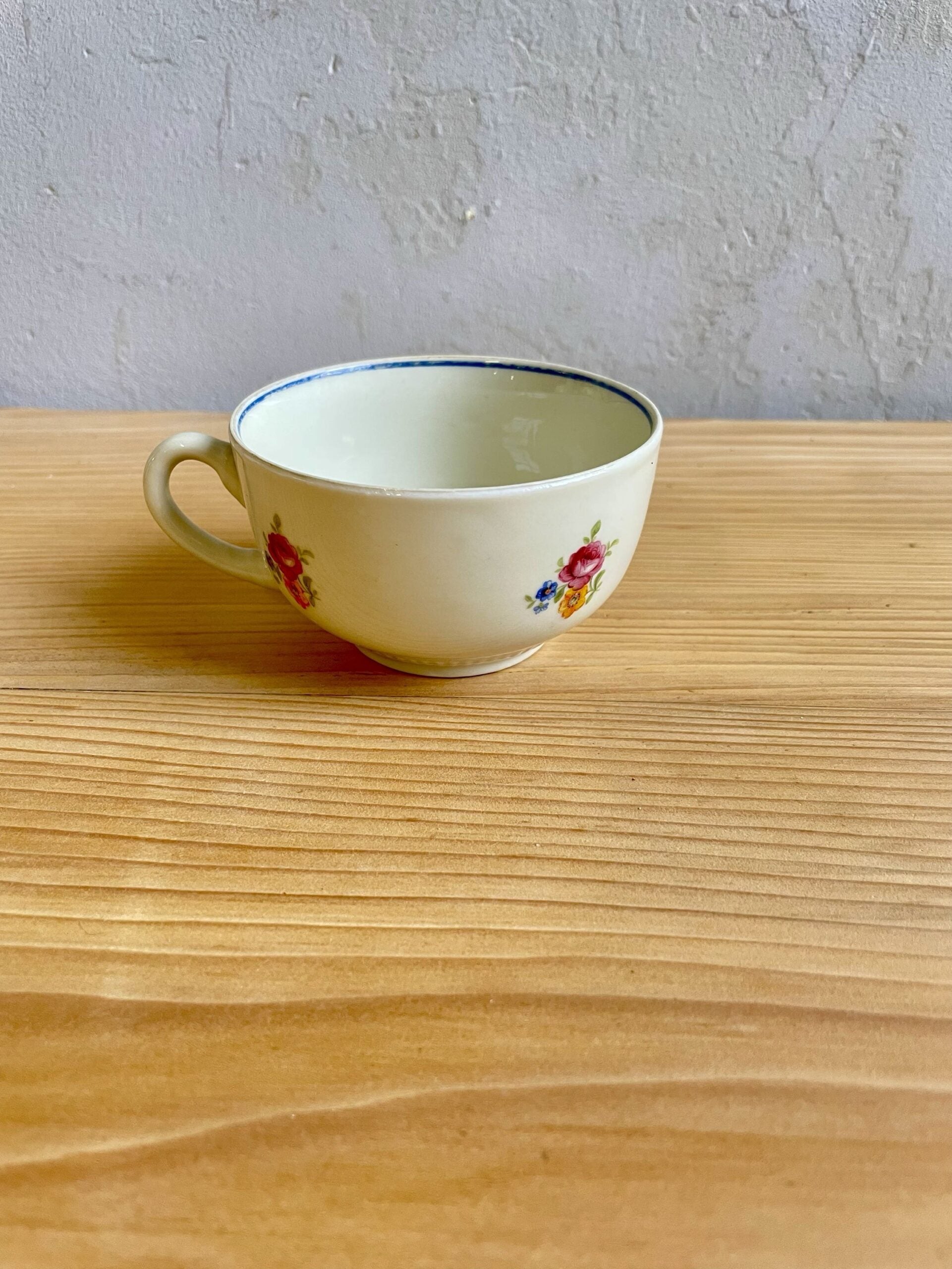 À associer avec la théière, le pot à lait, le plat à cake et les assiettes à dessert de la même collection pour créer un service harmonieux. Ces tasses anciennes peuvent aussi être mixées avec d’autres pièces fleuries dans un esprit brocante.
