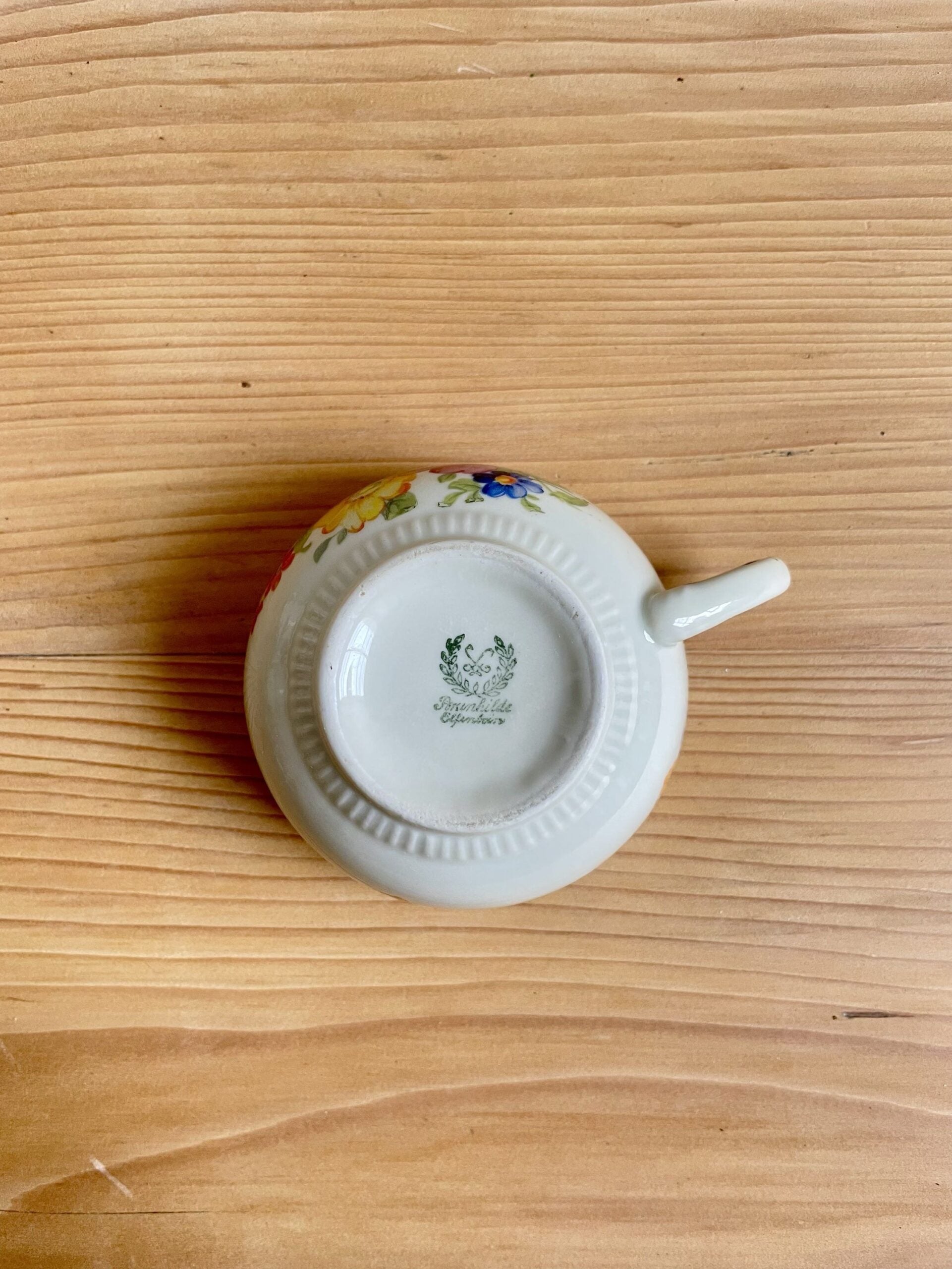 Lot de 6 tasses vintage Brunhilde Effenheim, décorées d’un motif fleuri délicat souligné d’un liseré bleu. Ensemble typique de la vaisselle ancienne idéale pour un café ou un thé servi sur une jolie table.
