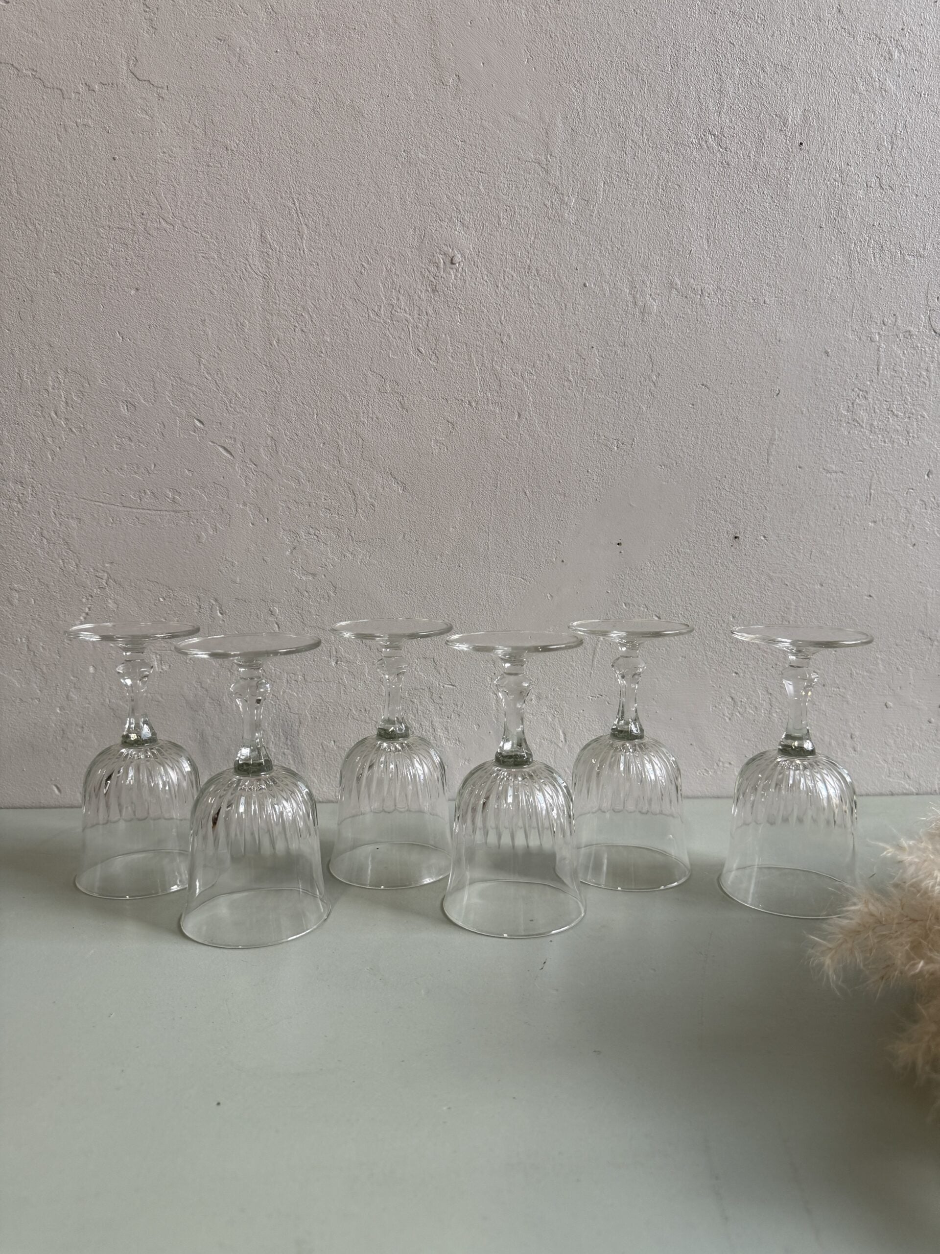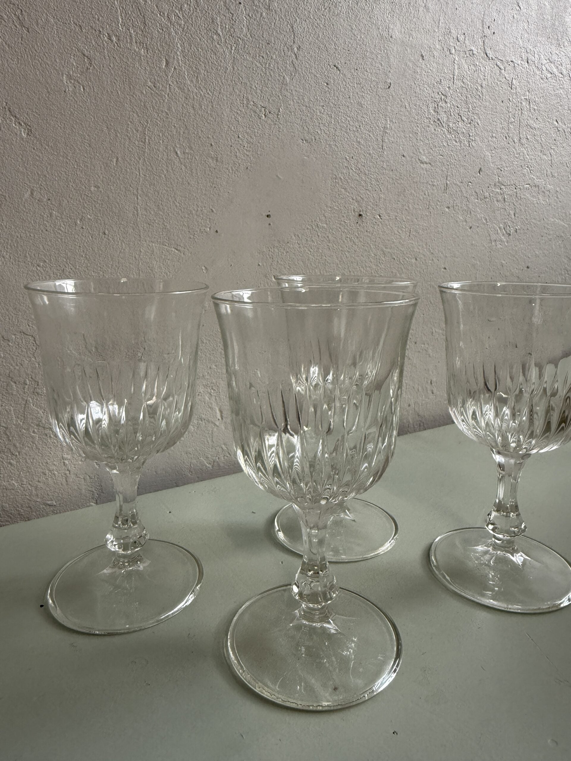 Ensemble de verres vintage en verre transparent, avec coupe travaillée qui accroche la lumière et donne du relief à une table. Série facile à intégrer dans une vaisselle ancienne ou à mixer avec d’autres verres dépareillés esprit brocante.