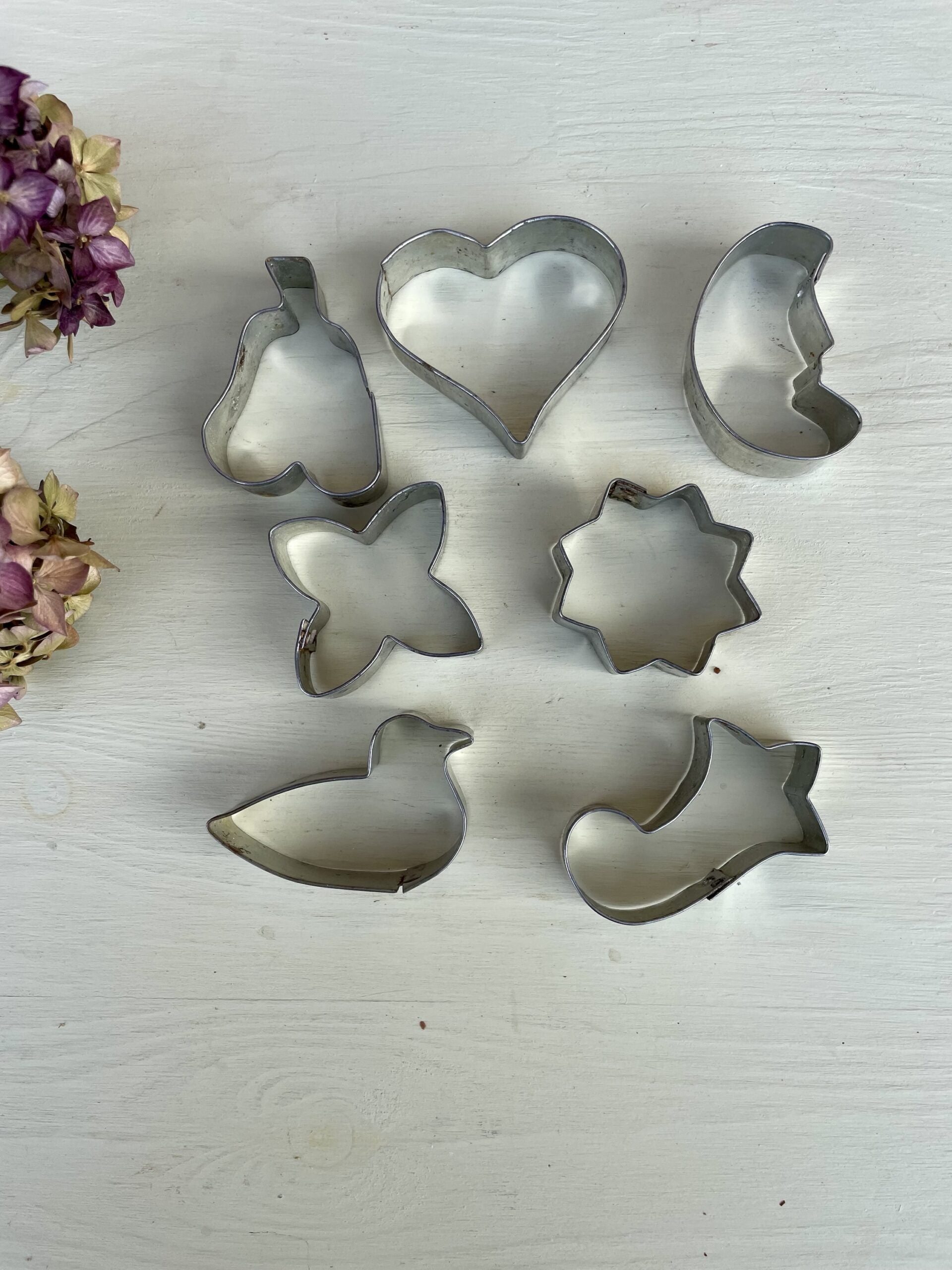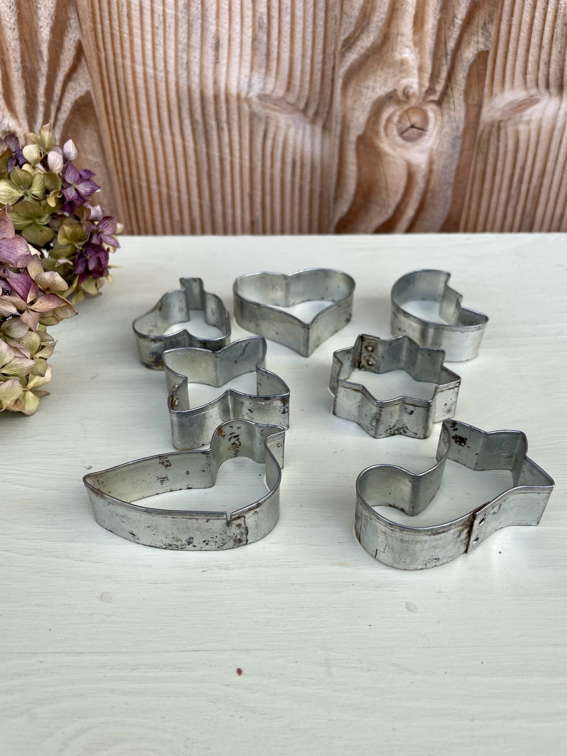 Charmant lot de 7 emporte-pièces anciens en métal, aux formes variées . Ils présentent de légères traces de rouille, qui leur donnent un charme vintage tout particulier. Parfaits pour réaliser de délicieux bredala ou pour être détournés en décoration dans une cuisine au style rétro.