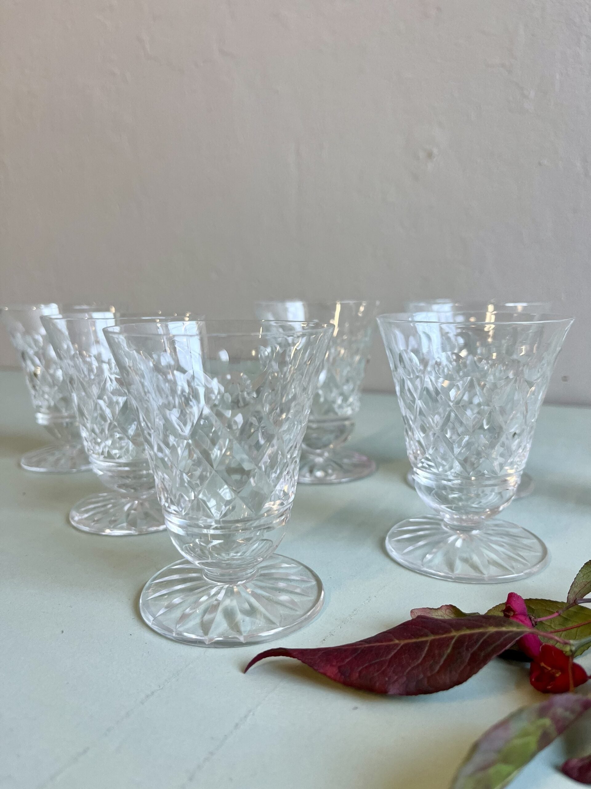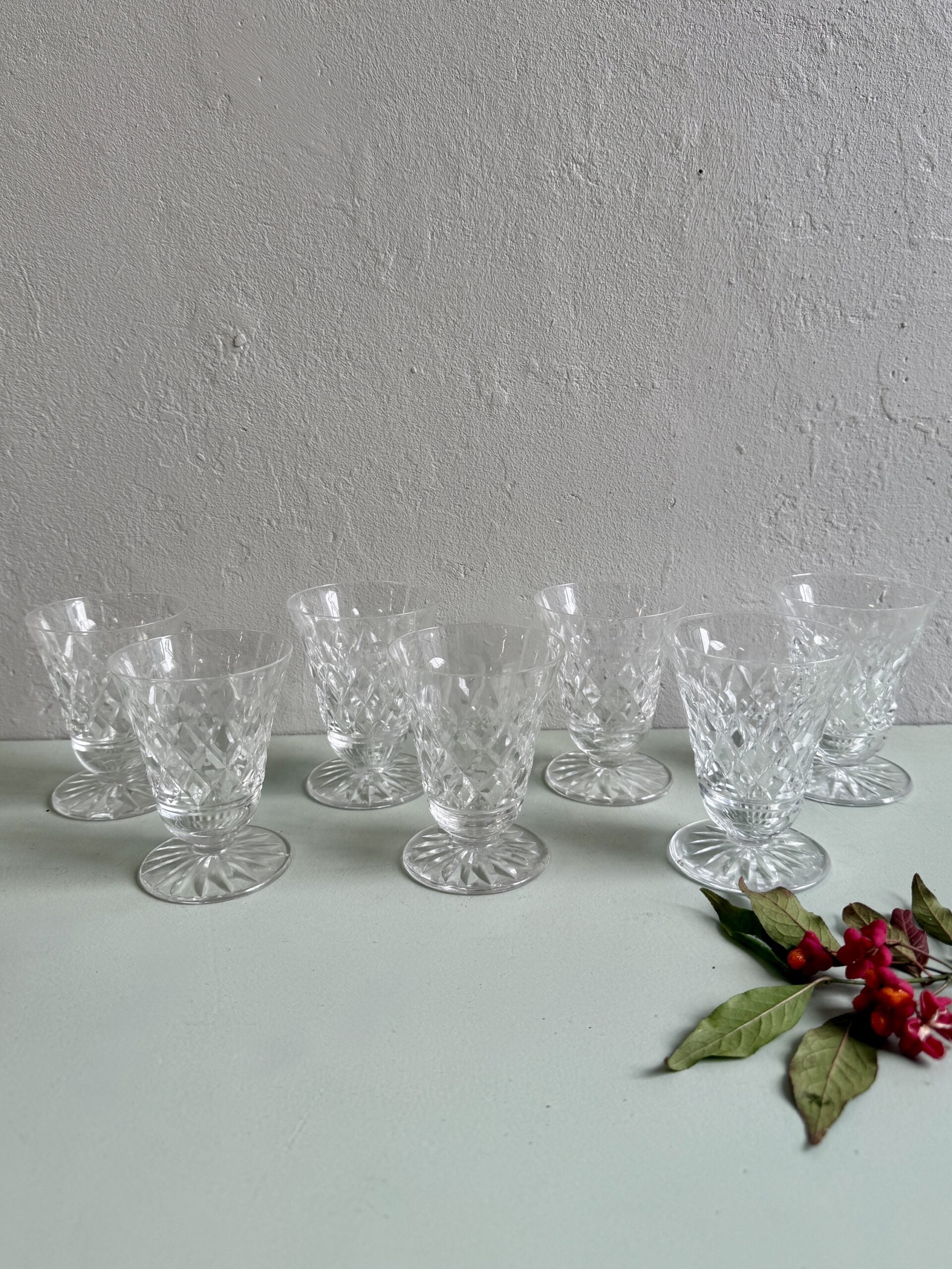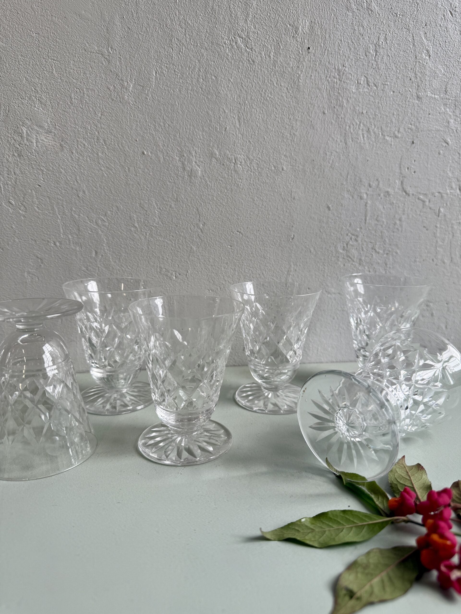 Lot de 7 verres à pied en cristal fin, avec décor ciselé qui capte la lumière et met en valeur le travail du cristal. Leur petite taille les rend parfaits comme verres à liqueur, mais ils peuvent aussi être utilisés pour l’eau ou un apéritif.