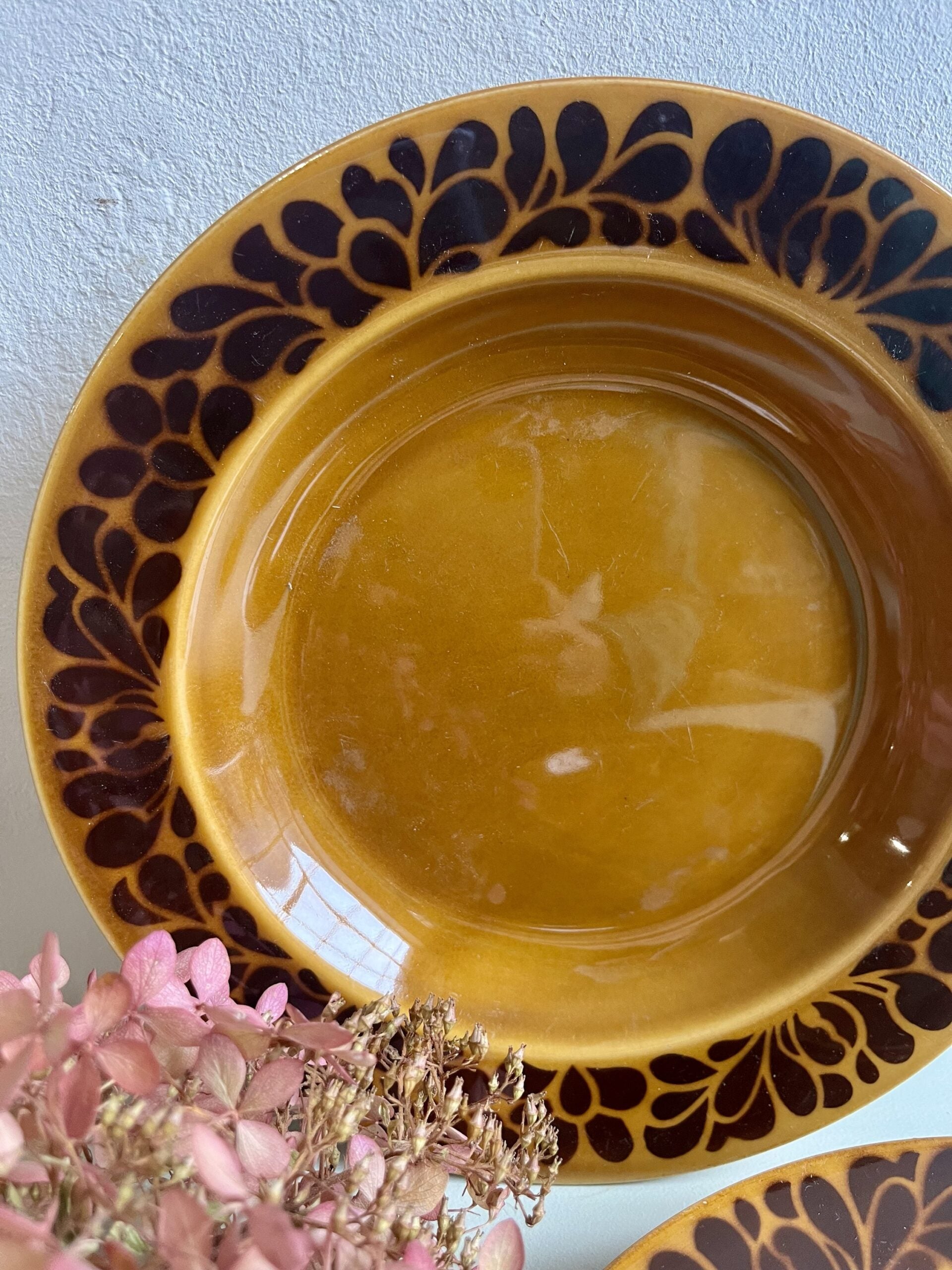 Lot de 8 assiettes creuses vintage Annaburg Sintolan, en jaune émaillé avec motifs typiques des années 70. Ensemble lumineux qui apporte de la chaleur à une table du quotidien ou à une table de fête plus travaillée.