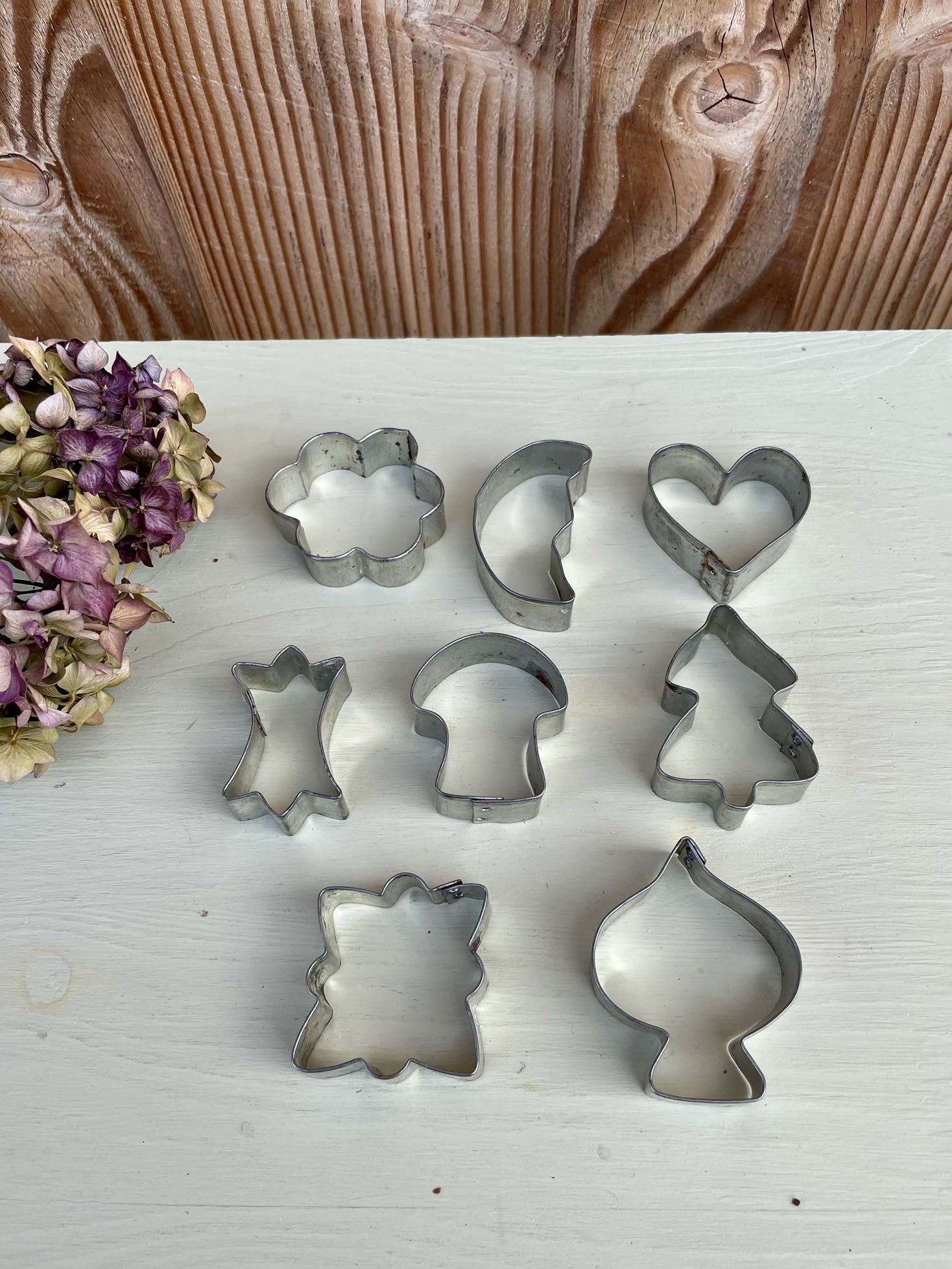 Lot de 8 emporte-pièces anciens en métal, tous de formes différentes (env. 5/6 cm). Leur patine et leurs traces d’usage racontent leur histoire et leur confèrent une belle authenticité. À utiliser pour préparer de jolis bredala de Noël ou à exposer comme éléments déco dans un esprit campagne/atelier.