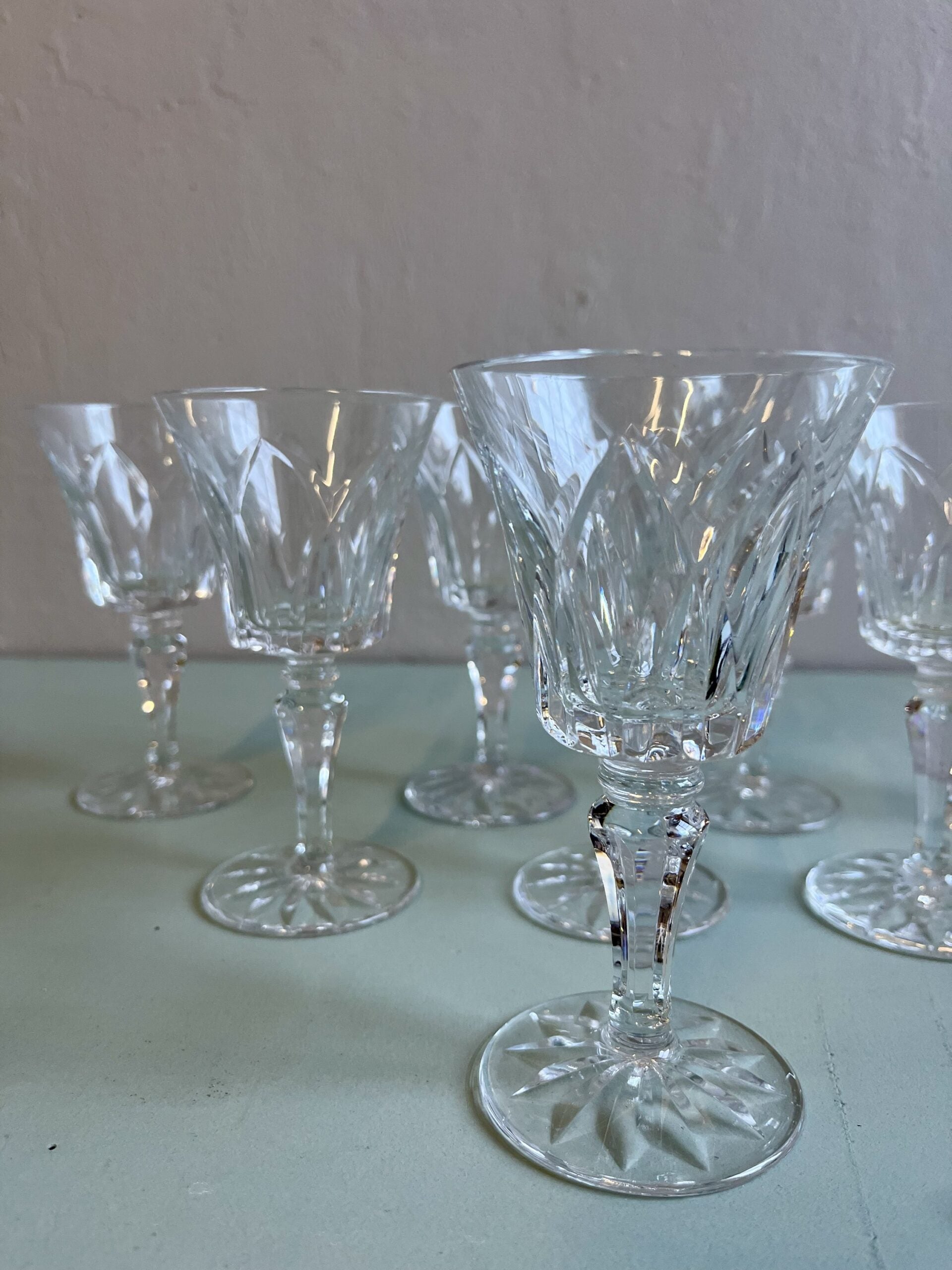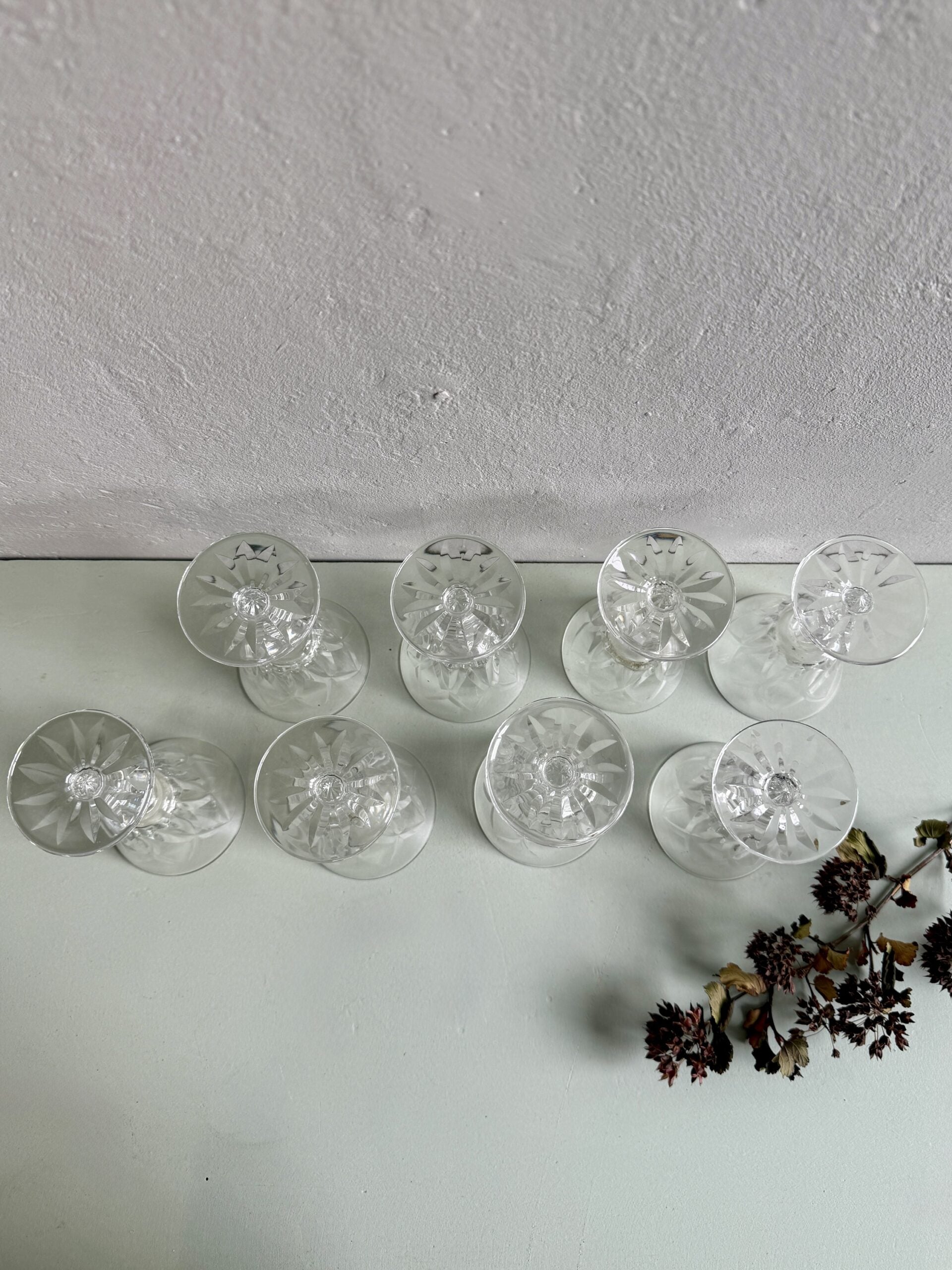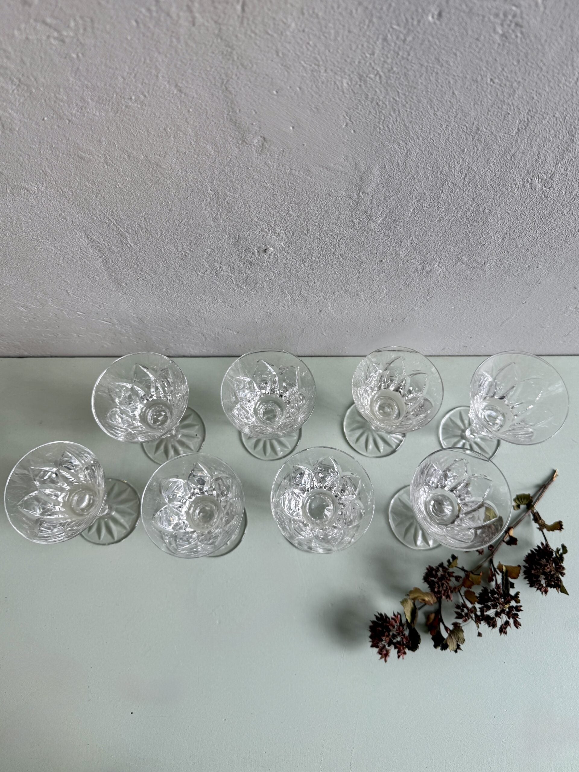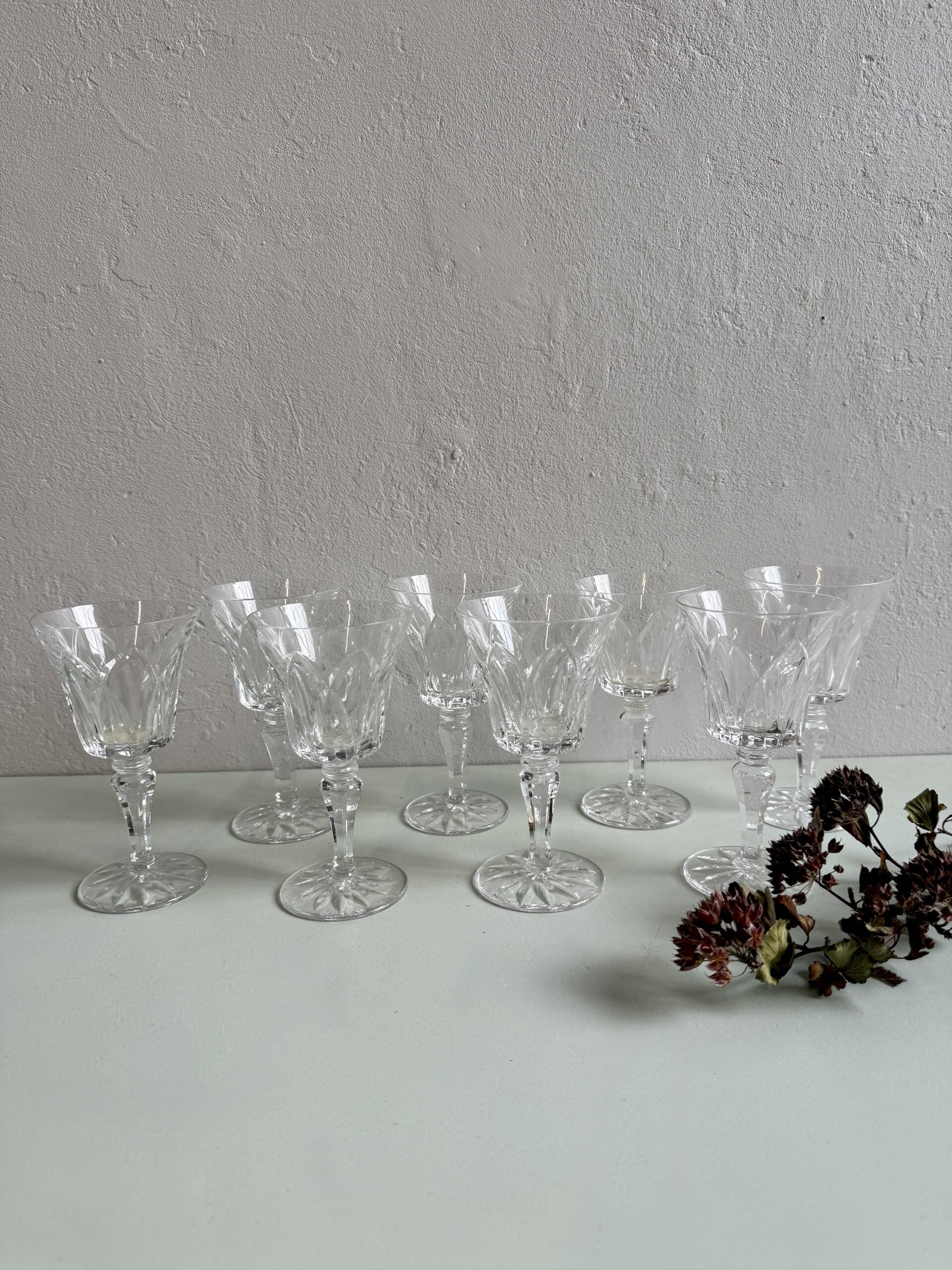 Lot de 8 verres à pied en verre transparent avec décor ciselé. Ensemble classique qui apporte du relief à une table, que ce soit pour un repas du quotidien ou une table de fête.